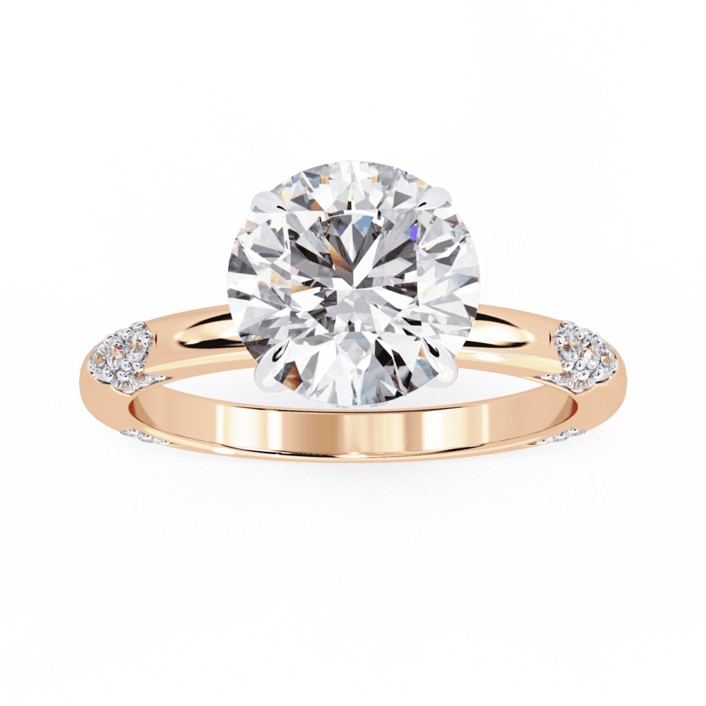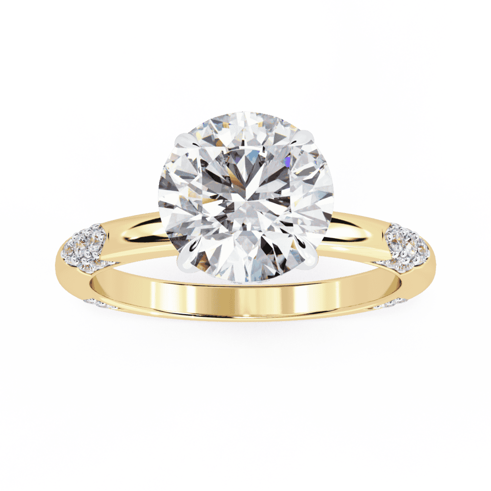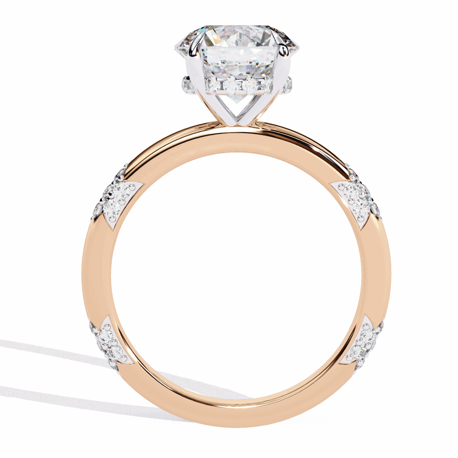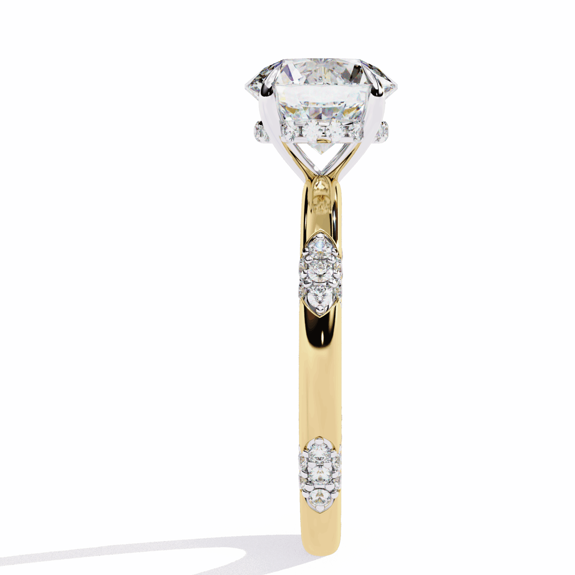 A round lab-grown diamond surrounded by 45 halo accent diamonds totaling 2.85 carats. The halo amplifies the round’s natural brilliance.