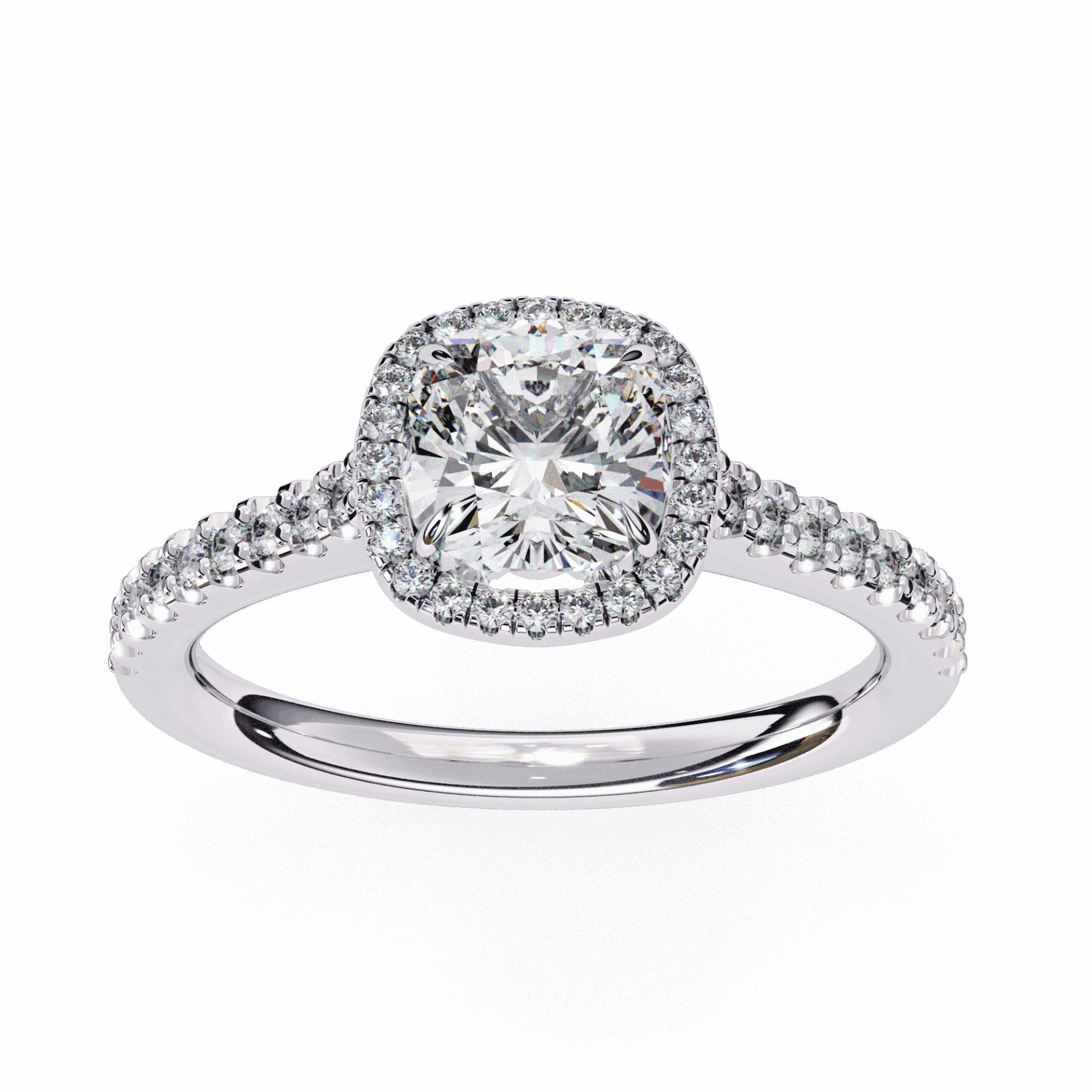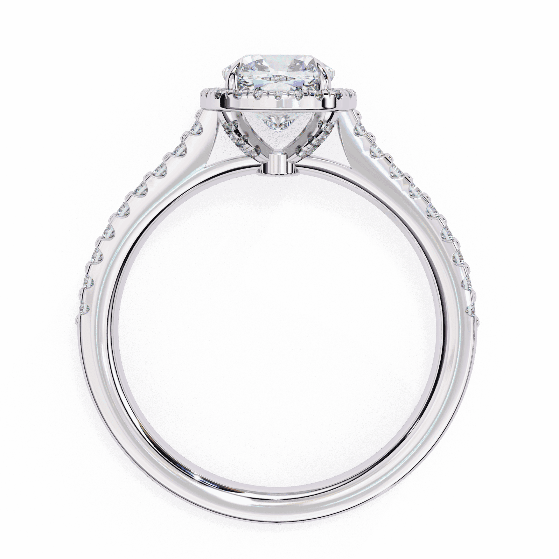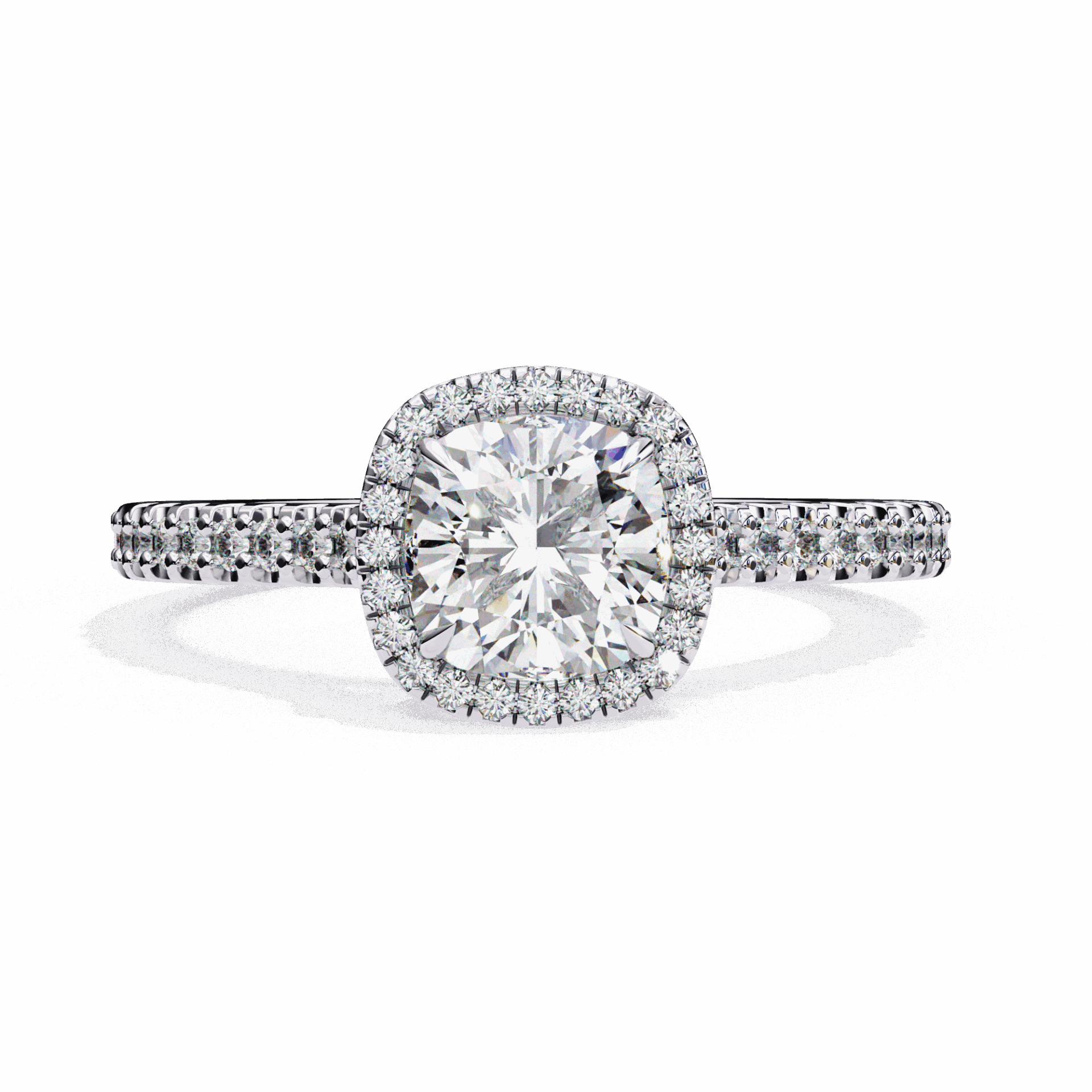 The hidden halo adds sparkle from every angle while keeping the cushion solitaire silhouette pure.