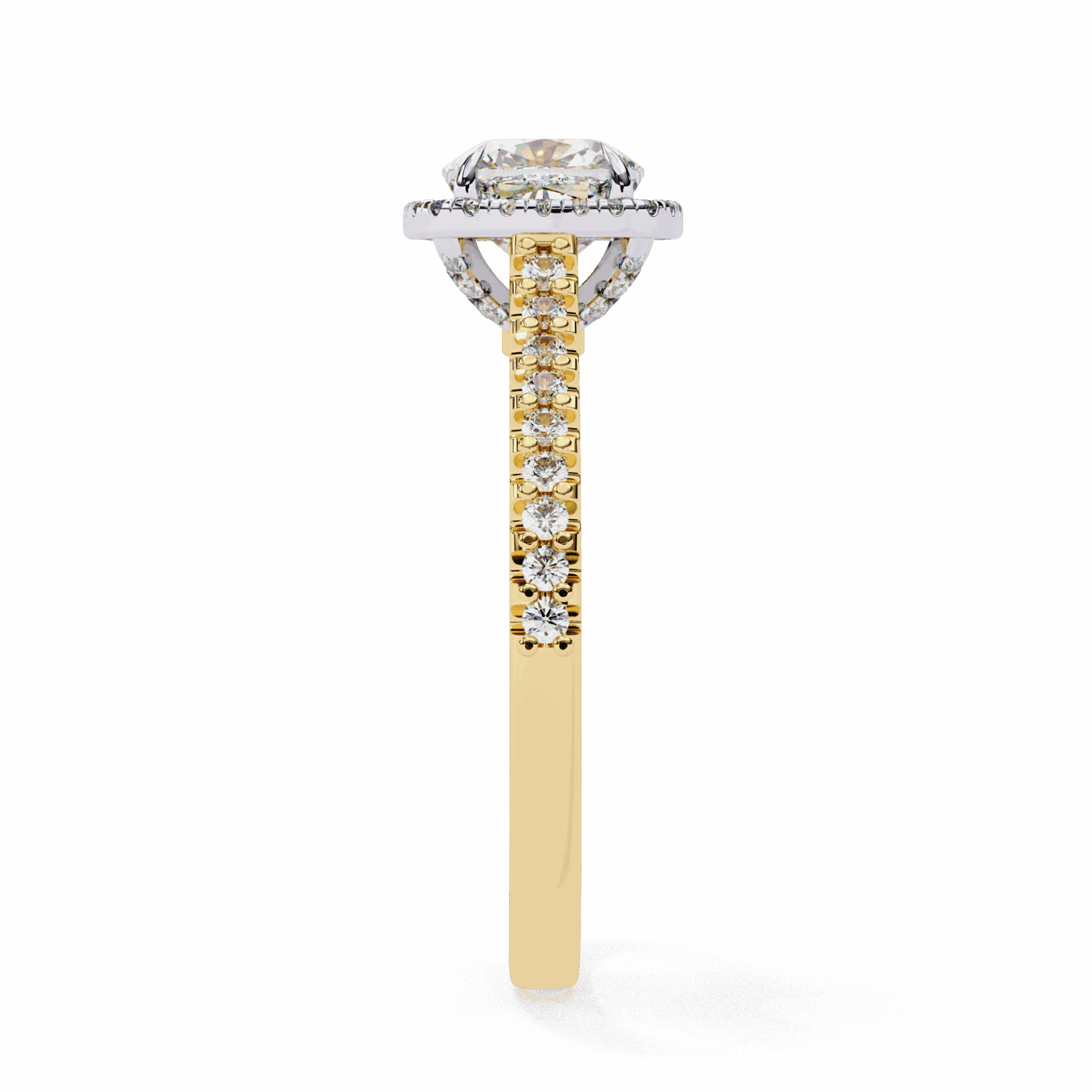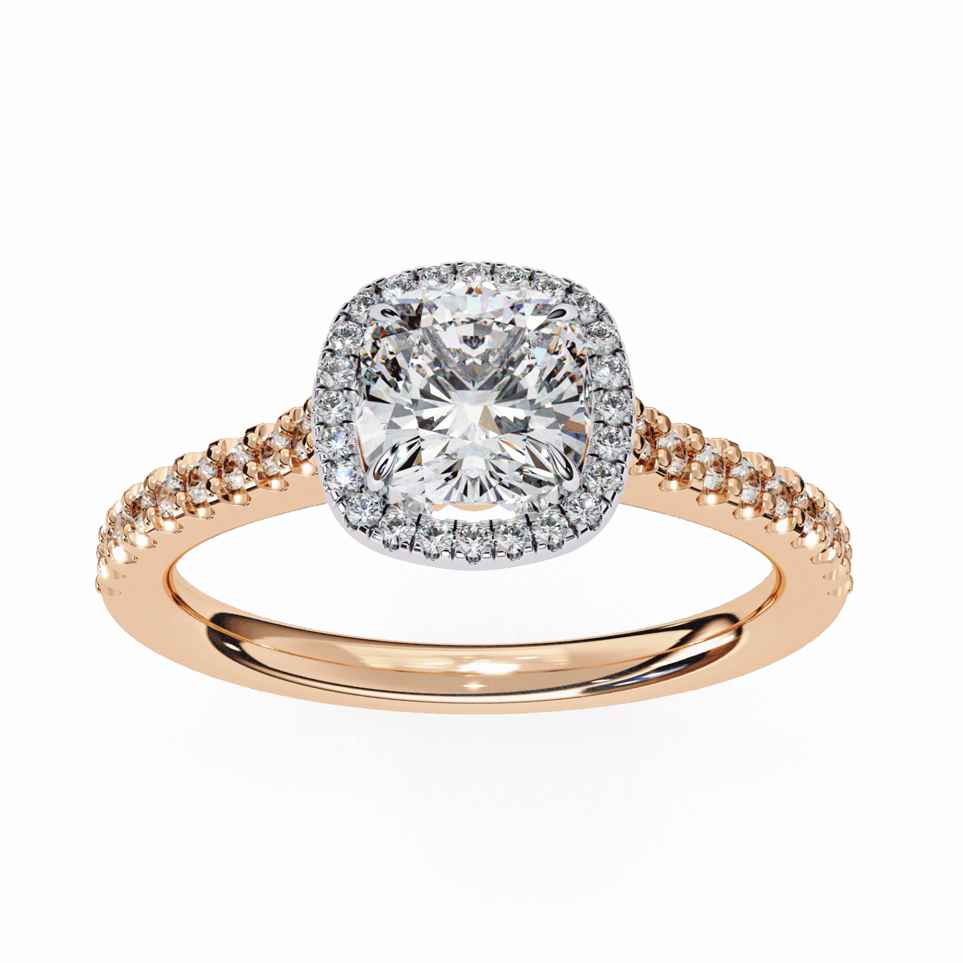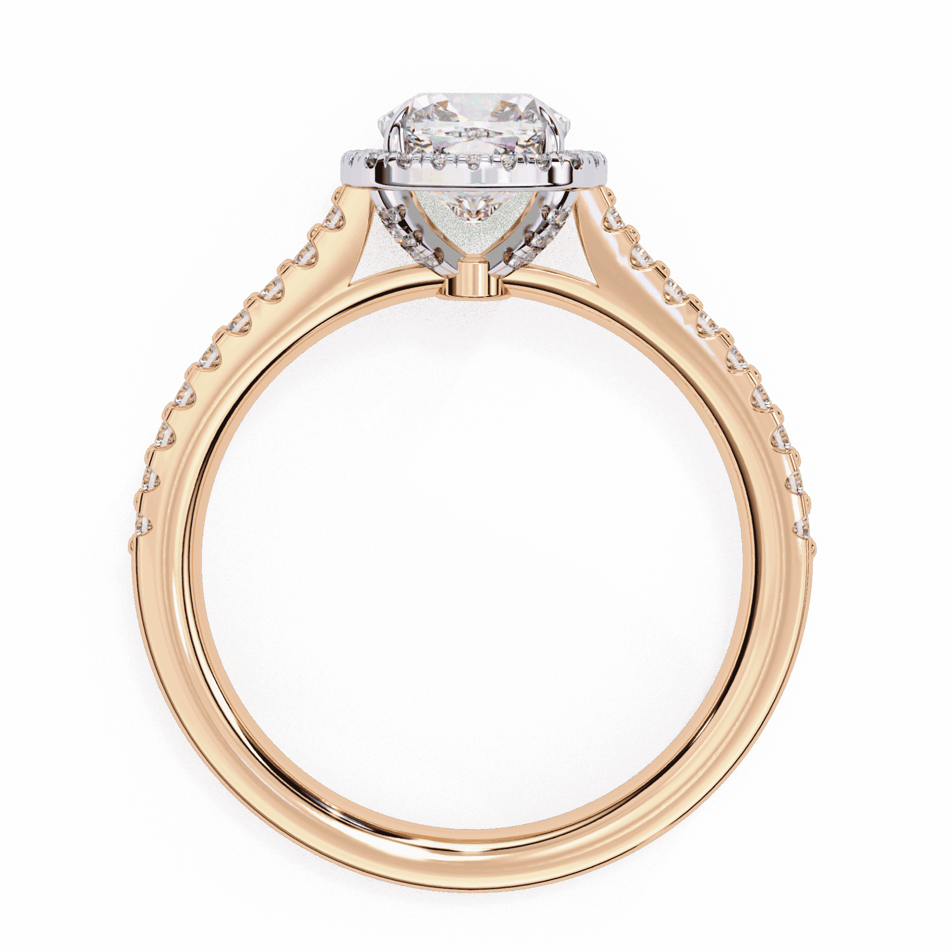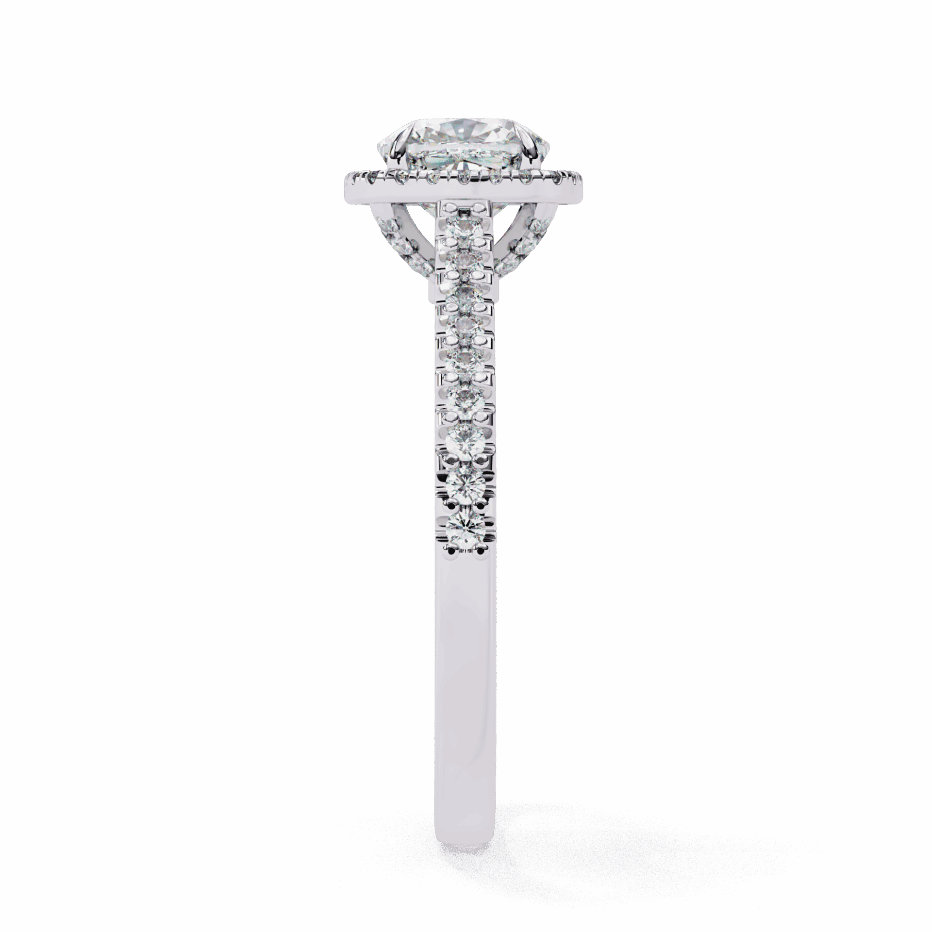 The hidden halo adds sparkle from every angle while keeping the cushion solitaire silhouette pure.