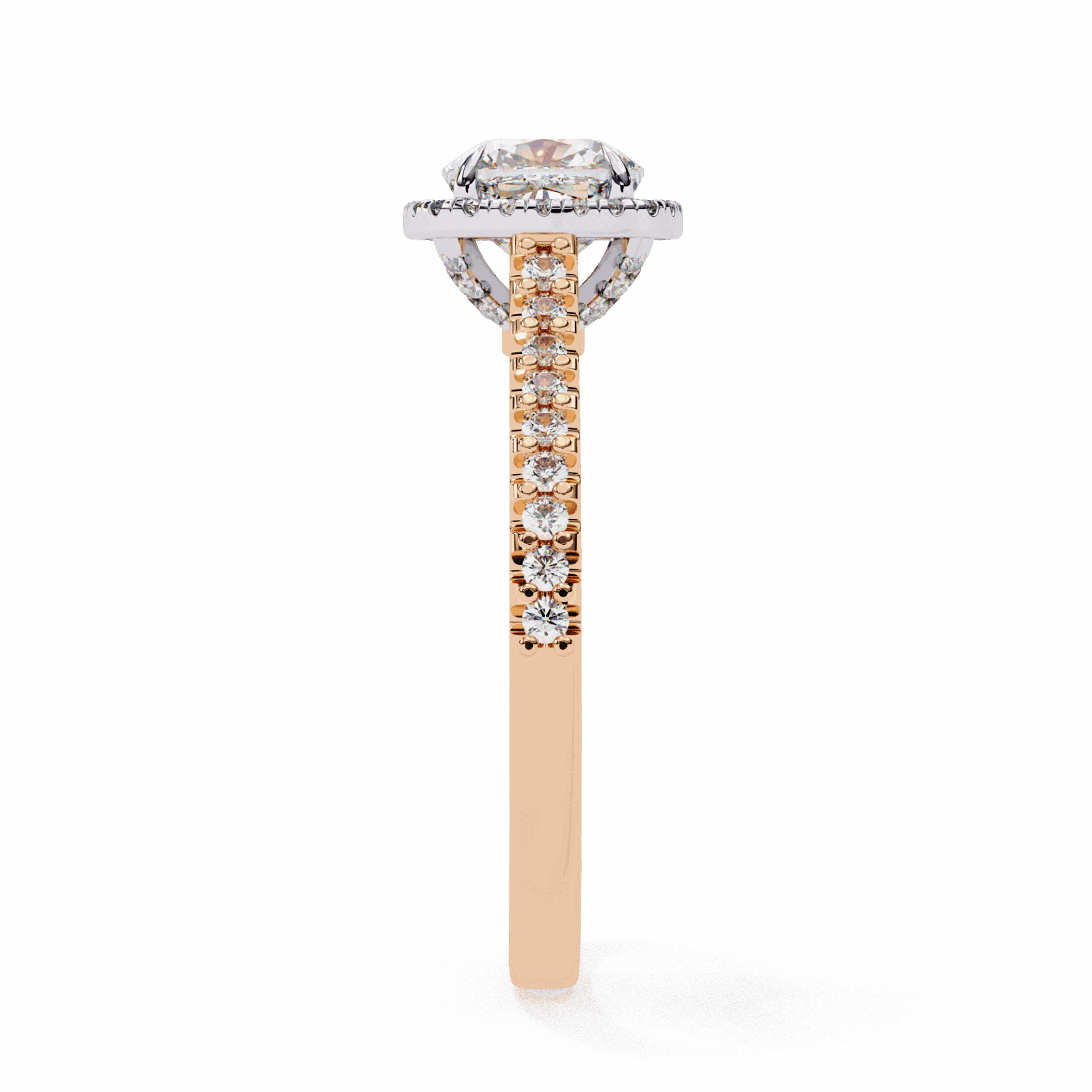 A cushion-cut lab-grown diamond with 51 accent diamonds totaling 2.11 carats, including a hidden halo beneath. Vintage glow with secret brilliance.