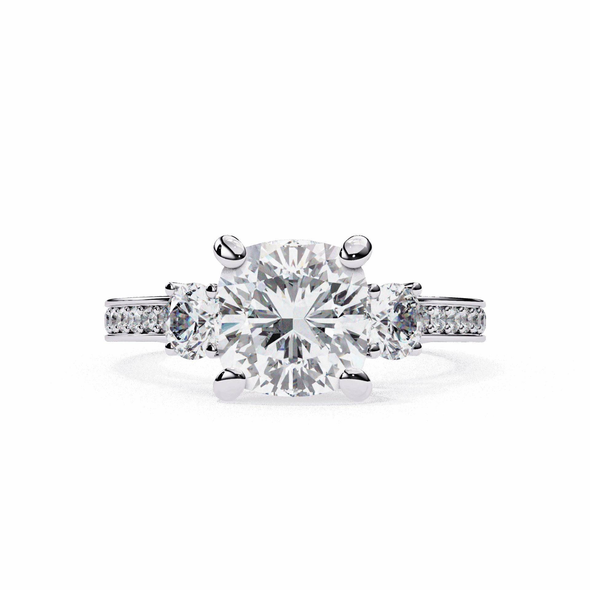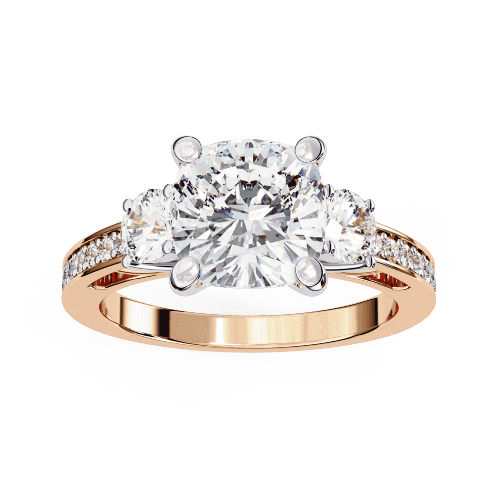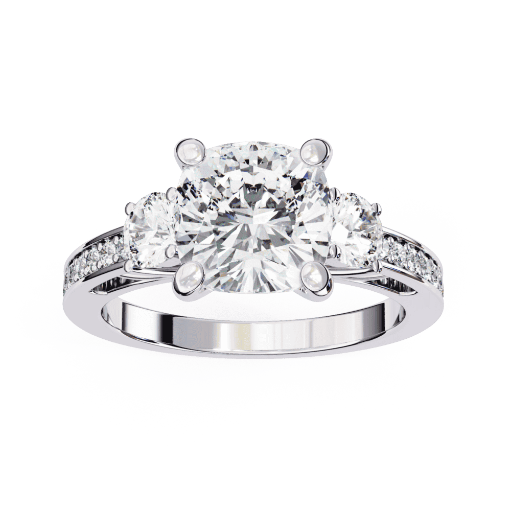 A princess-cut lab-grown diamond with 19 accent diamonds totaling 3.3 carats in a three-stone setting. Geometric symbolism at statement scale.