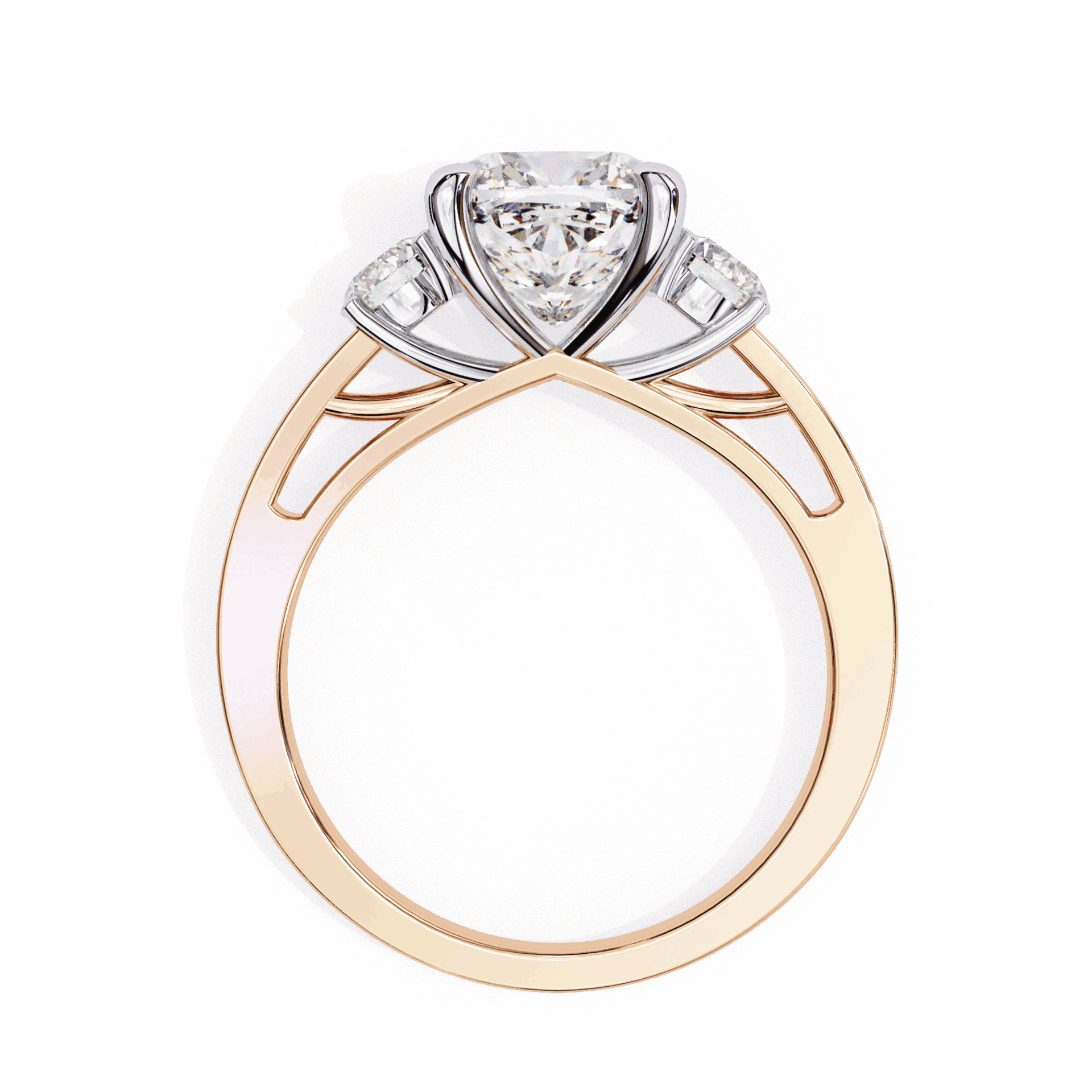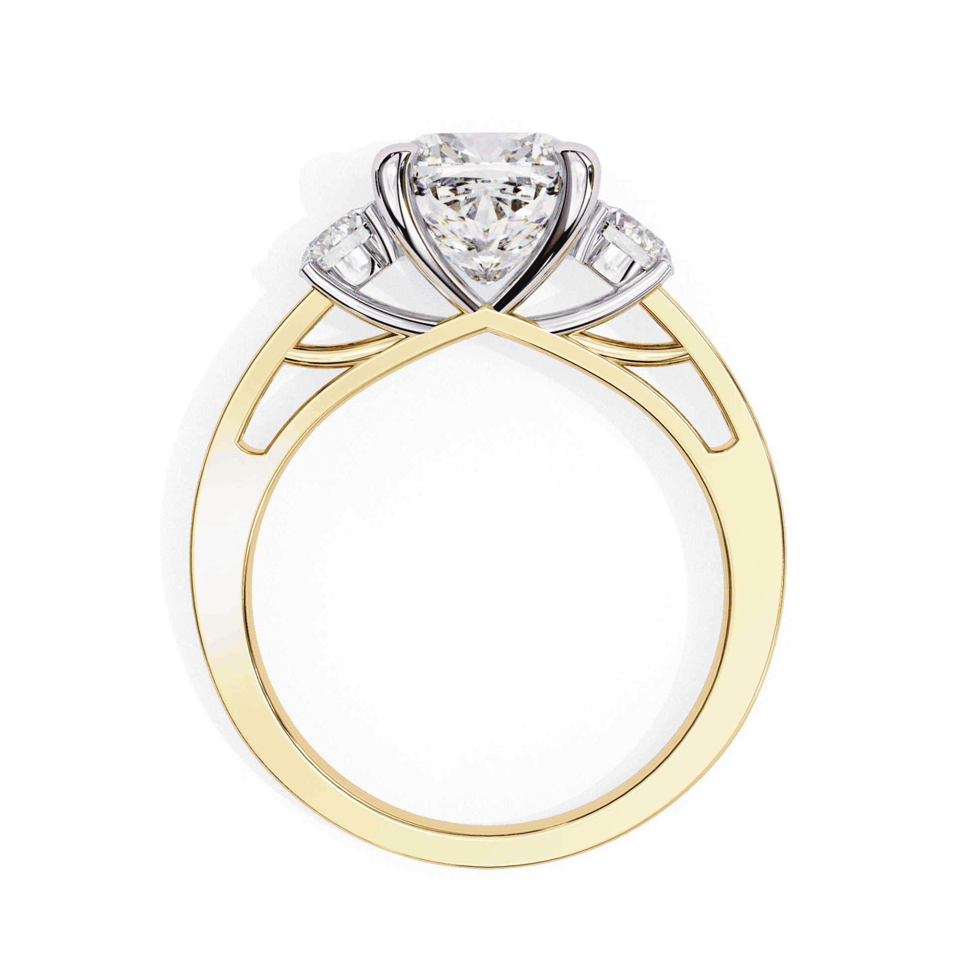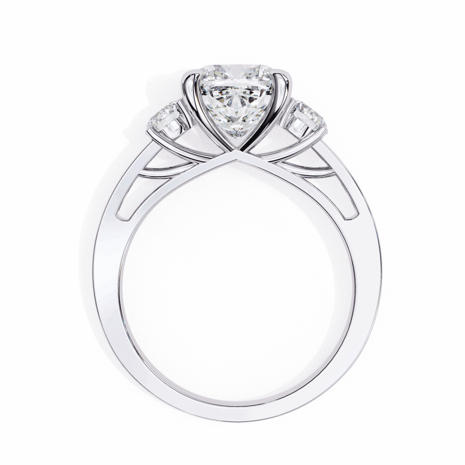 One princess center with two accent stones. Angular symbolism at scale.
