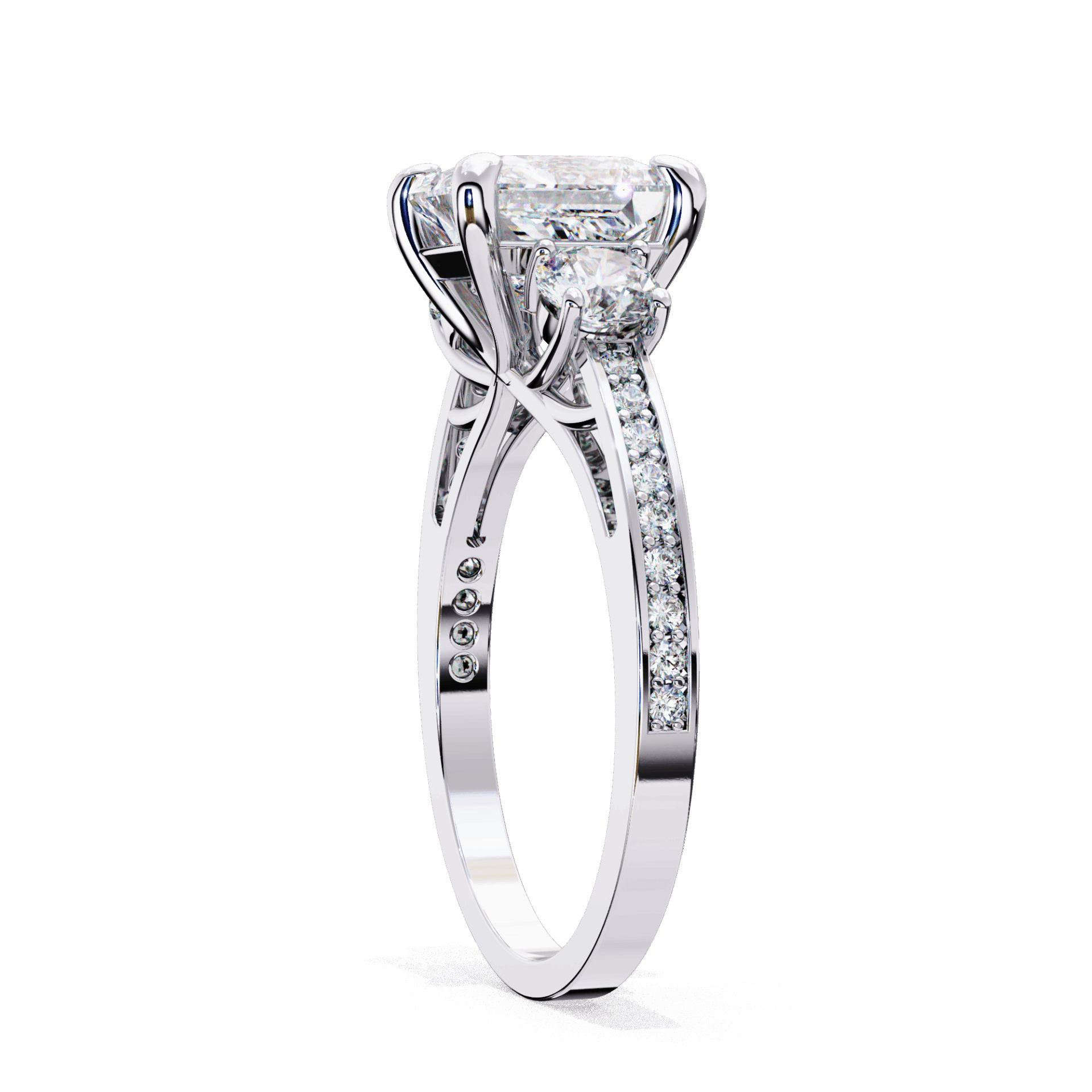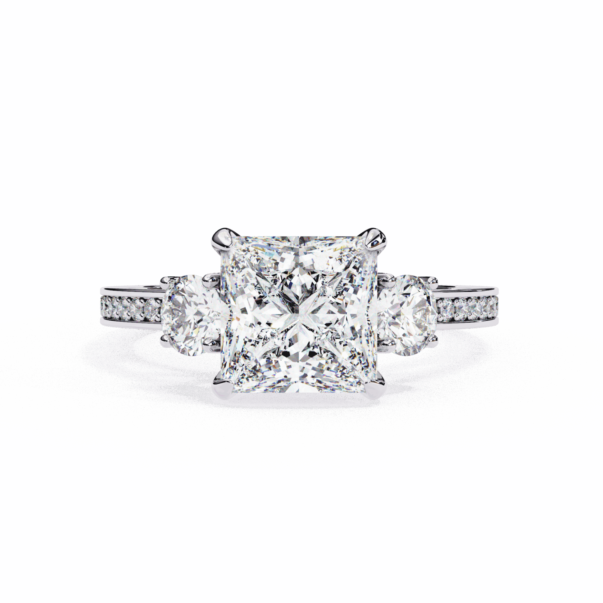 A princess-cut lab-grown diamond with 19 accent diamonds totaling 3.3 carats in a three-stone setting. Geometric symbolism at statement scale.