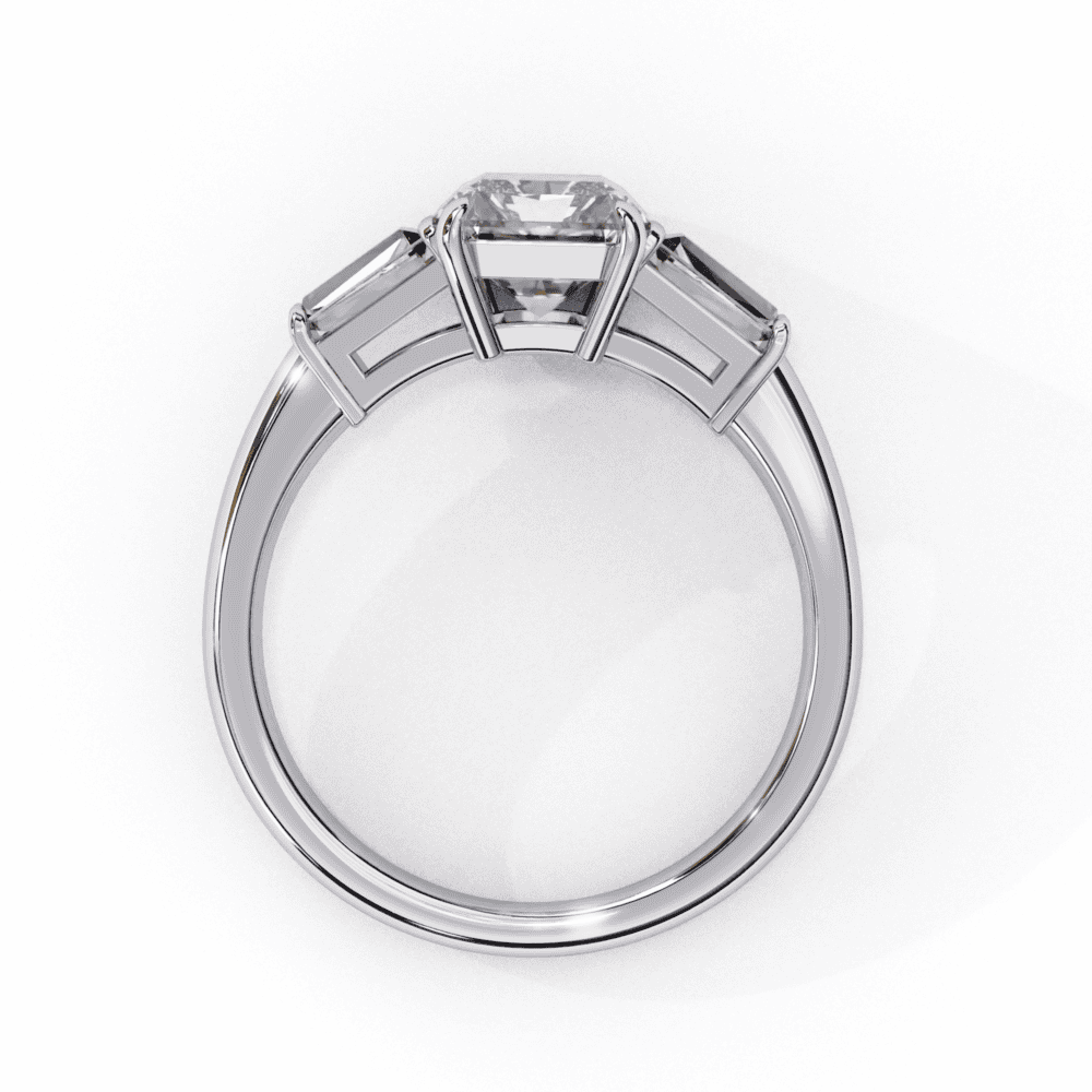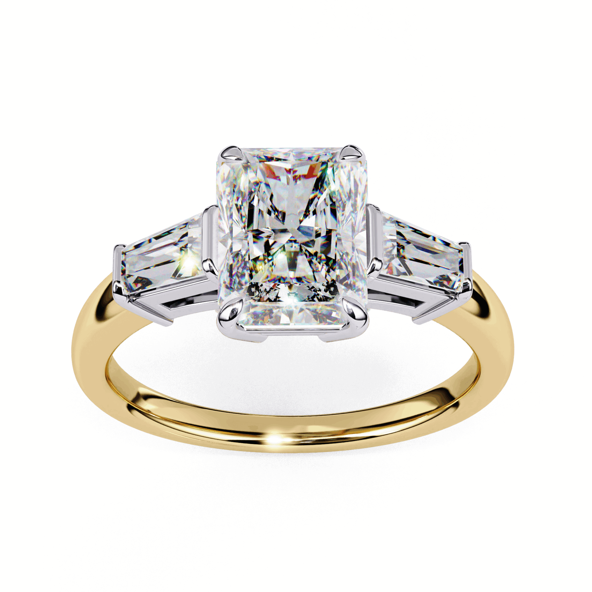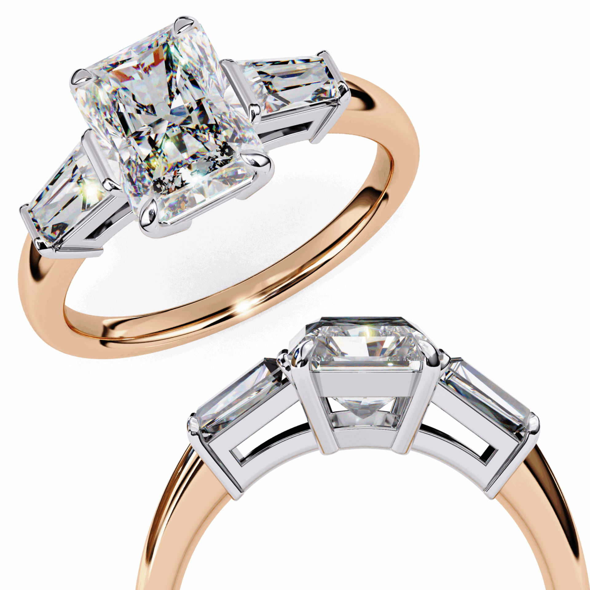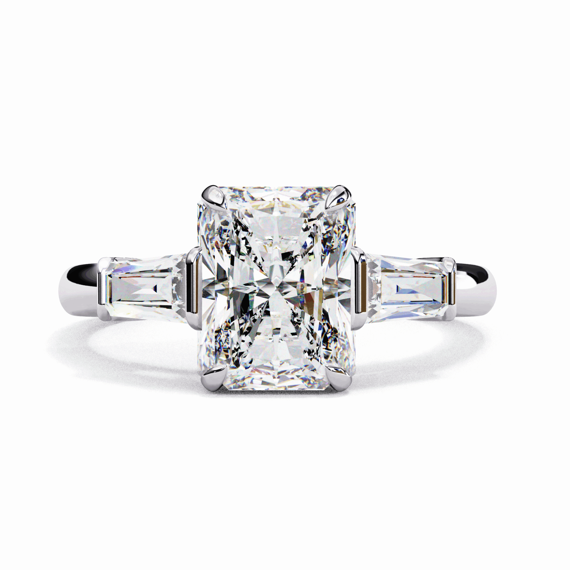 A radiant-cut lab-grown diamond with baguette accents, 3 diamonds totaling 3.13 carats. Rectangular cuts in architectural harmony.