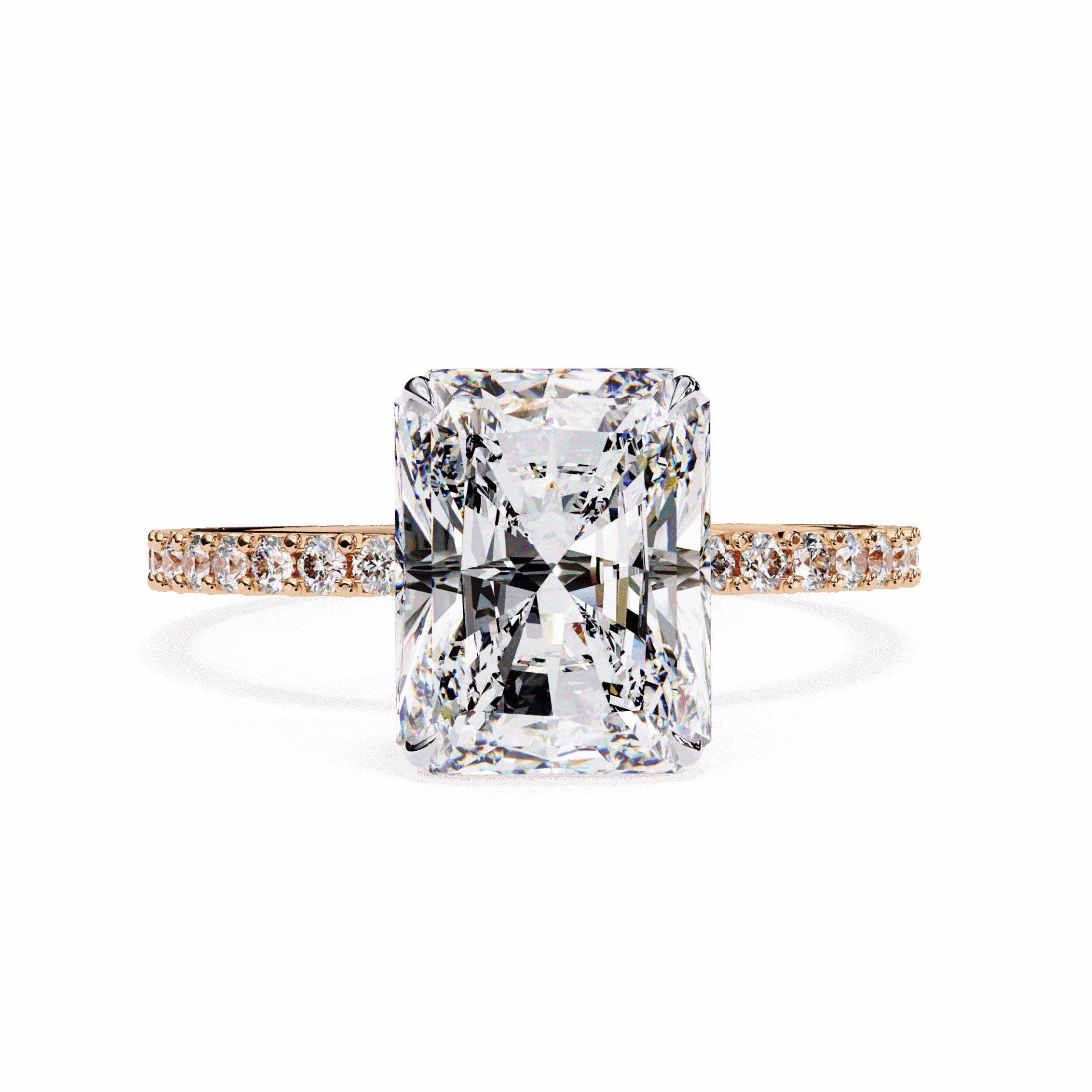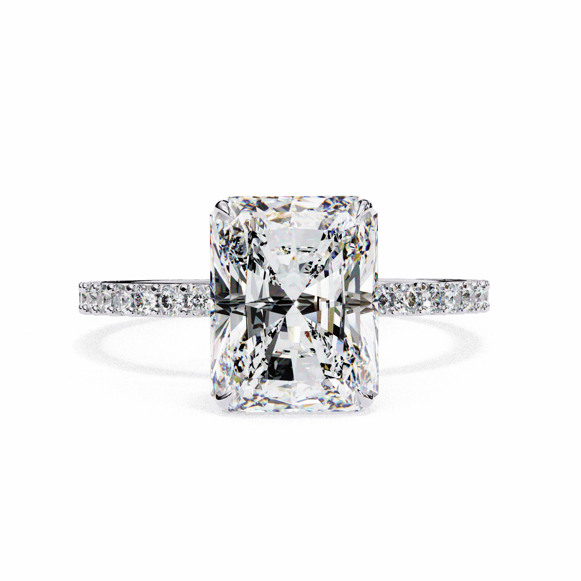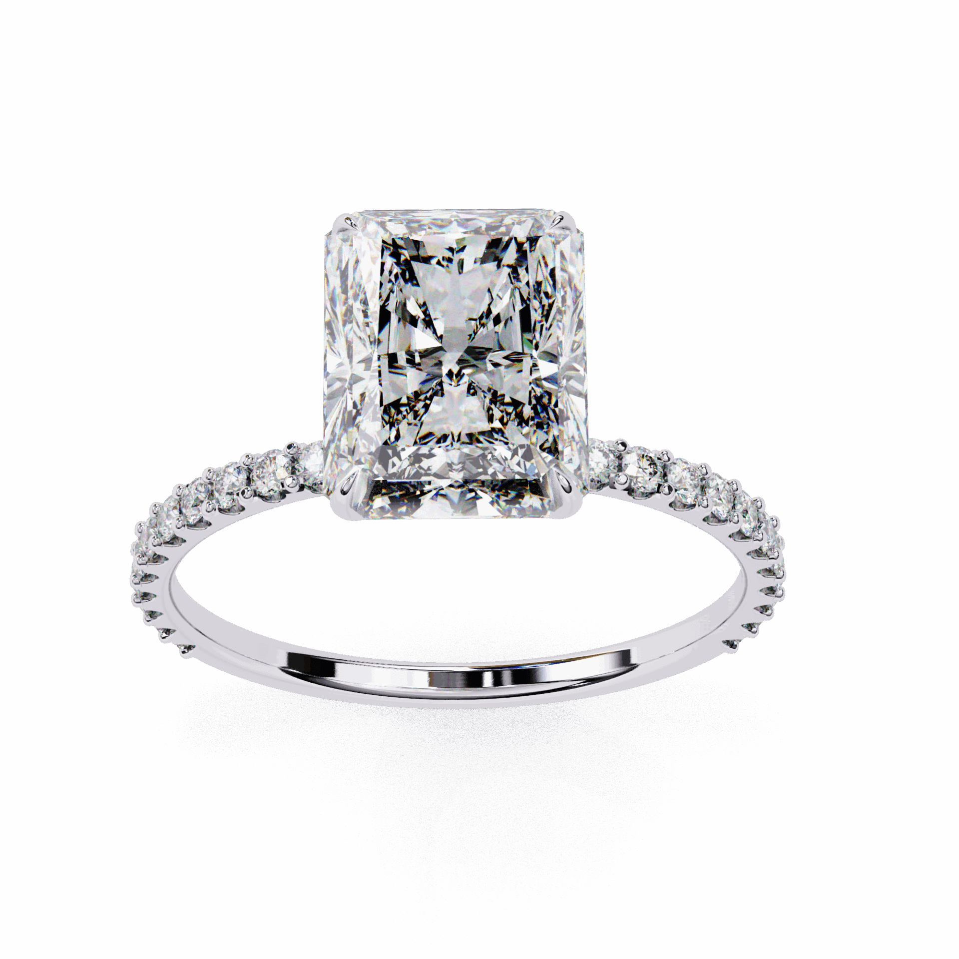 A radiant-cut lab-grown diamond with 37 accent diamonds totaling 3.33 carats. Rectangular geometry with maximum brilliance.