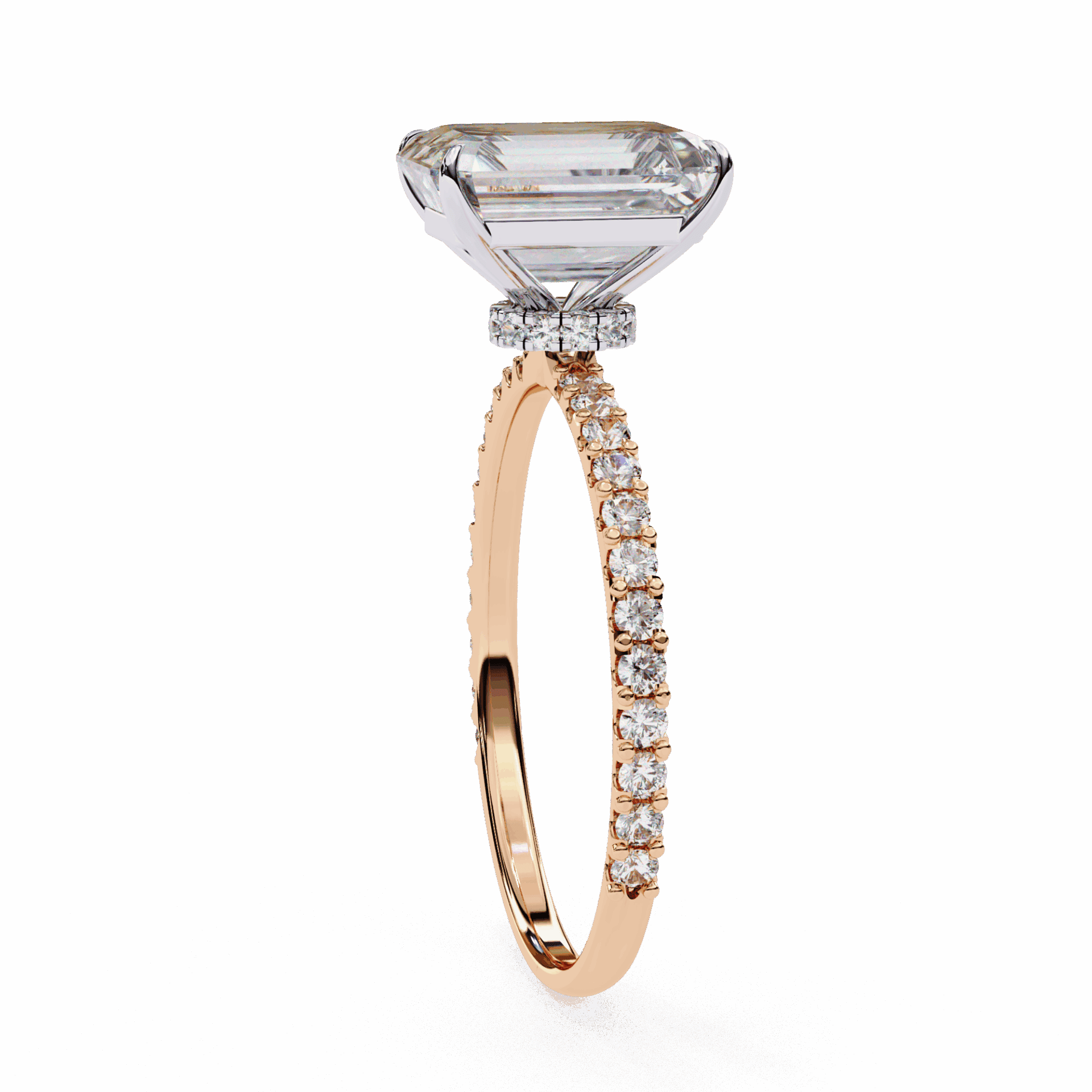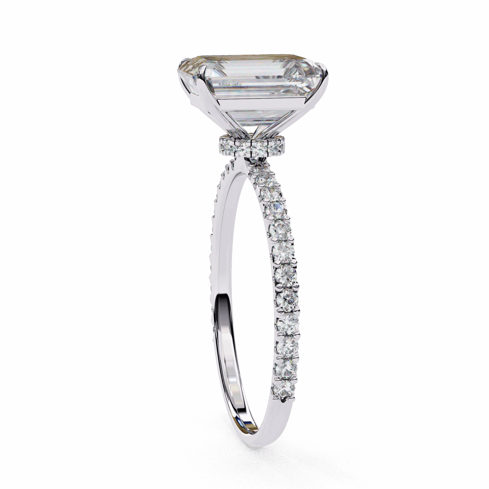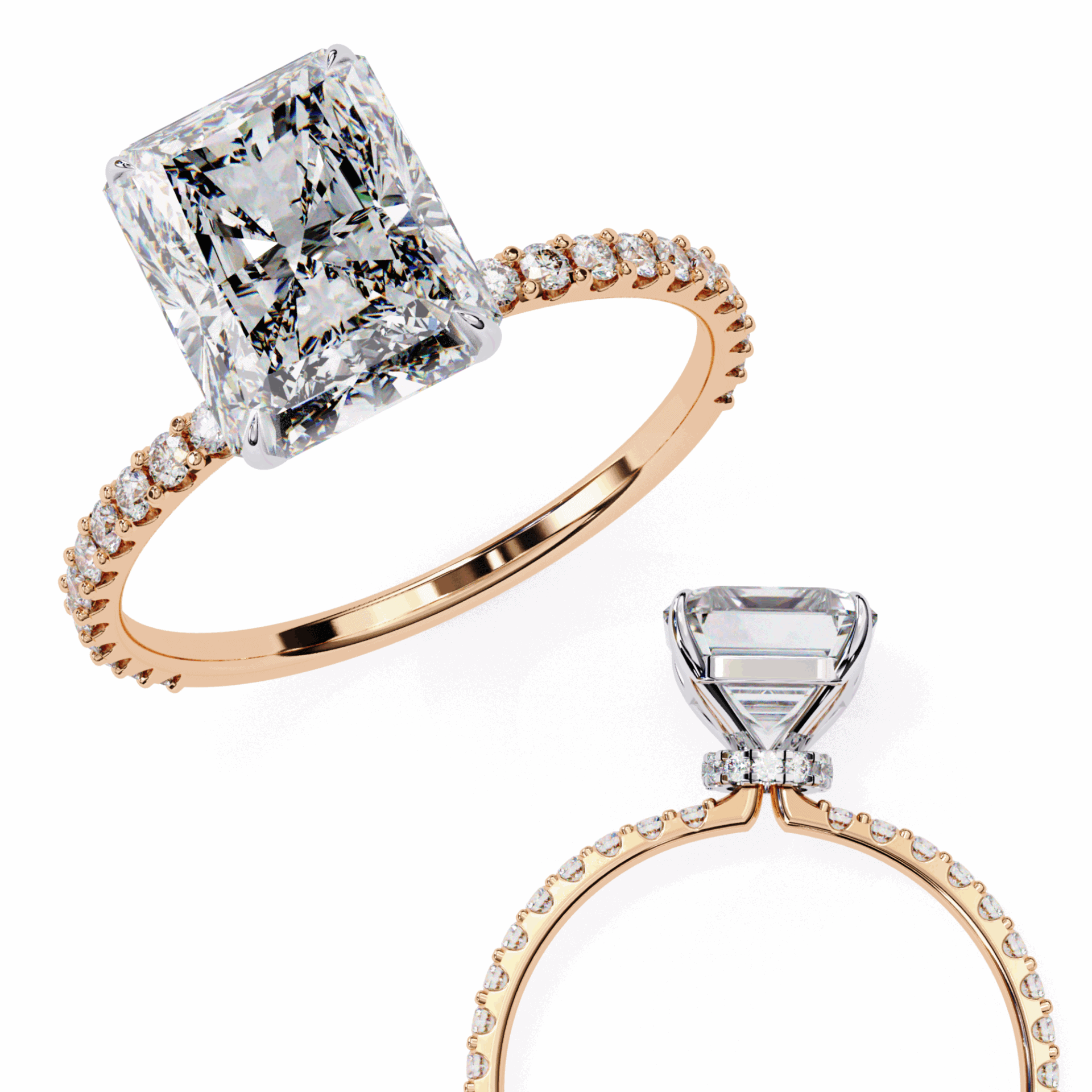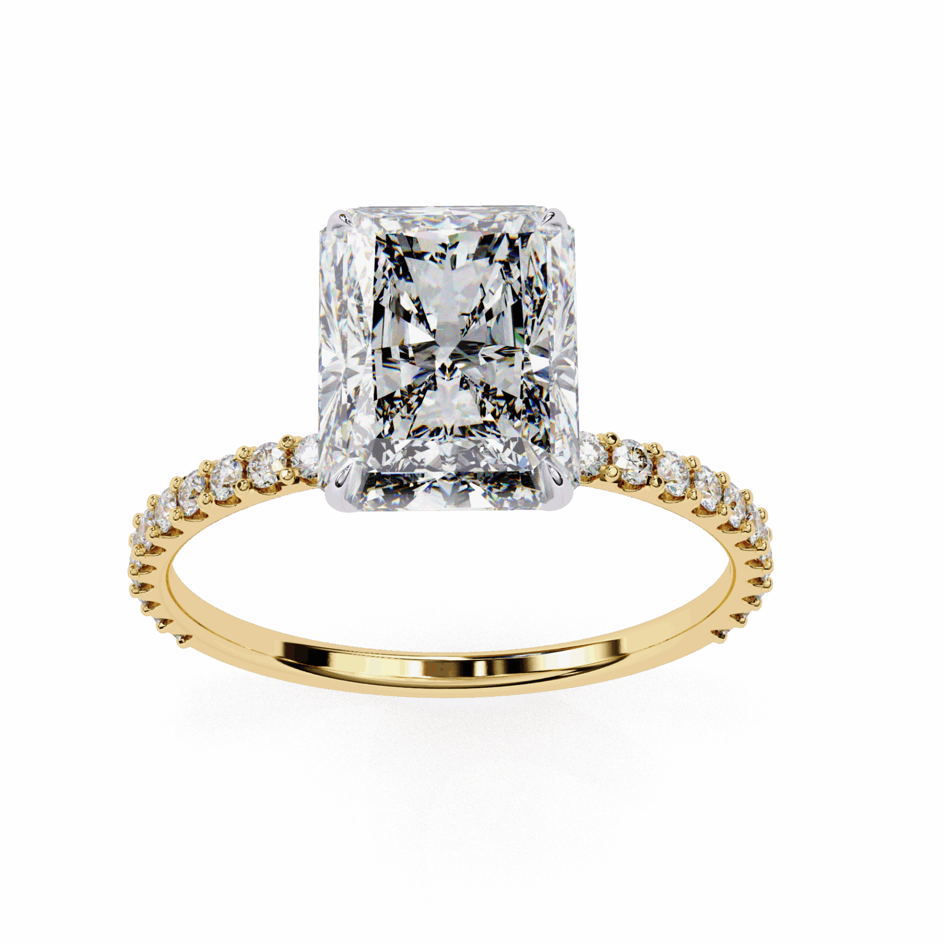 A radiant-cut lab-grown diamond with 37 accent diamonds totaling 3.33 carats. Rectangular geometry with maximum brilliance.
