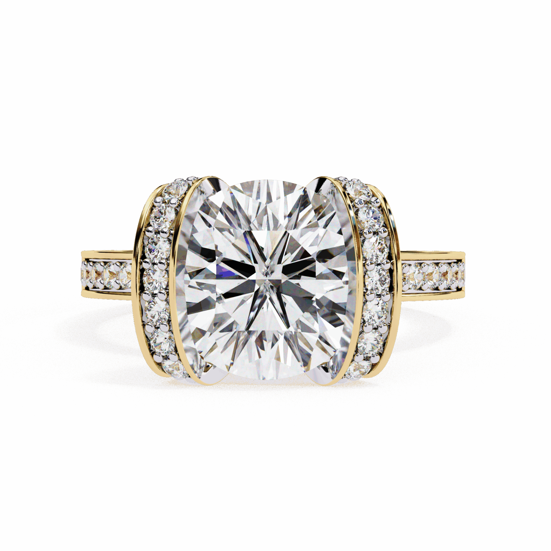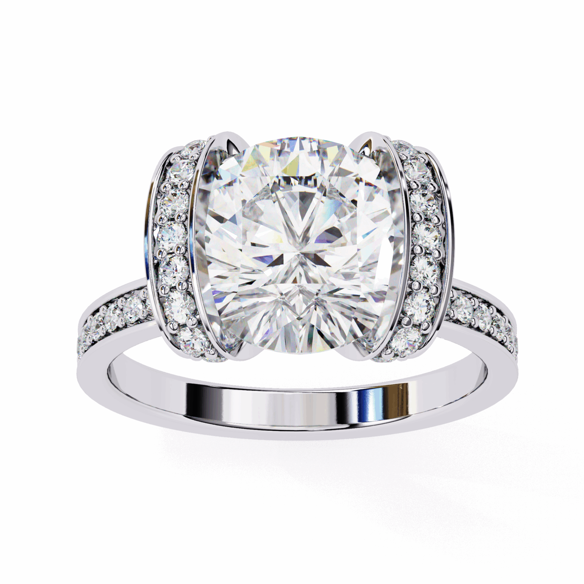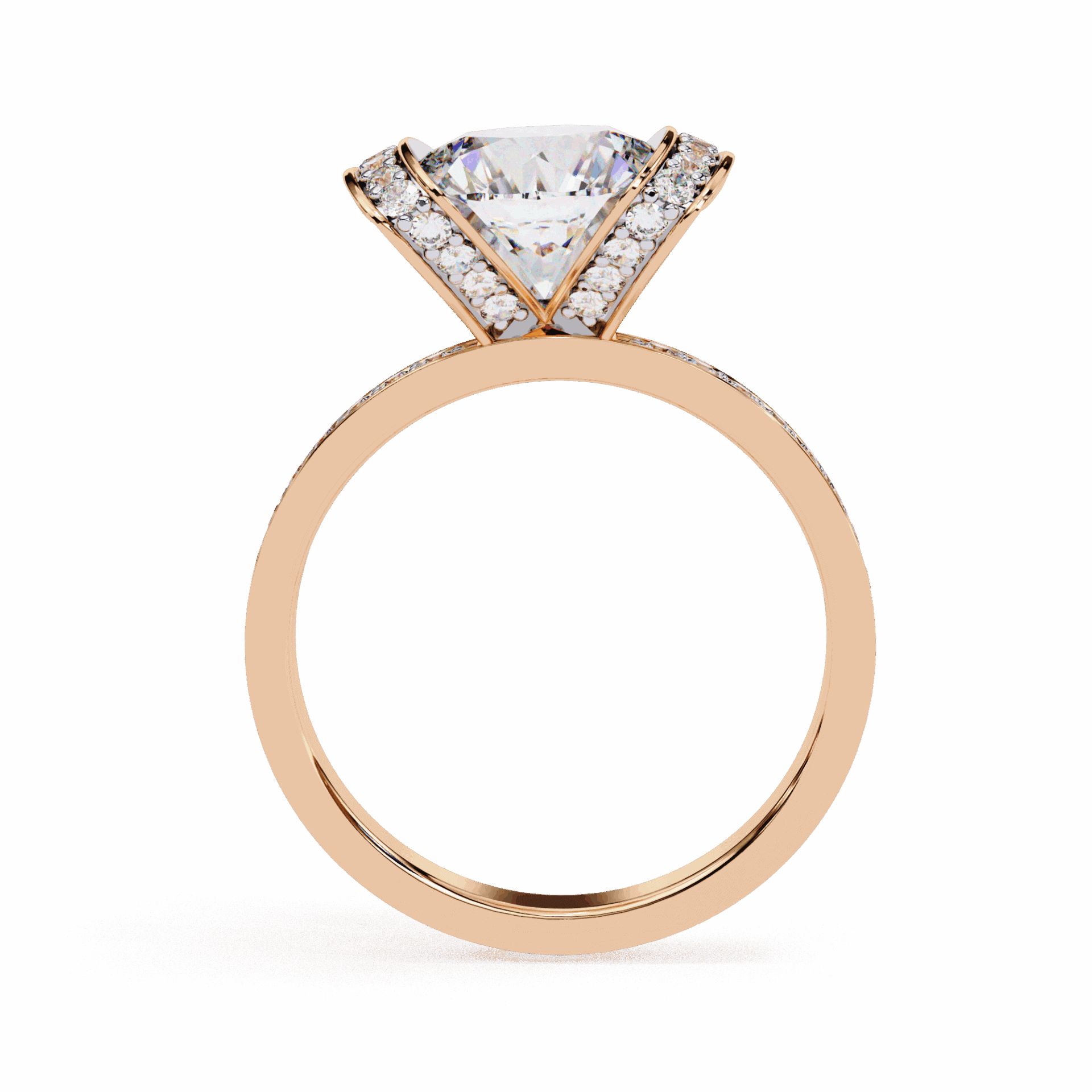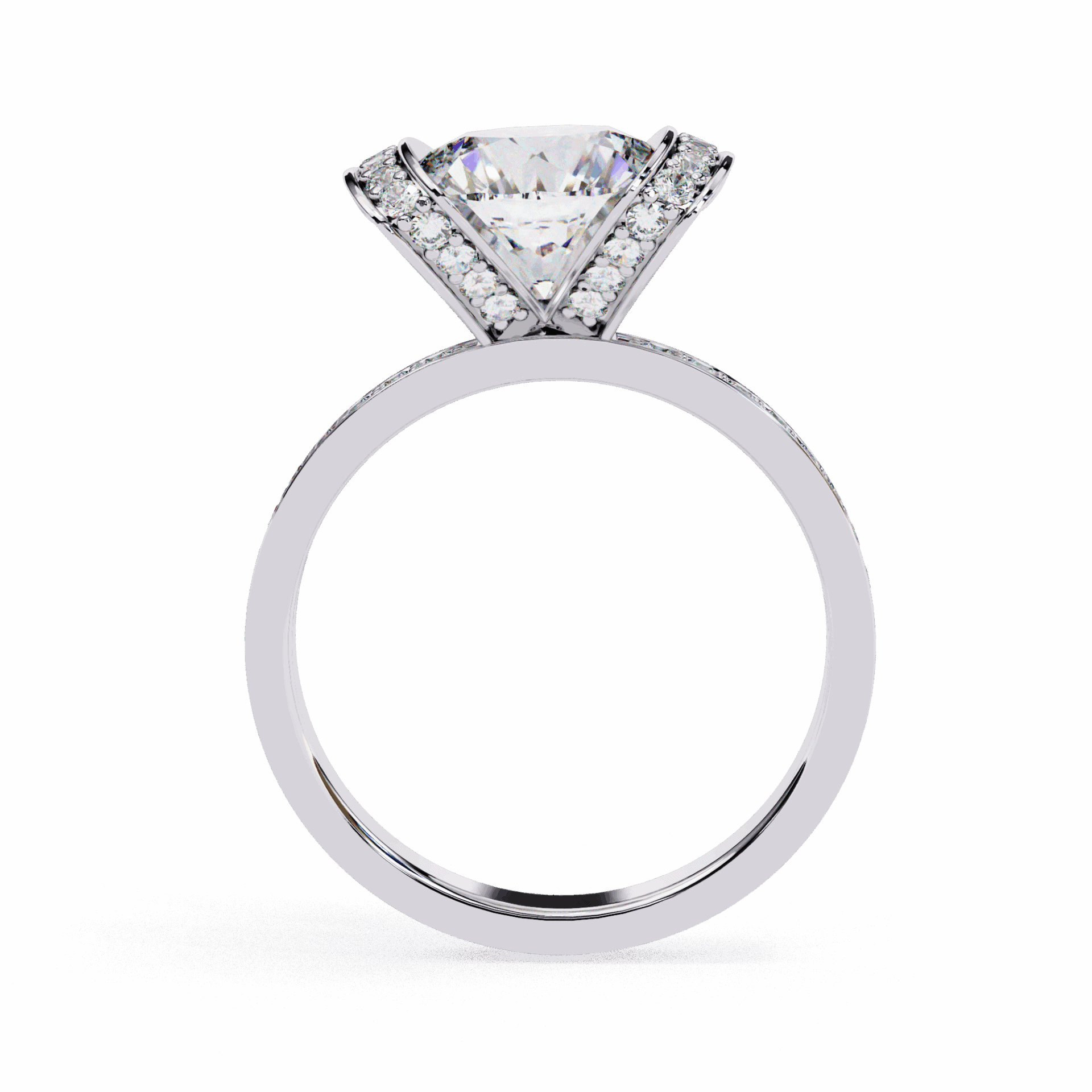 Over 3.25 carats with hidden halo surprise. The halo adds sparkle from every angle while keeping the solitaire silhouette pure.