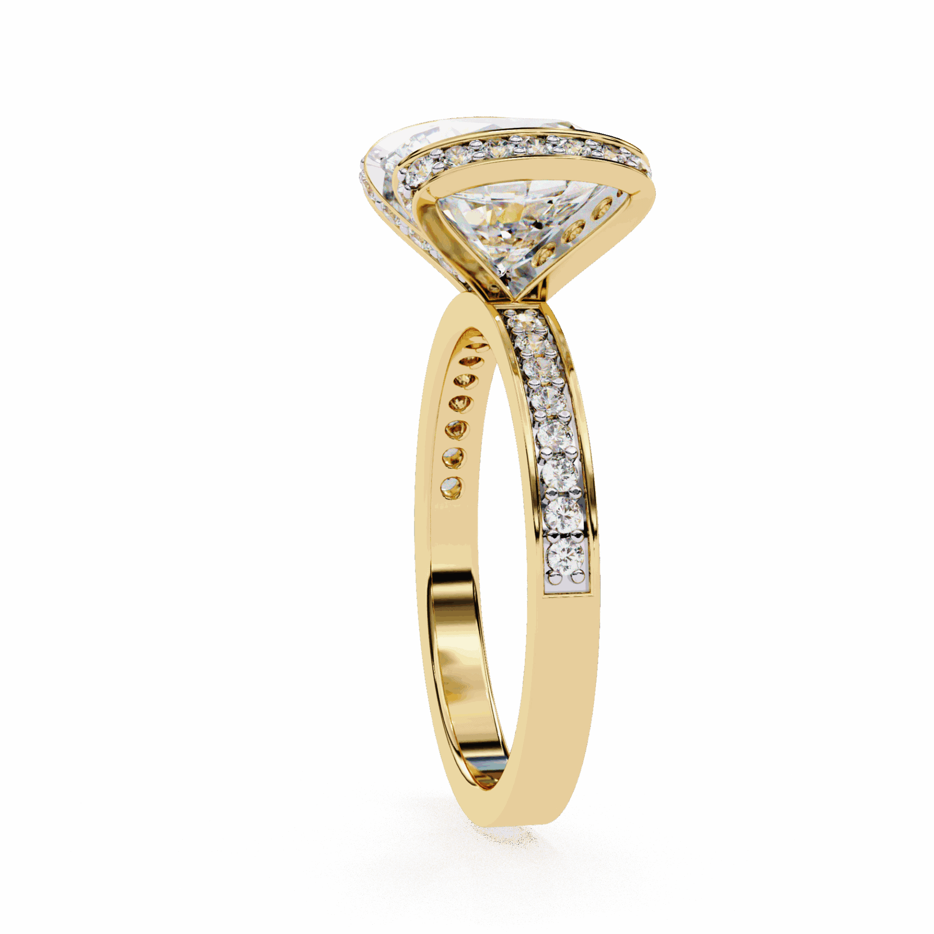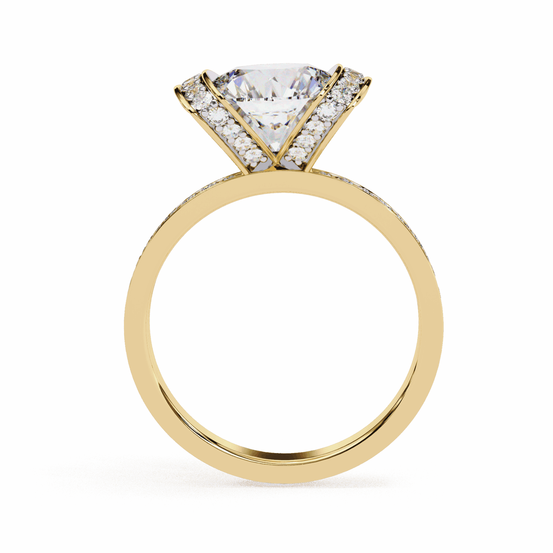 A round lab-grown diamond with 47 accent diamonds totaling 3.3 carats, including a hidden halo beneath. Secret brilliance at statement scale.