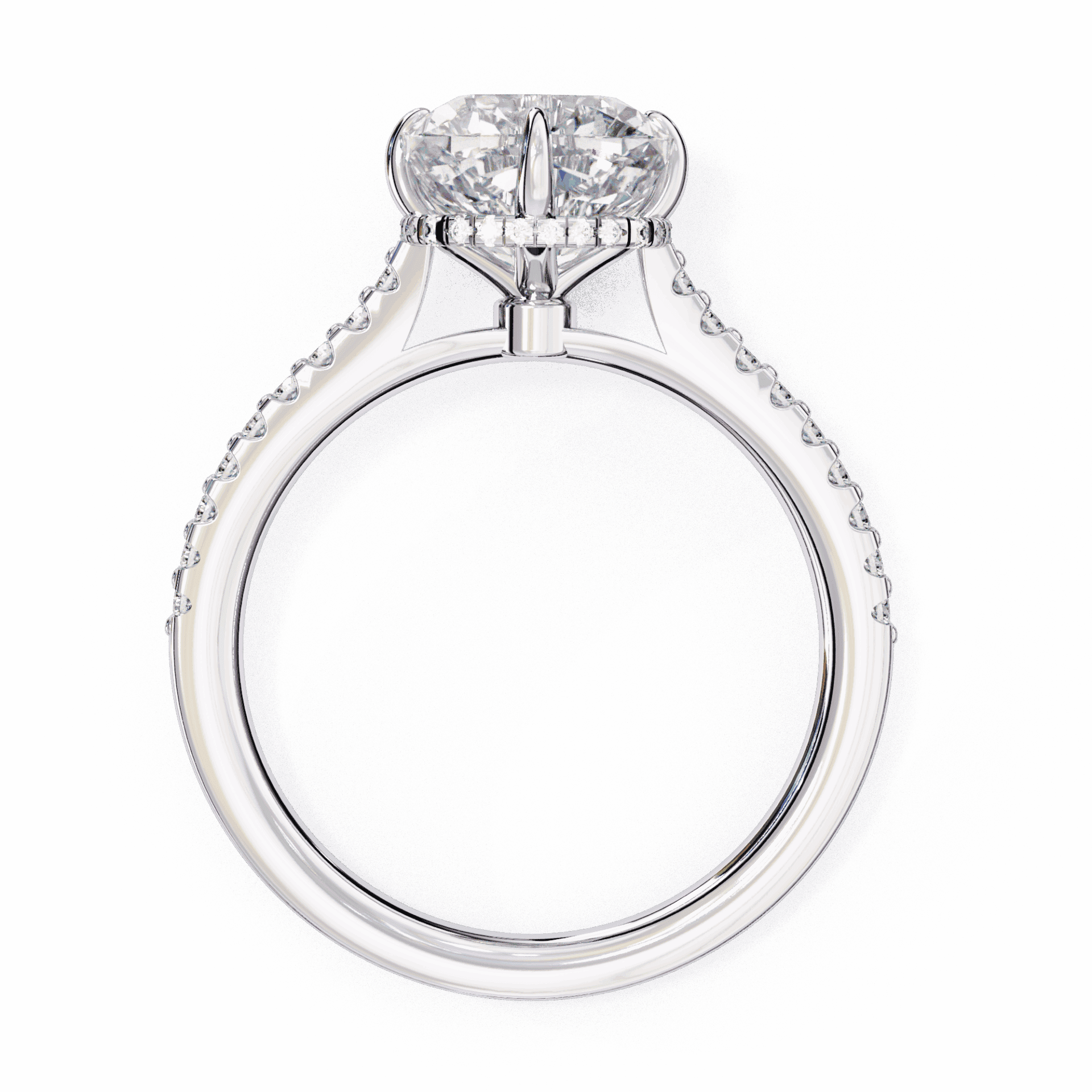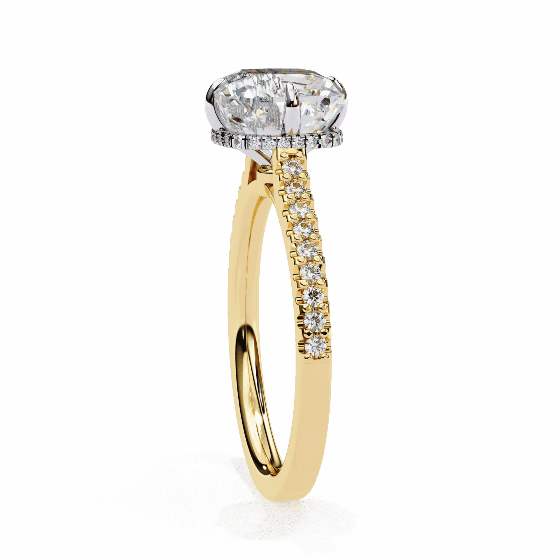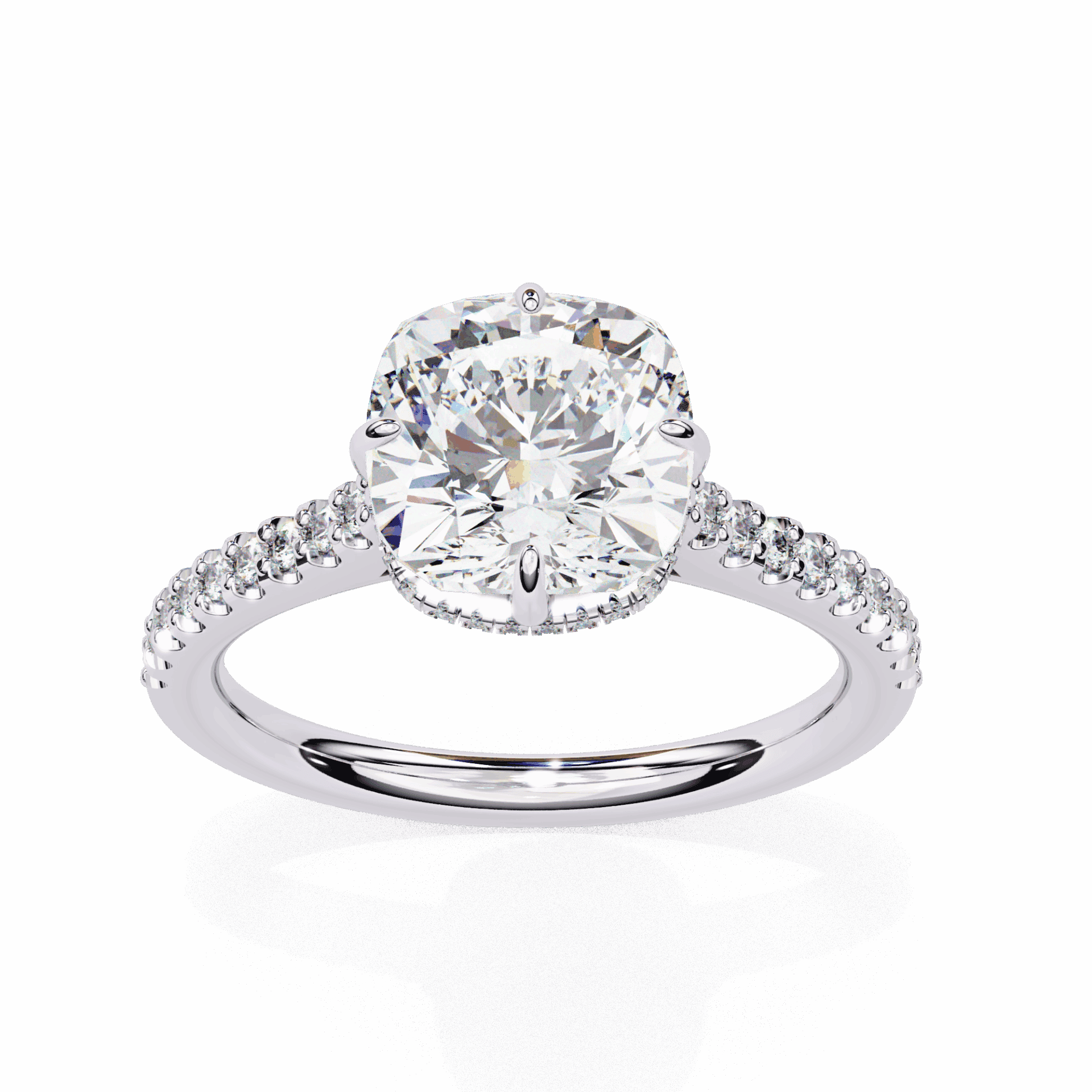 A cushion-cut lab-grown diamond with 52 accent diamonds totaling 3.4 carats, including a hidden halo beneath. Secret sparkle enhances the vintage glow.