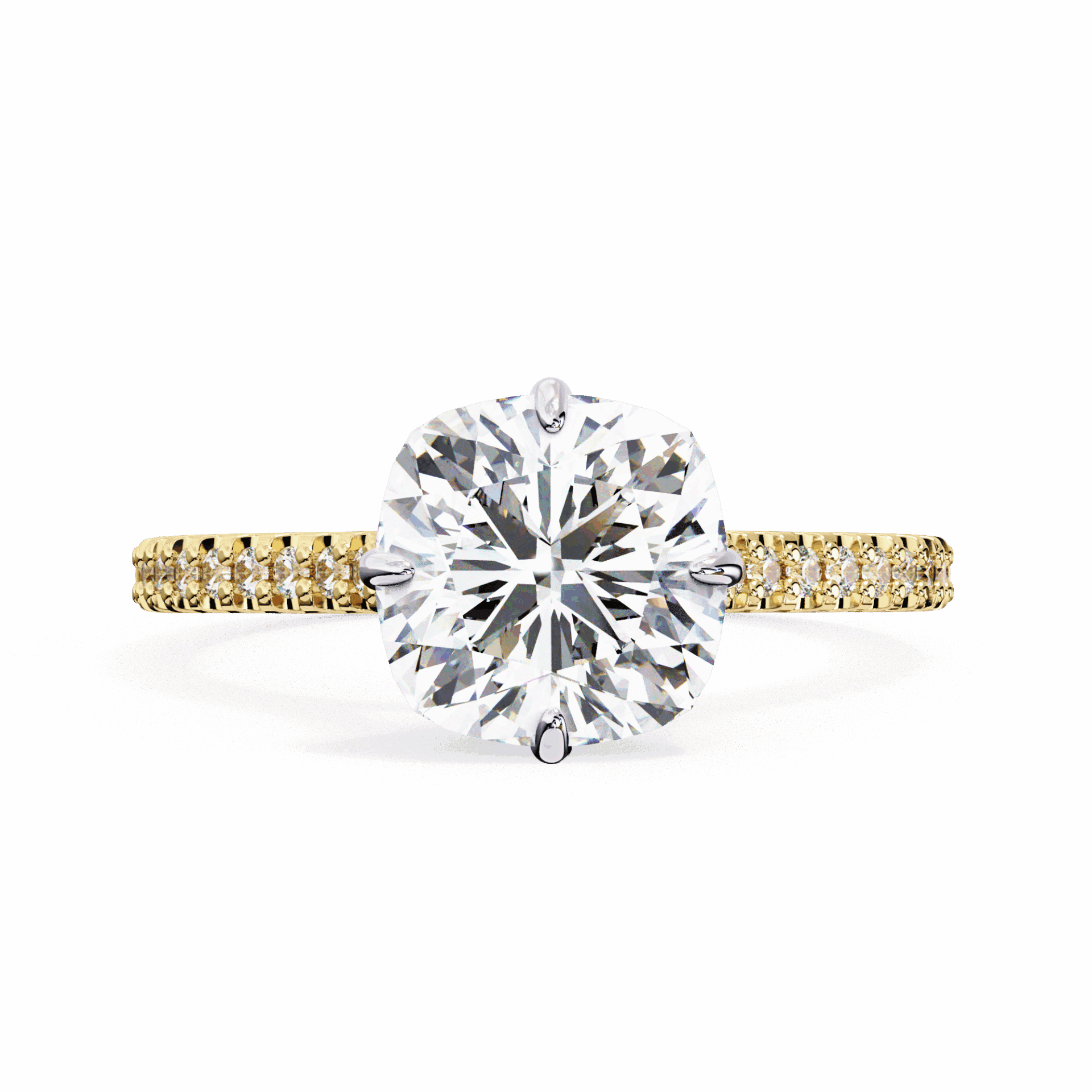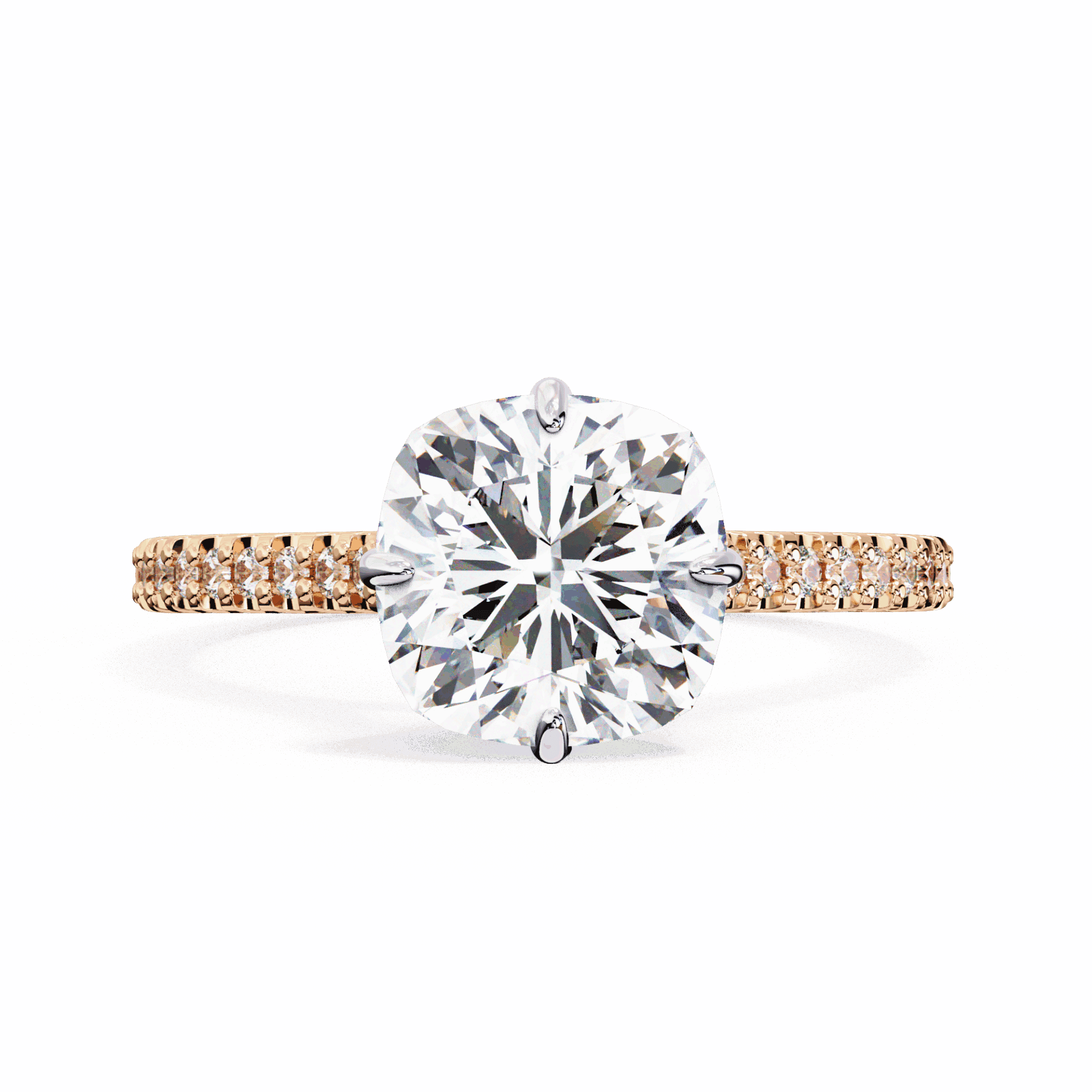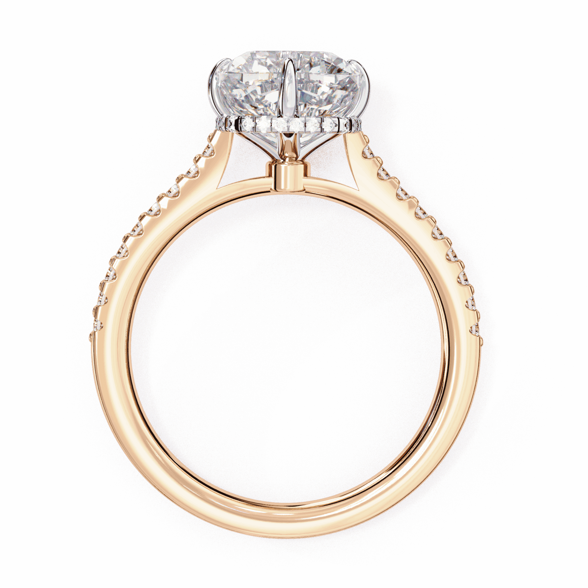 A cushion-cut lab-grown diamond with 52 accent diamonds totaling 3.4 carats, including a hidden halo beneath. Secret sparkle enhances the vintage glow.