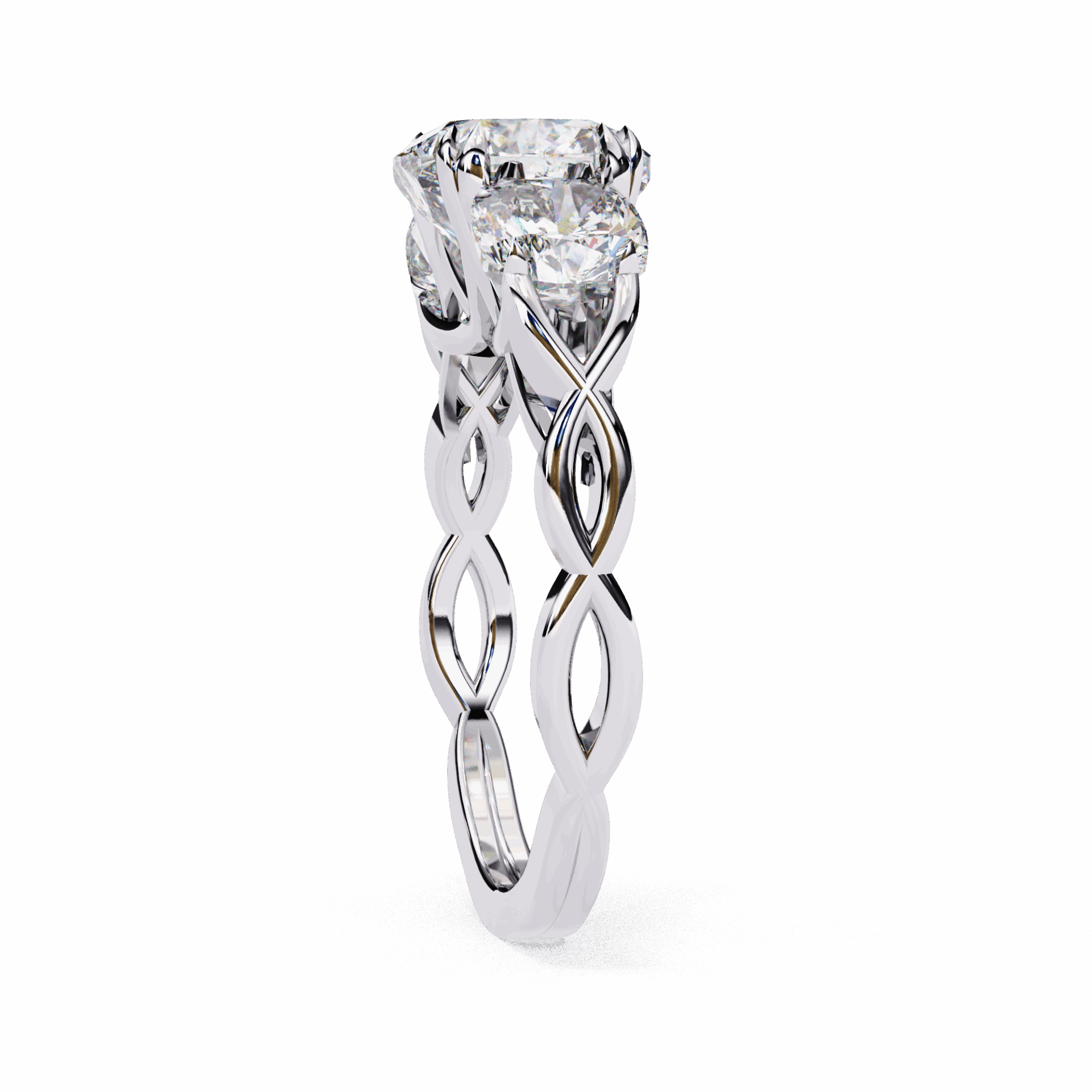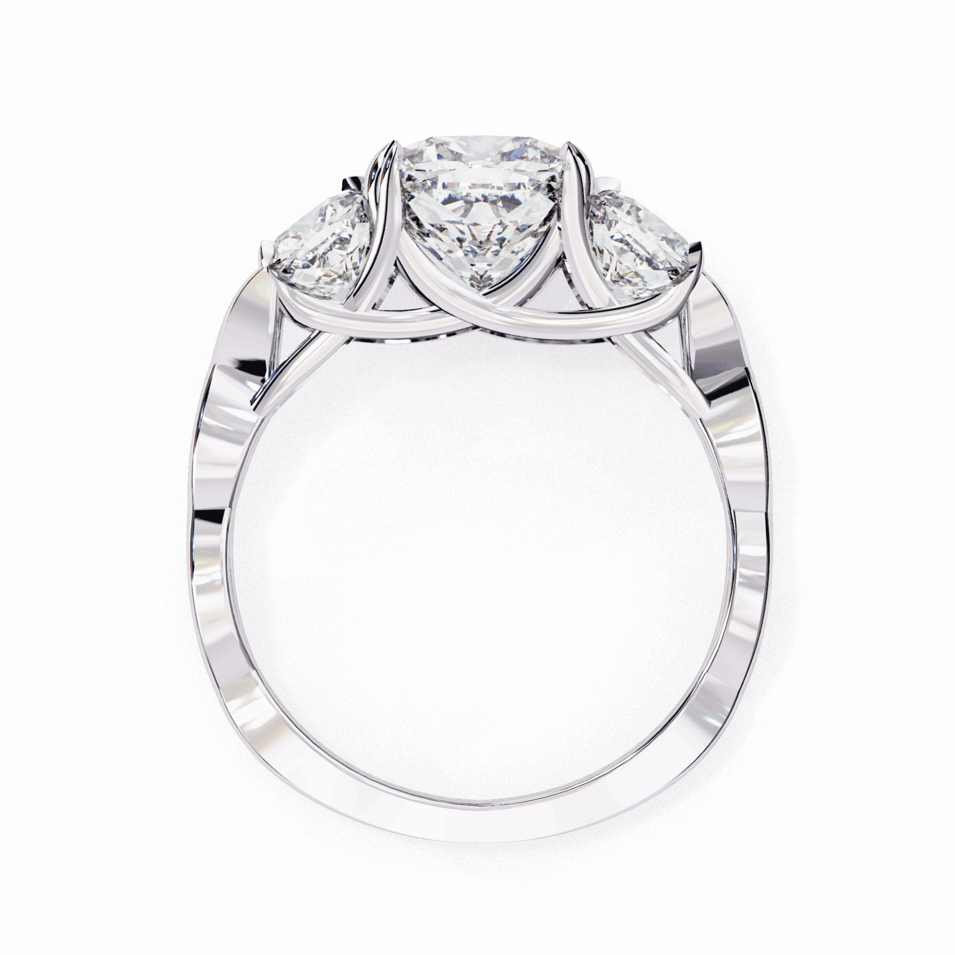 Over 3.5 carats in the three-stone format. Past, present, and future at statement scale.