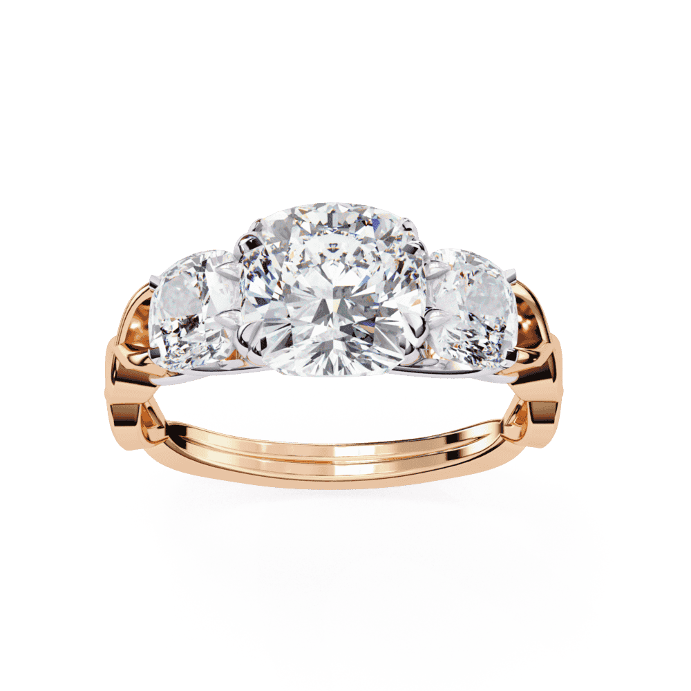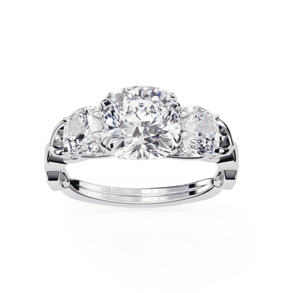 A cushion-cut lab-grown diamond with 3 accent diamonds totaling 3.49 carats in a three-stone setting. Substantial vintage romance with eternal symbolism.