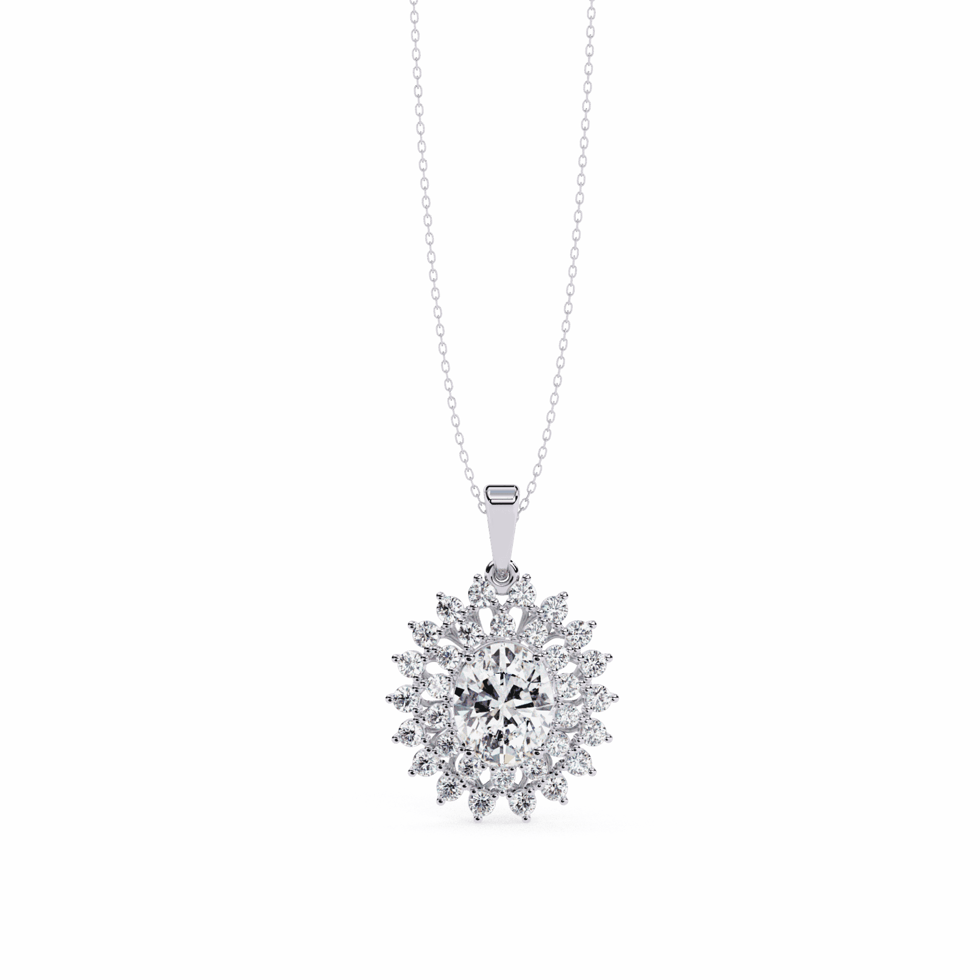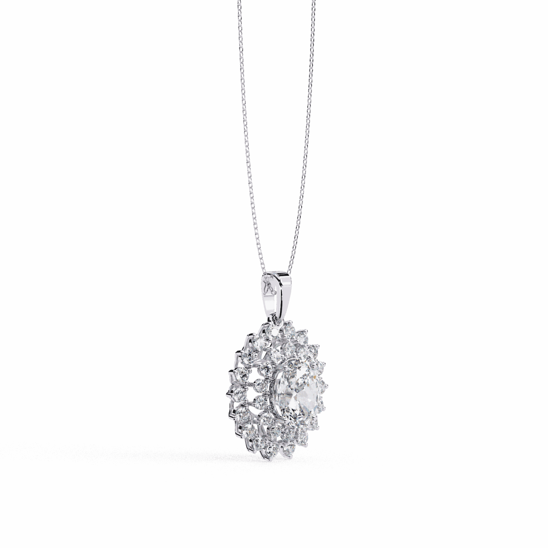 33 lab-grown diamonds – a round center surrounded by dual halos of oval and round stones. The double halo creates serious presence – this is a statement pendant for statement moments.