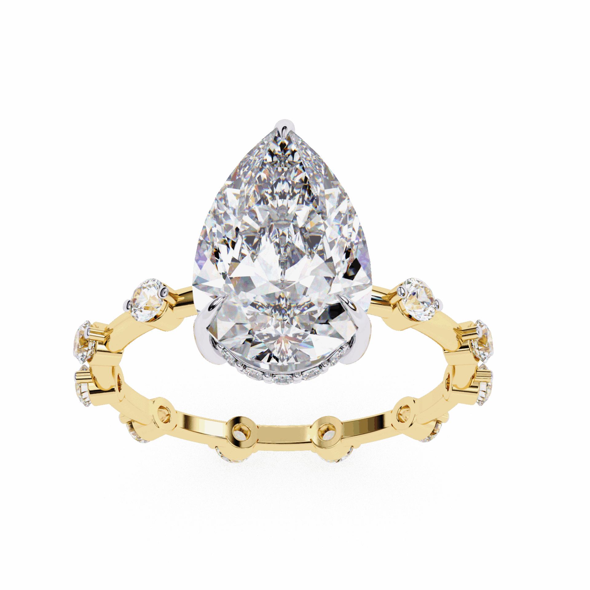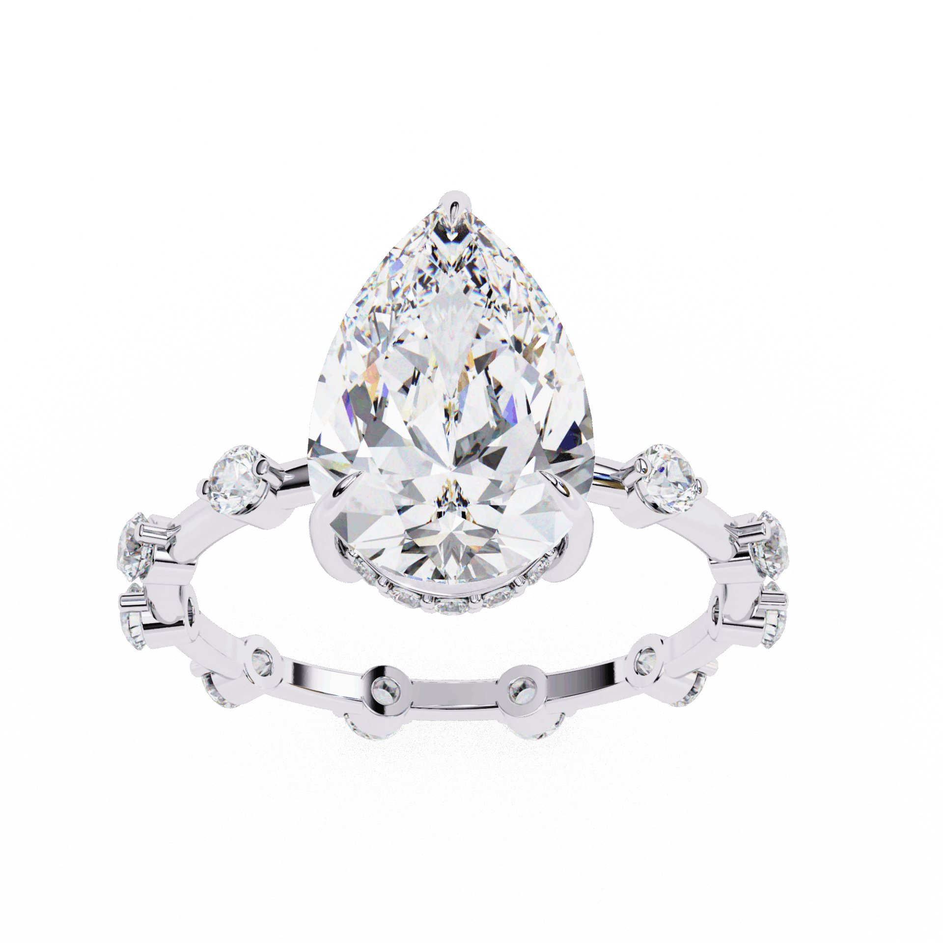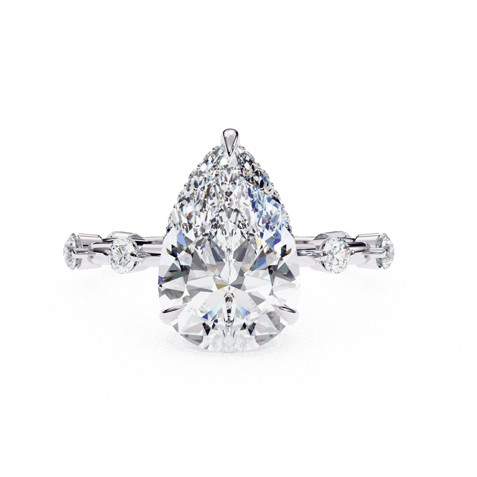 A pear-cut lab-grown diamond with 30 side stone accent diamonds totaling 3.51 carats. Teardrop drama enhanced by sparkling accents.