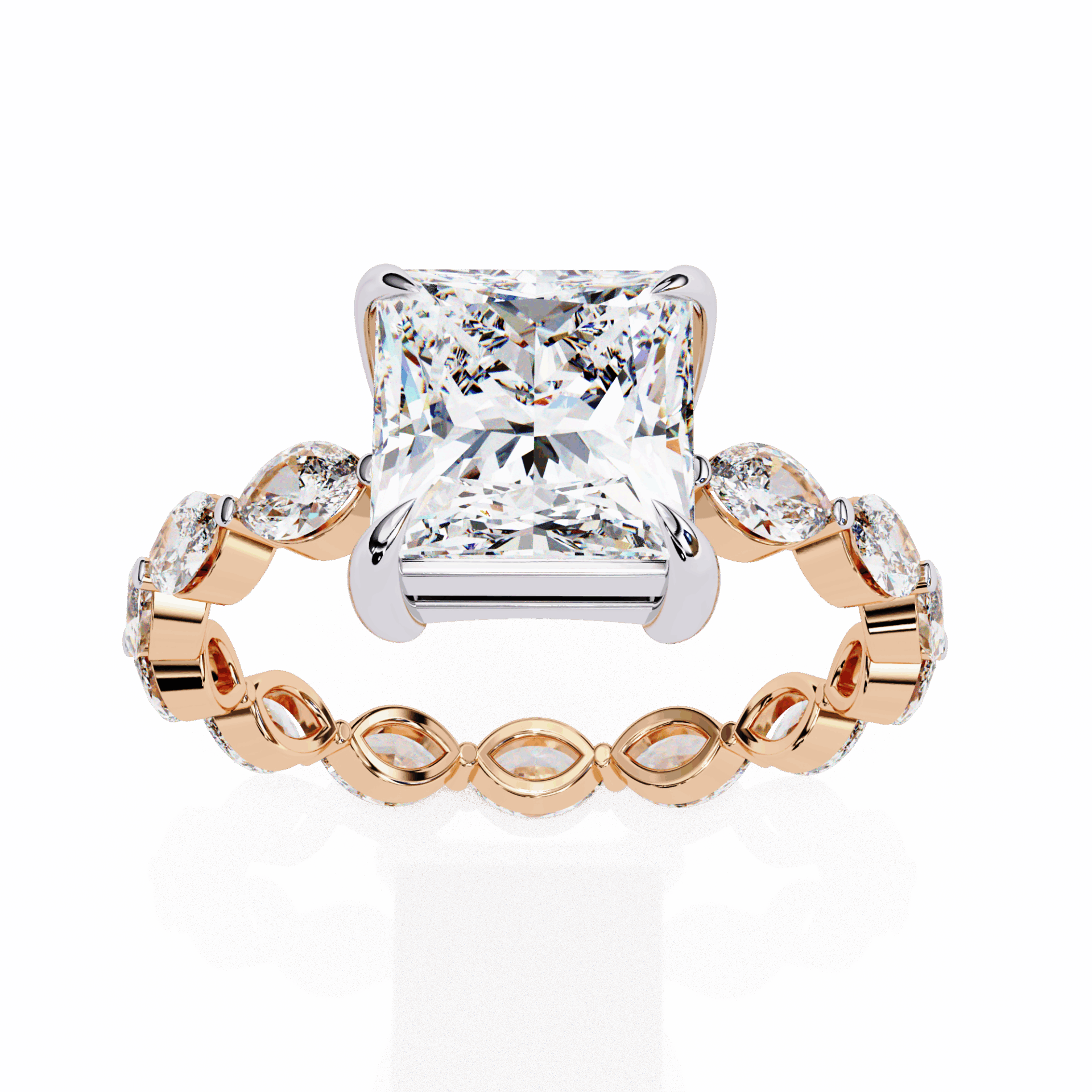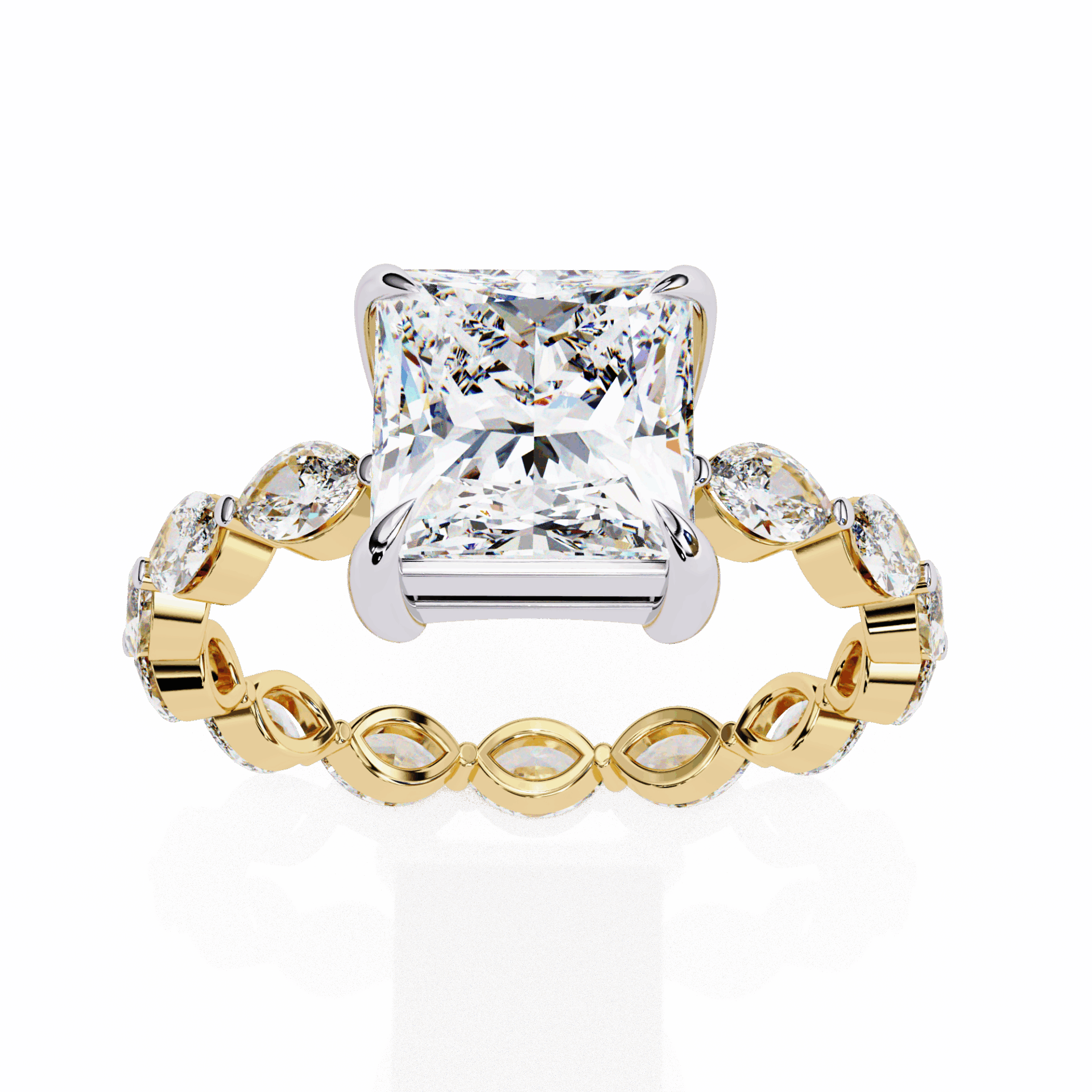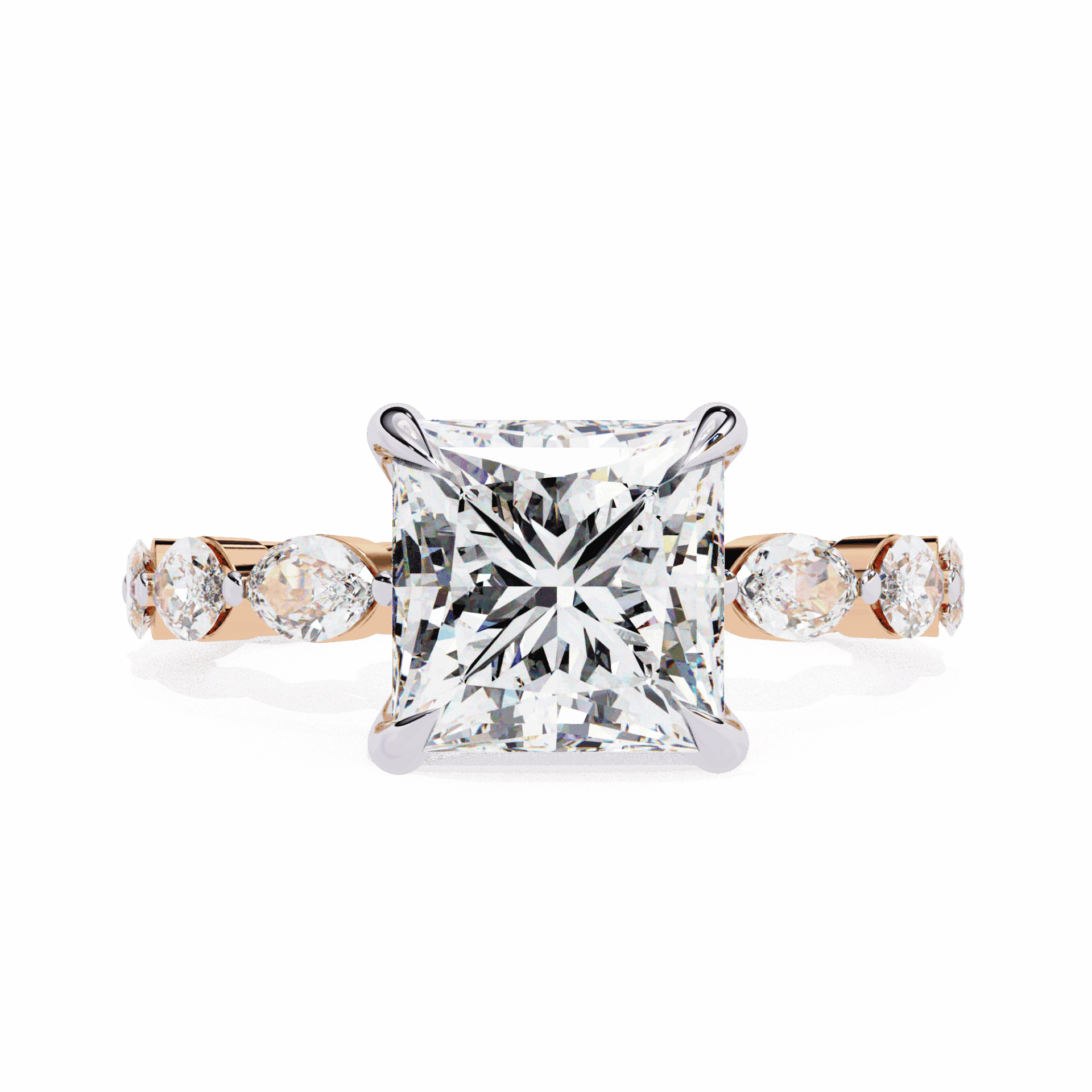 A princess-cut lab-grown diamond with 14 accent diamonds totaling 3.49 carats. Angular brilliance in the Infinity setting.
