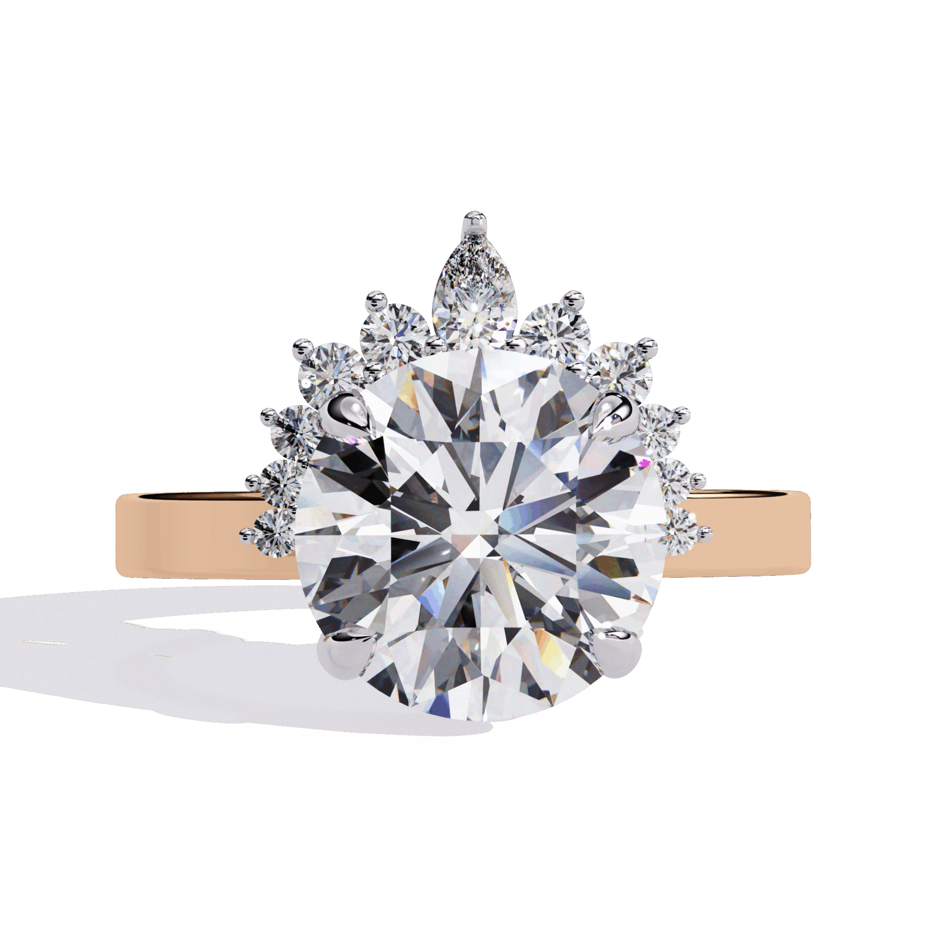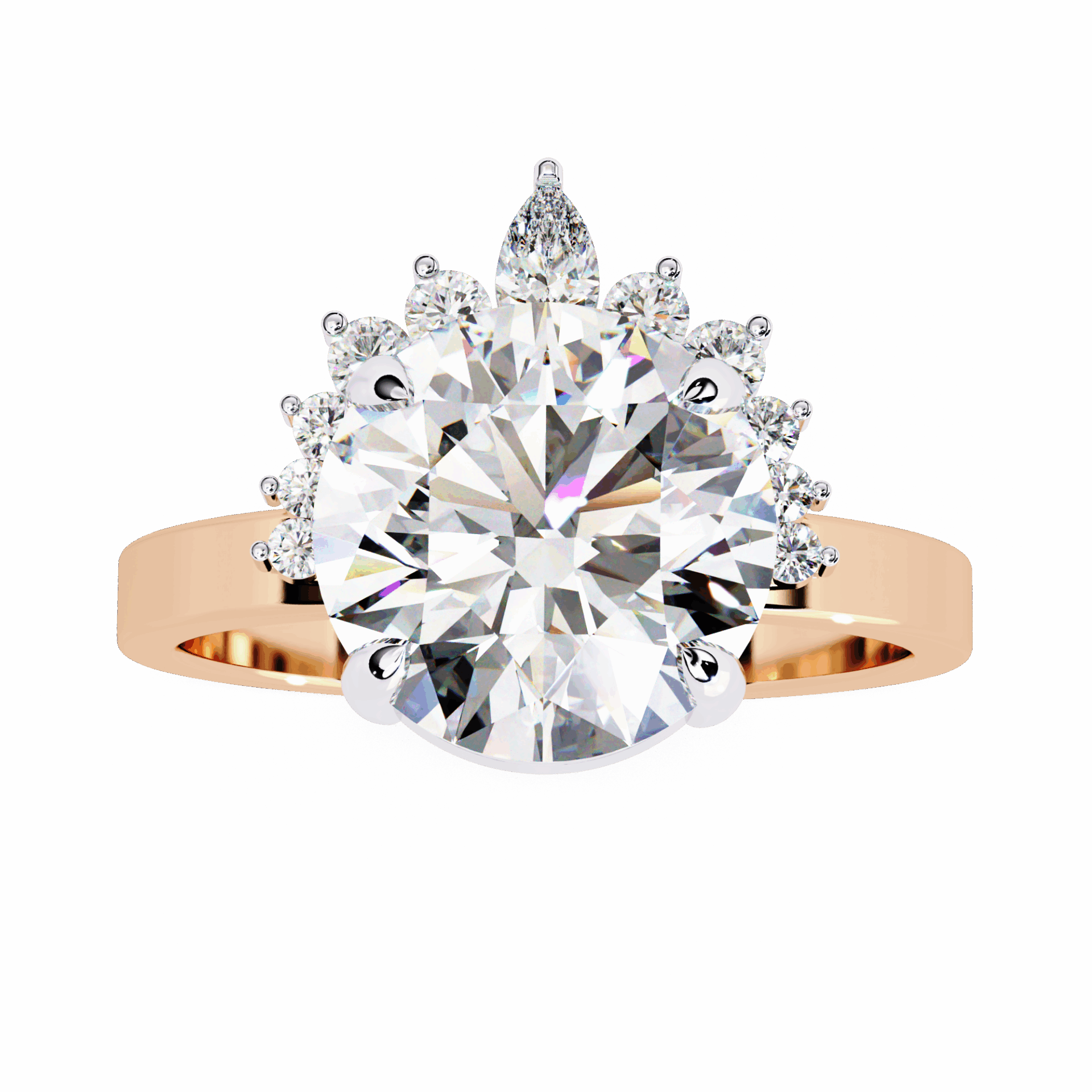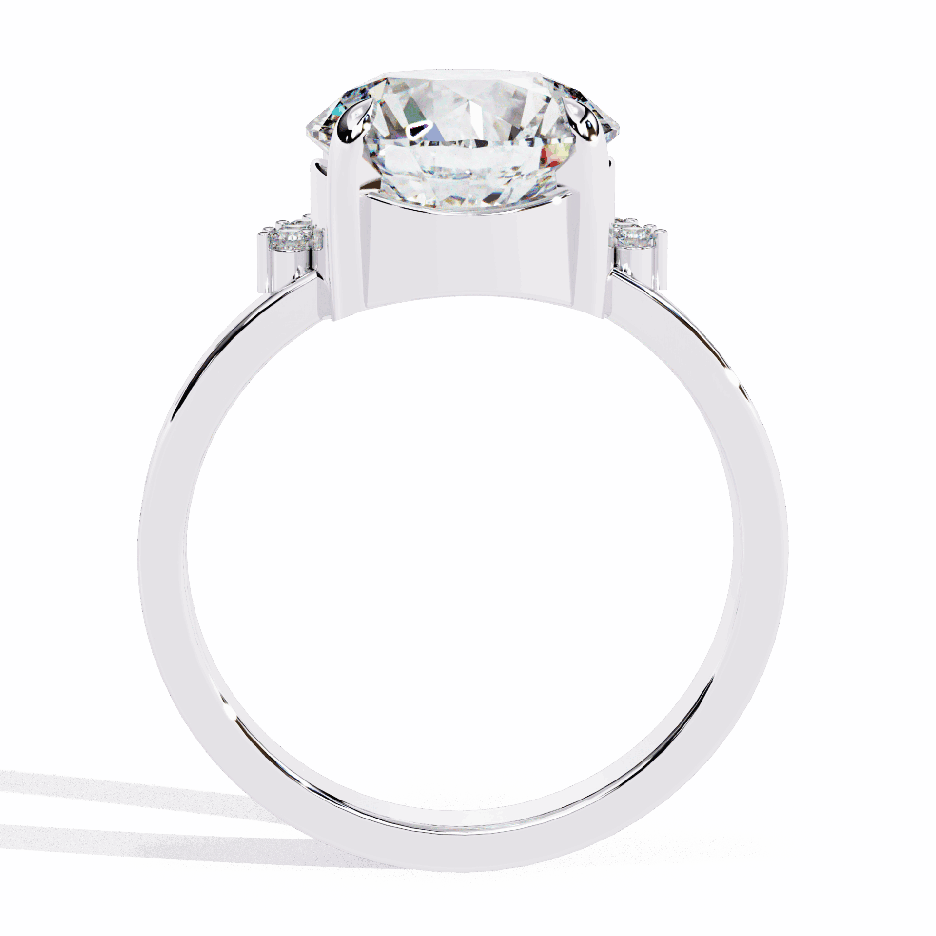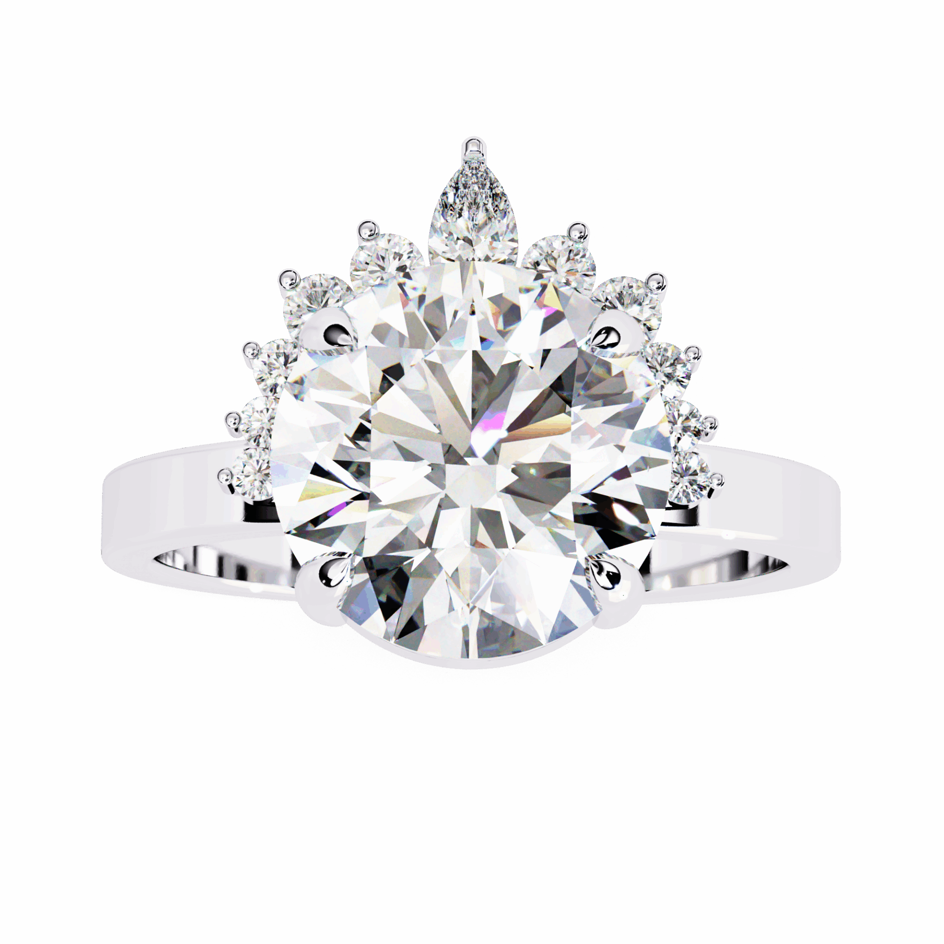 One round center with accent stones. Refined sparkle at statement scale.
