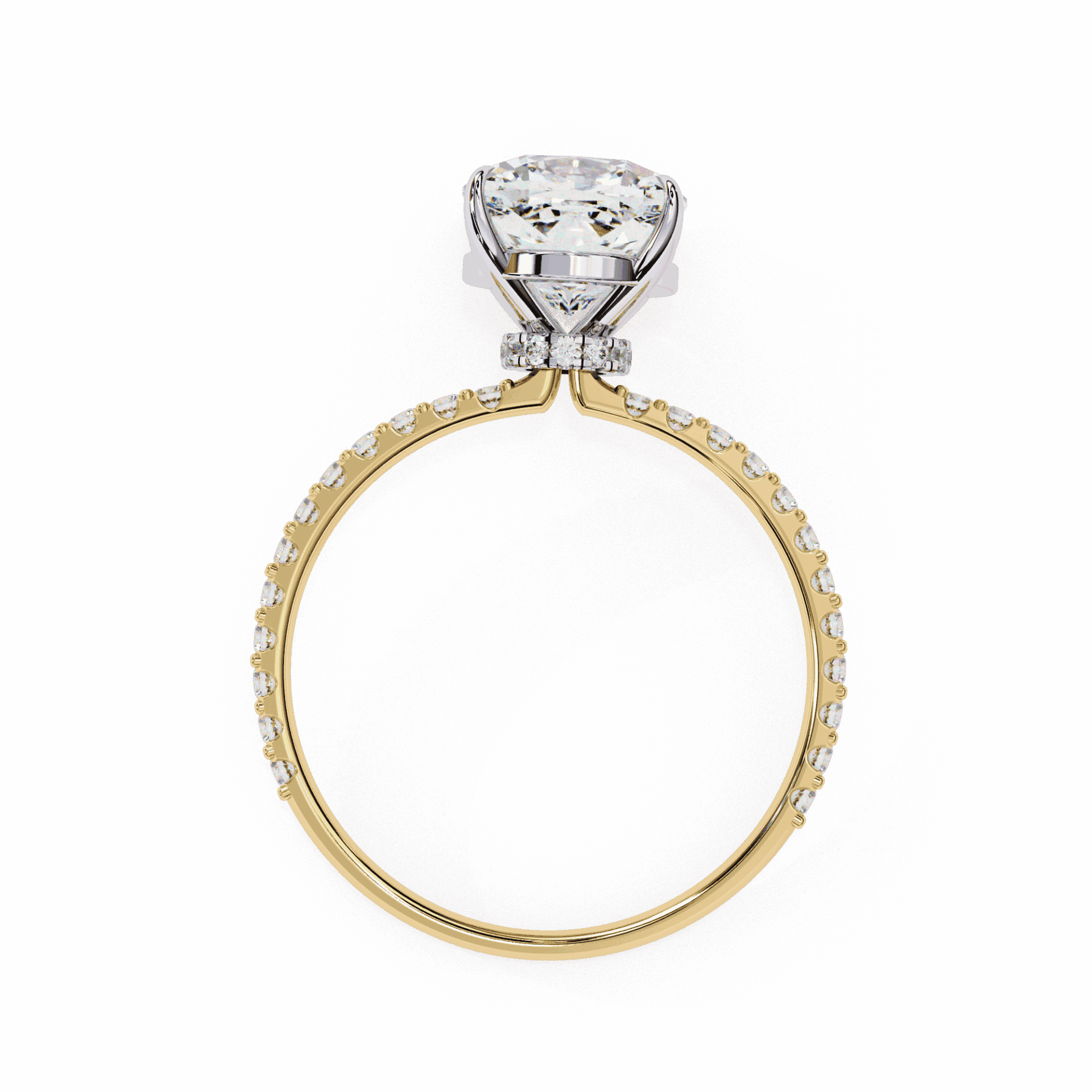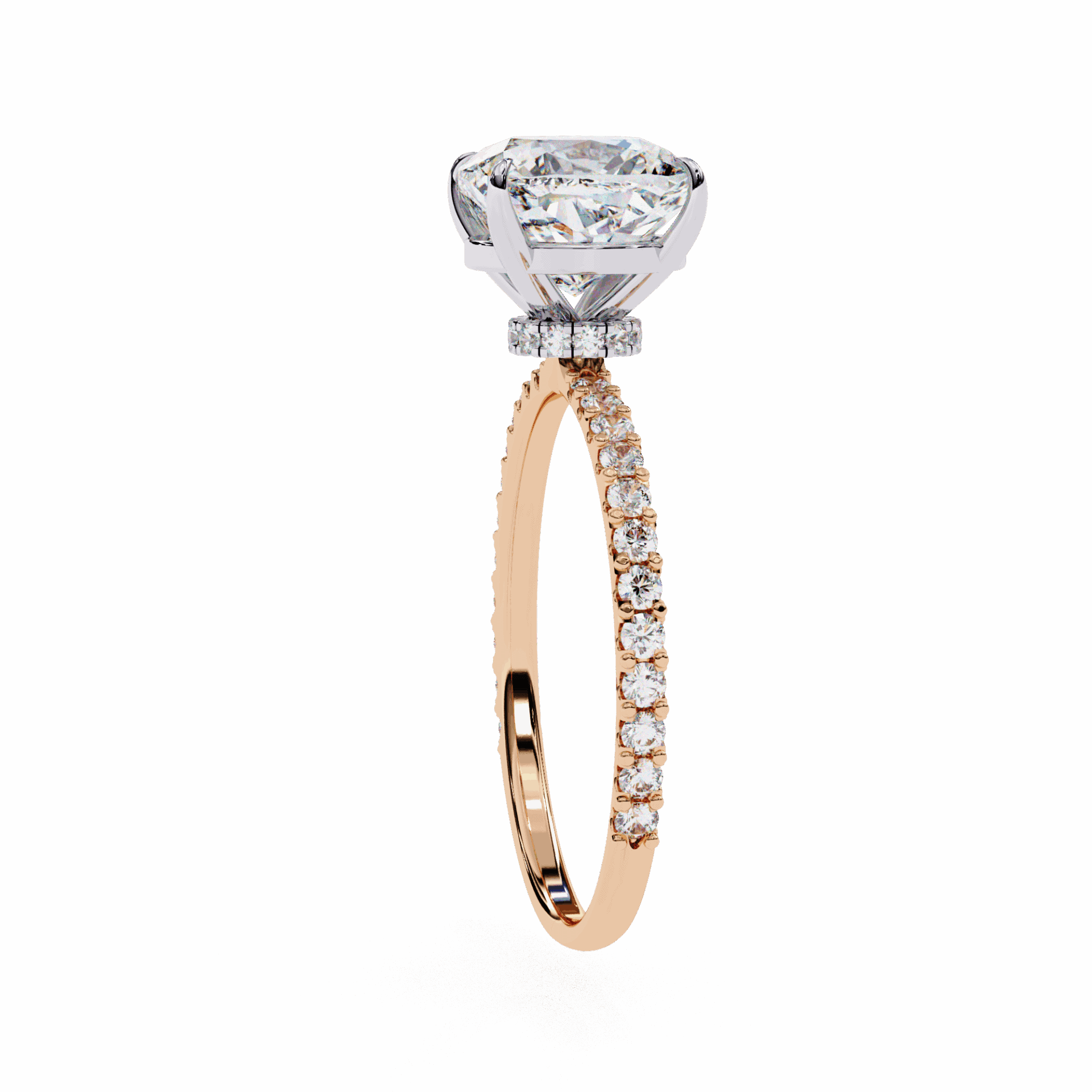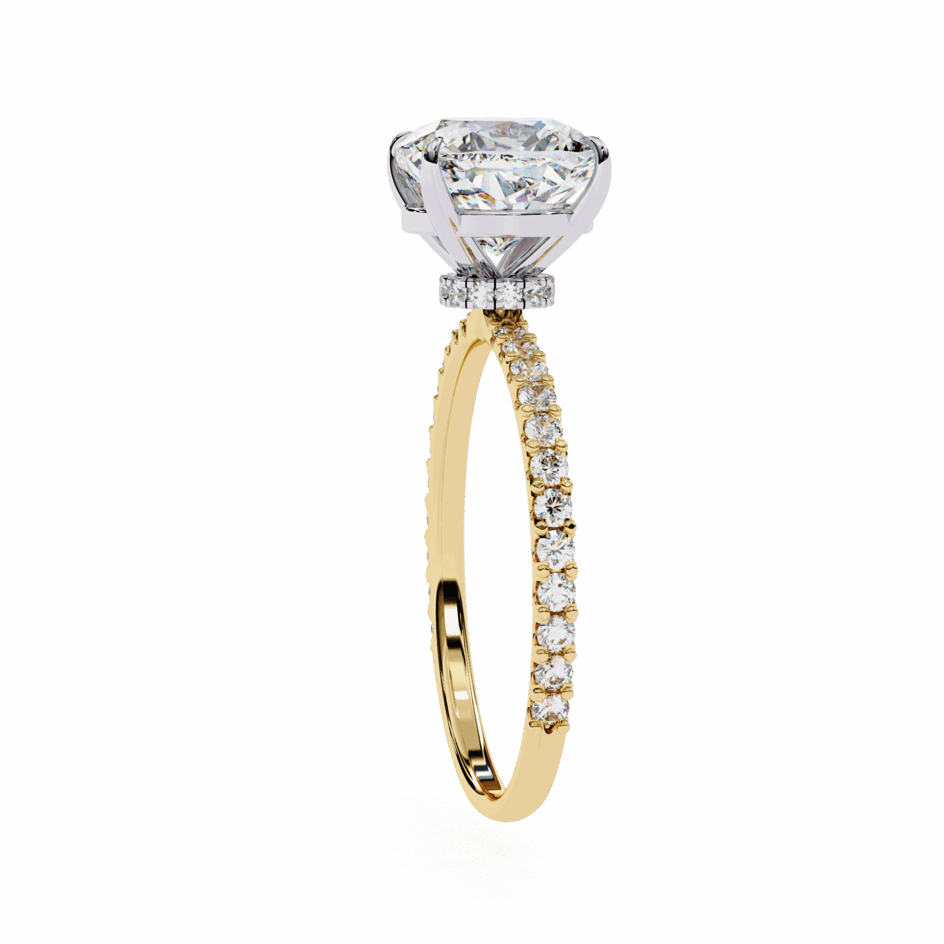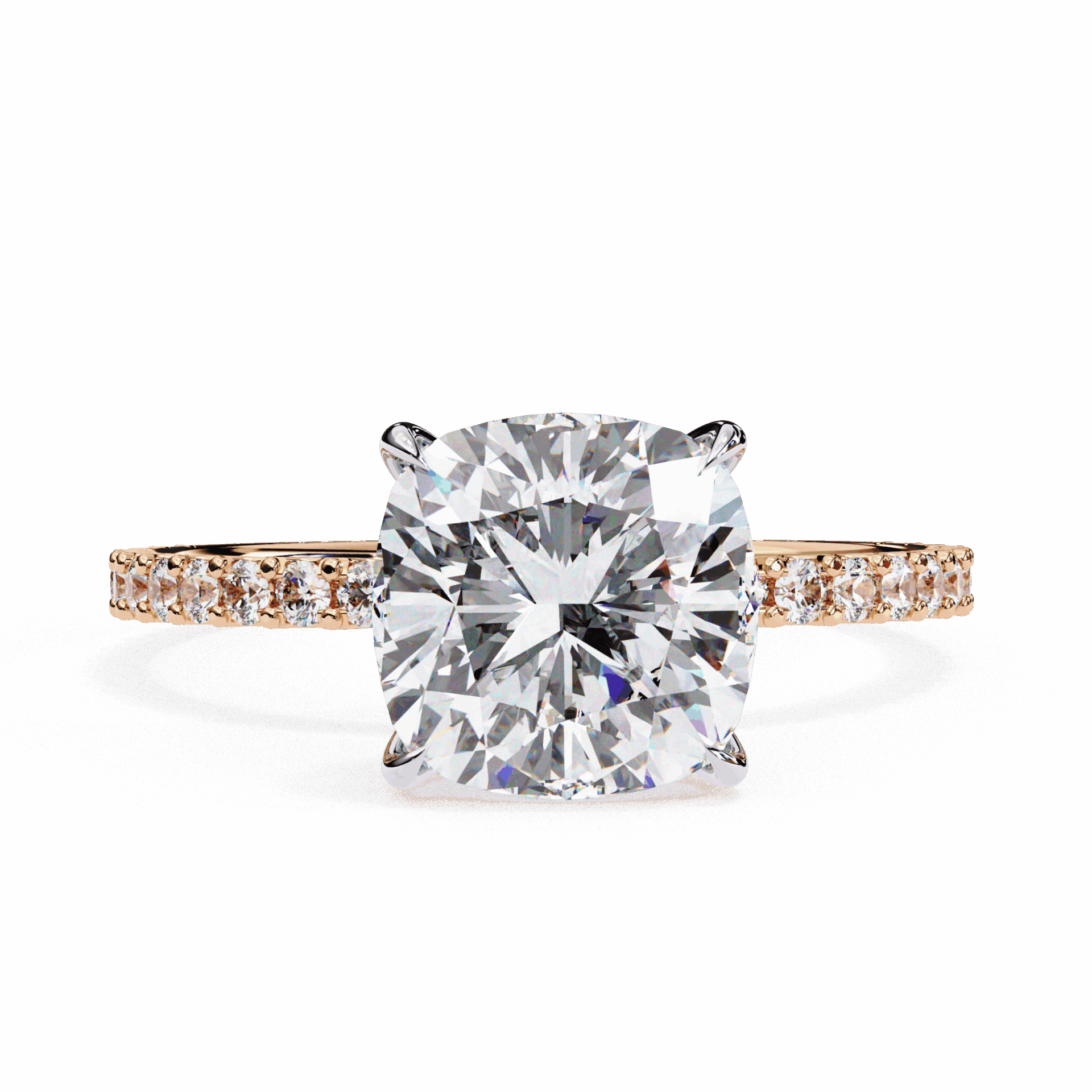 A cushion-cut lab-grown diamond with 37 accent diamonds totaling 2.95 carats. Vintage glow in a contemporary setting.