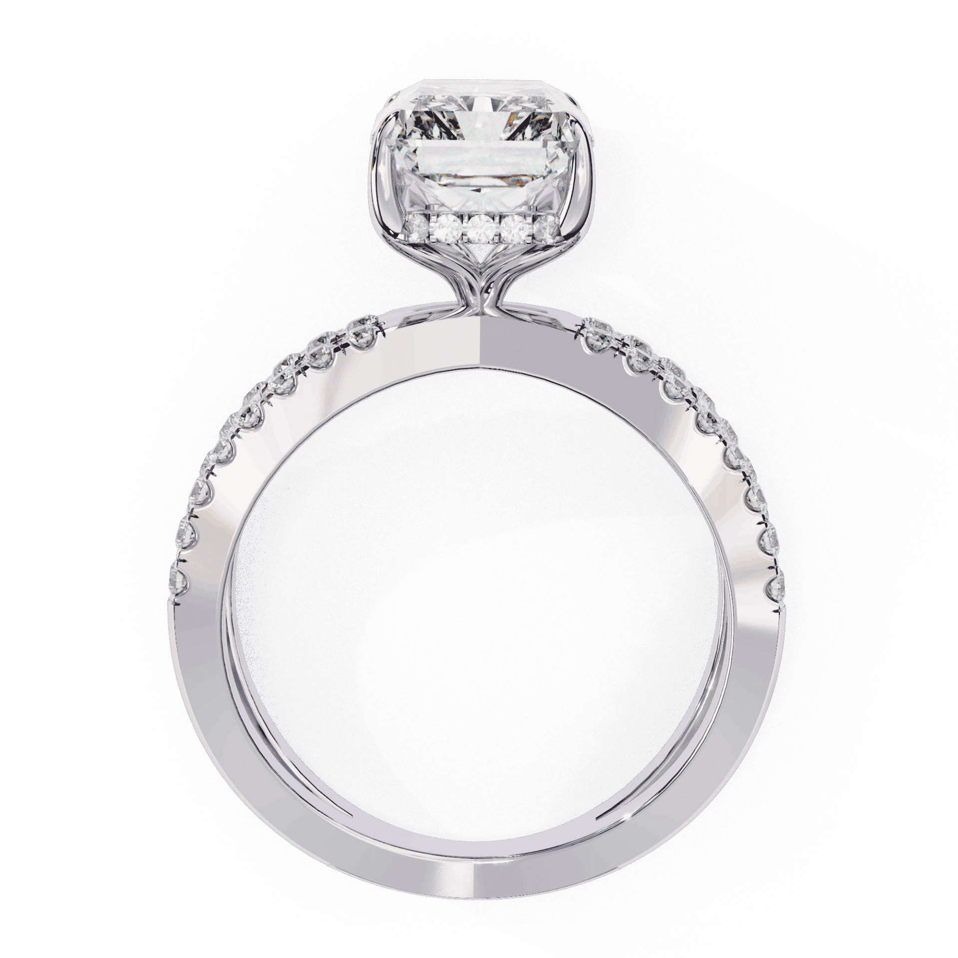 An emerald-cut lab-grown diamond with 49 accent diamonds totaling 2.94 carats. Step-cut flashes in the Eternal Spark setting.
