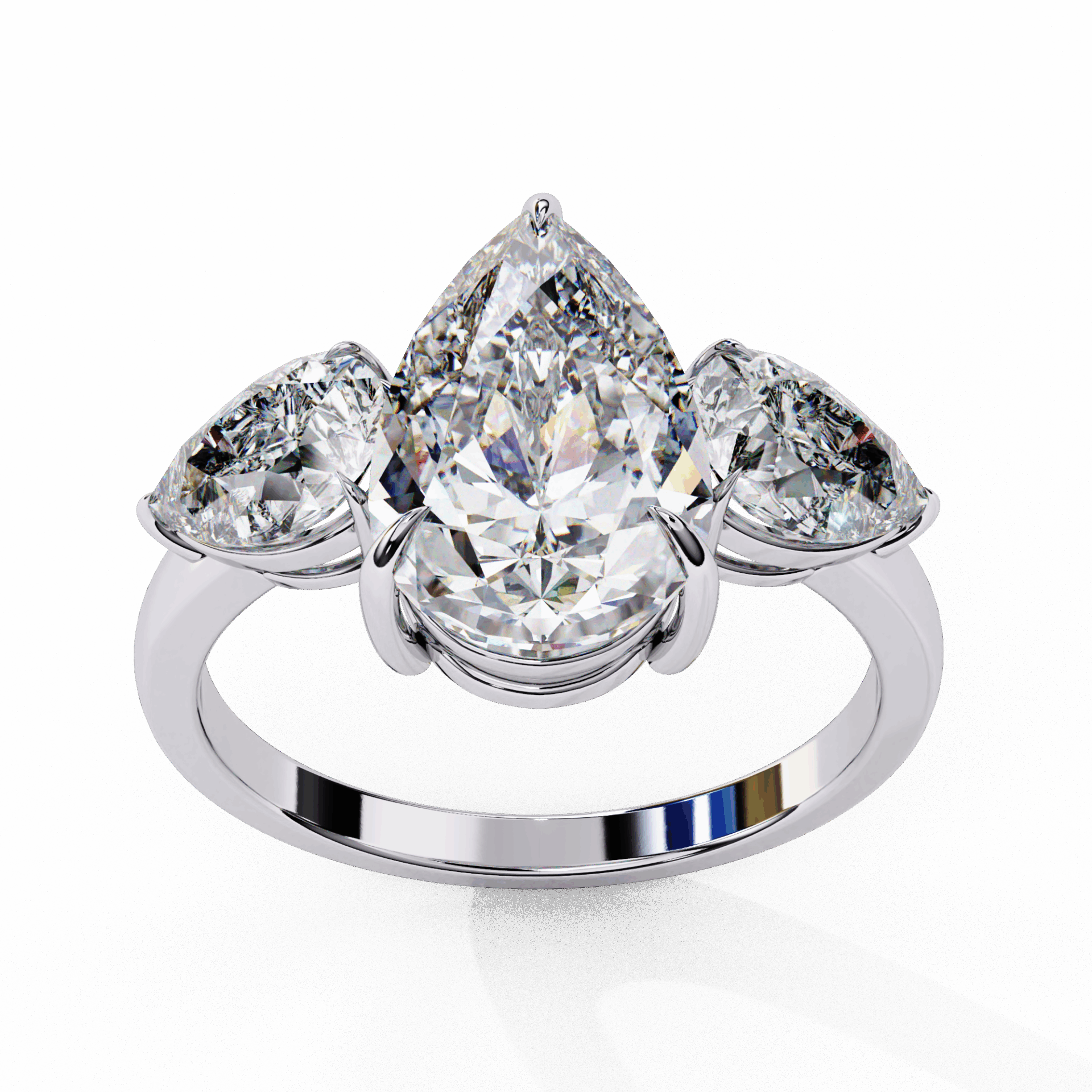 One pear center flanked by two accent stones. Teardrop drama times three.