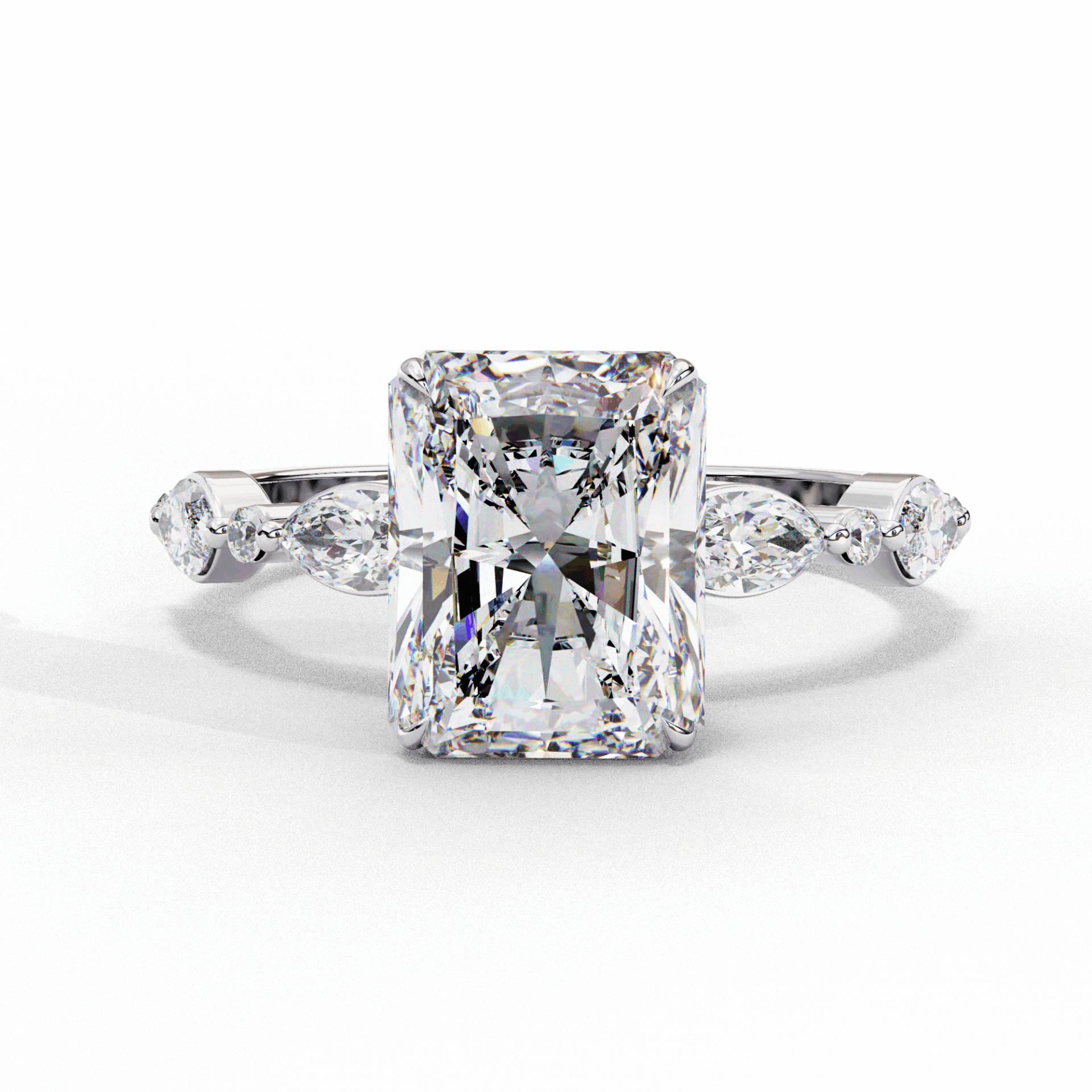 One radiant-cut center with accent diamonds. Brilliant fire for eternal vows.