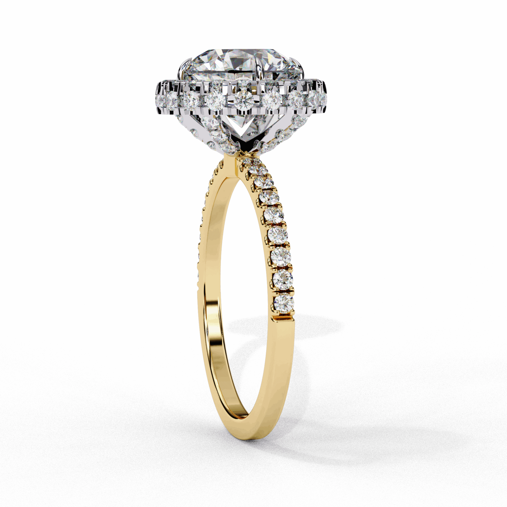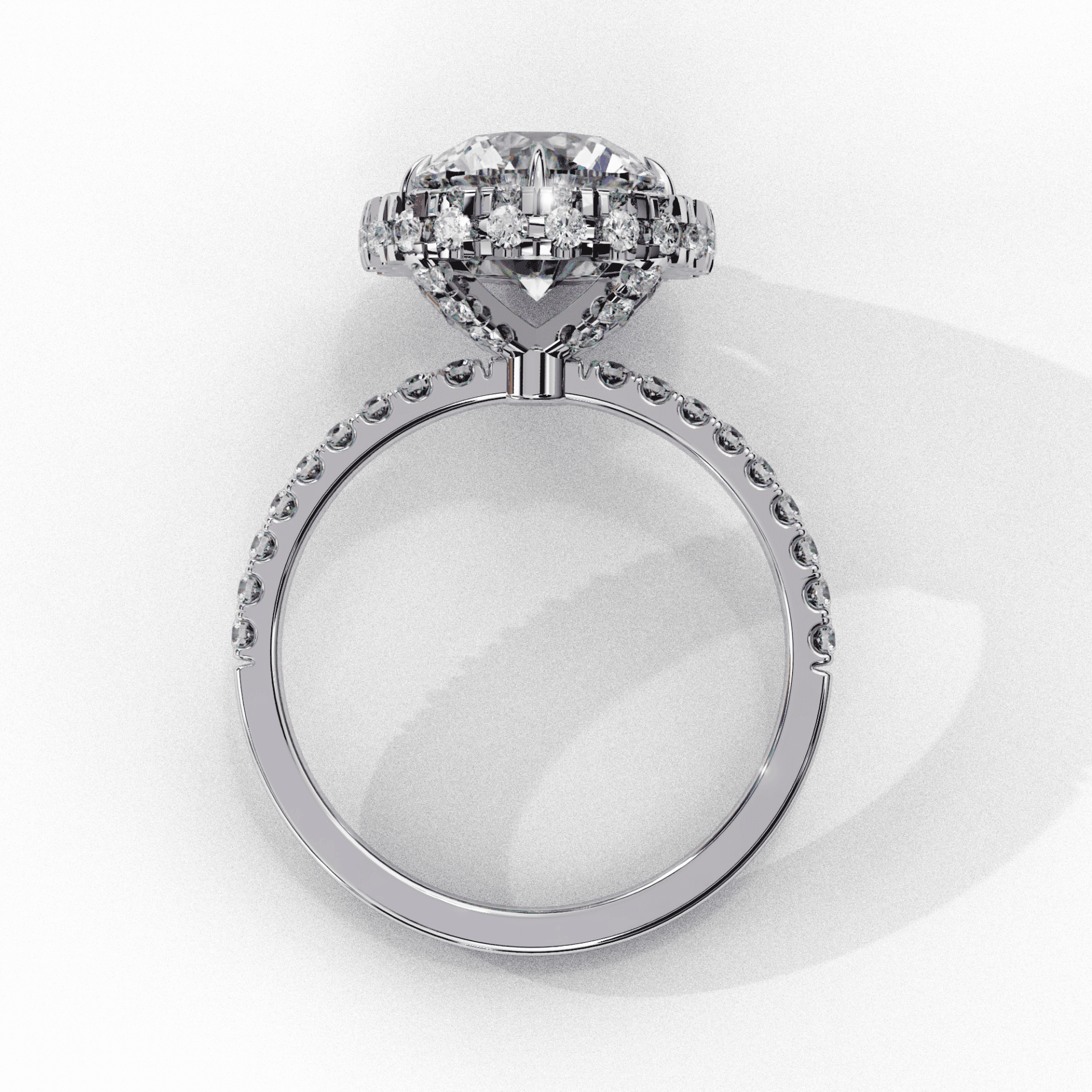A round lab-grown diamond in the Signature setting with 69 diamonds totaling 2.9 carats. The world’s most brilliant cut in our most refined setting.