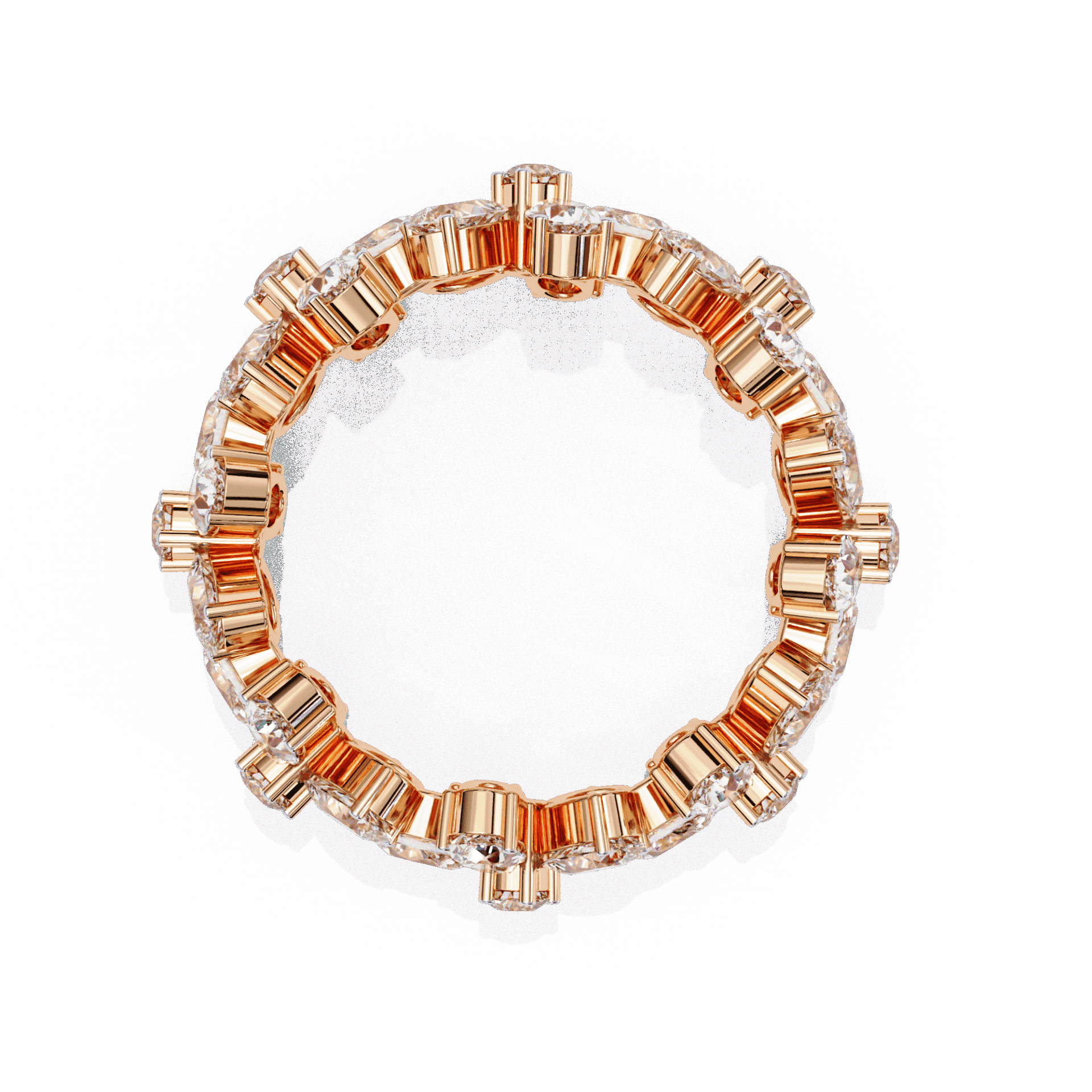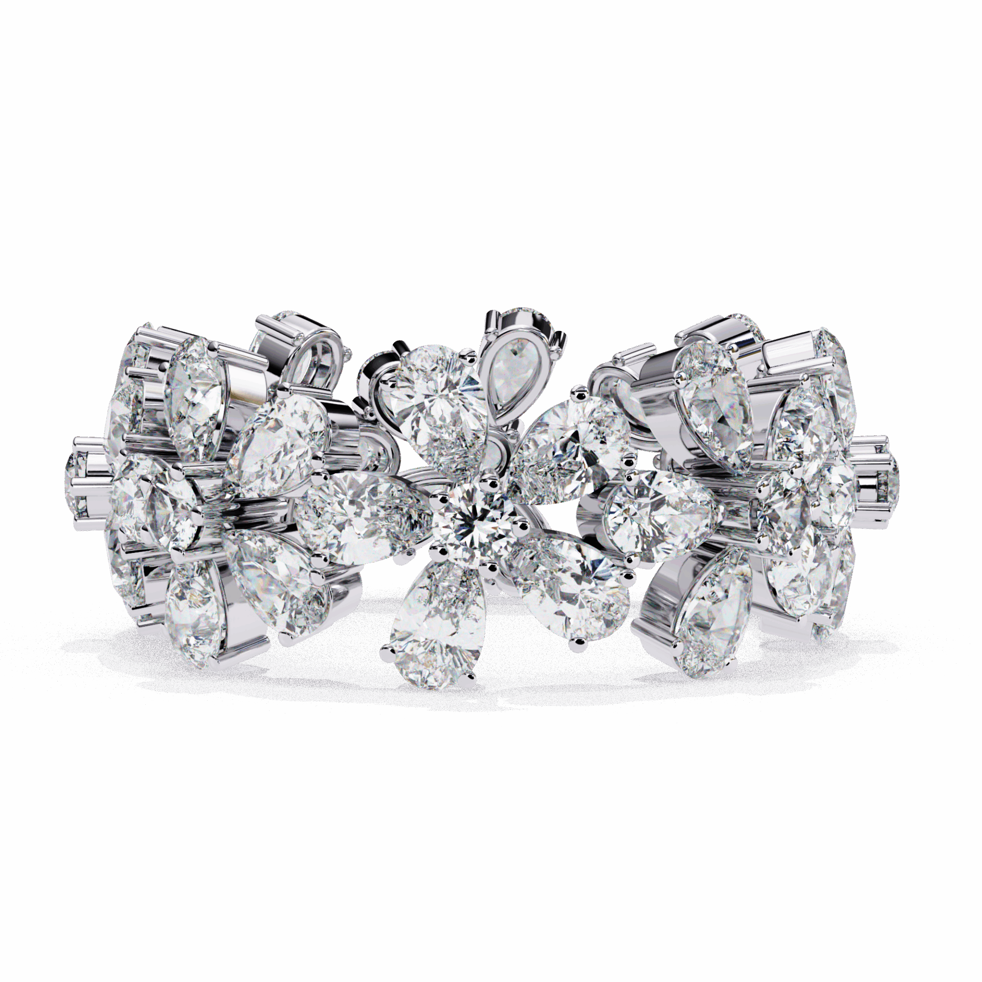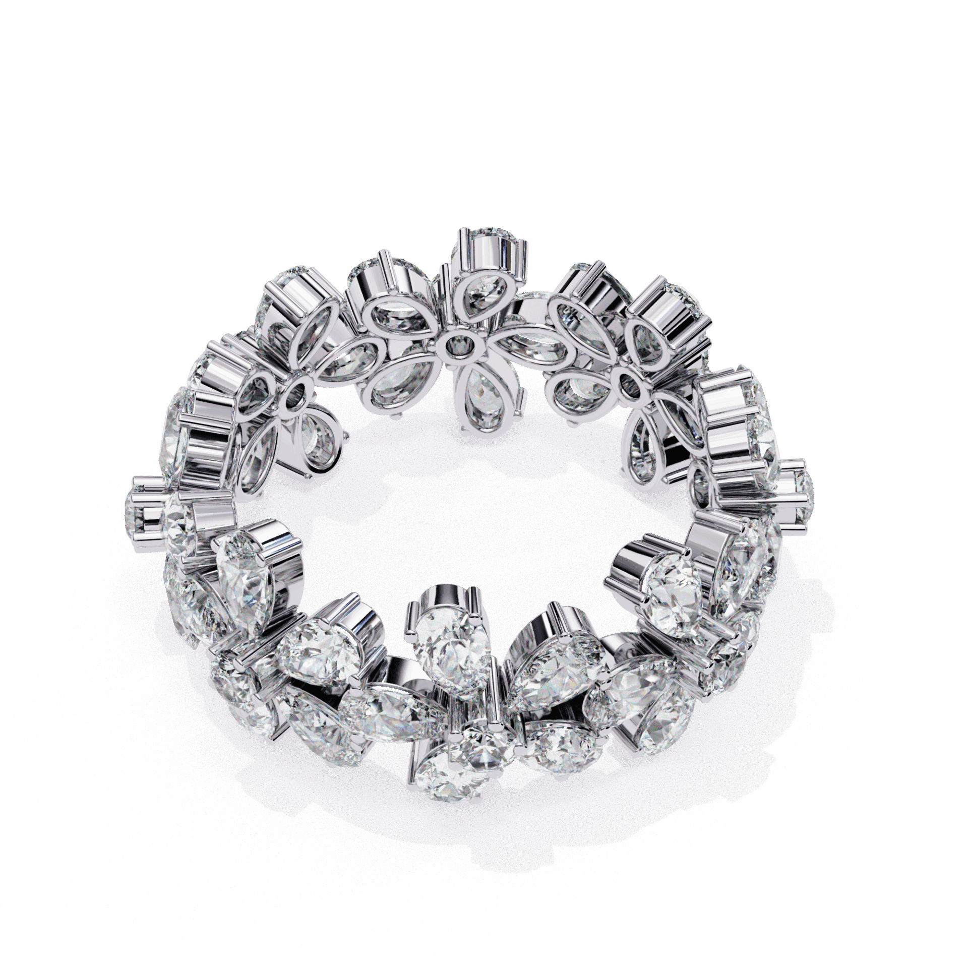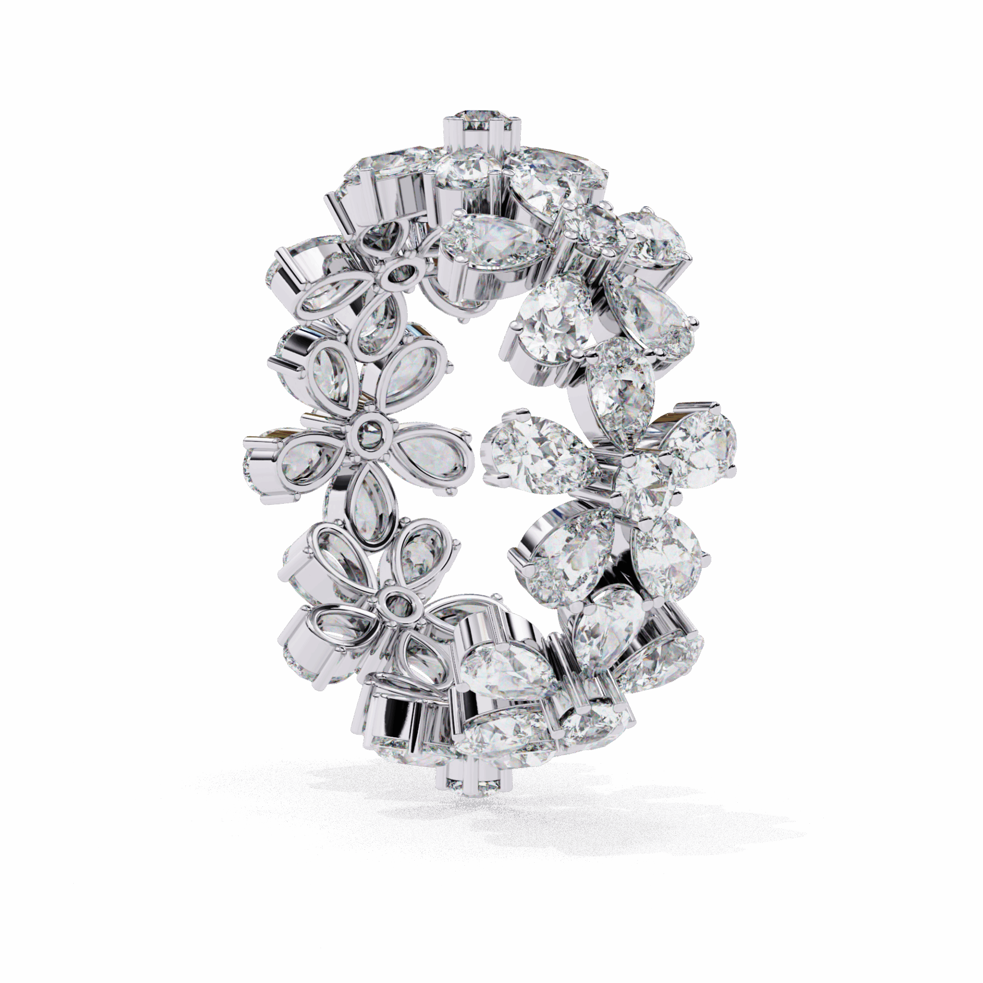48 lab-grown diamonds – pear and round cuts – totaling 4.17 carats in a statement band with twilight inspiration. The pear shapes add direction and drama, the rounds add continuous fire.