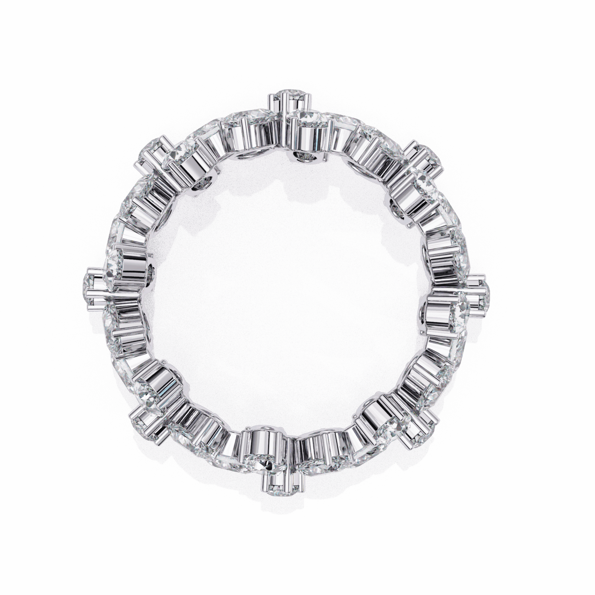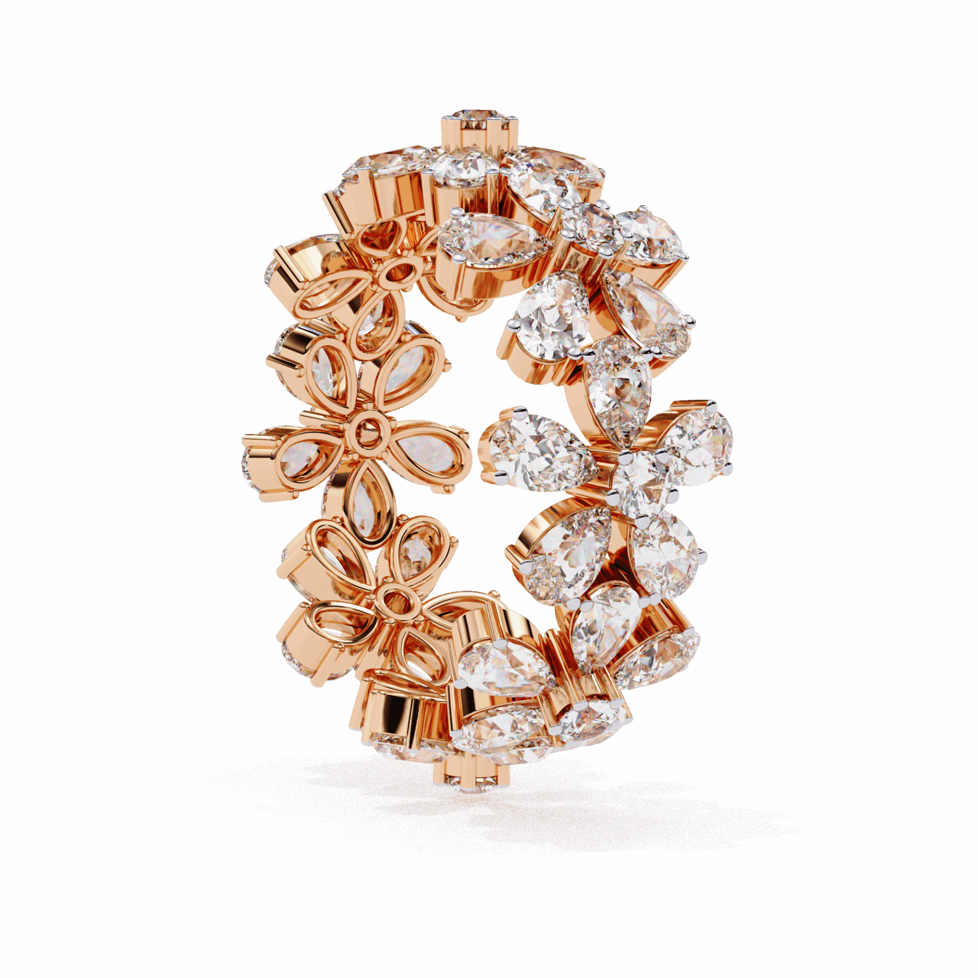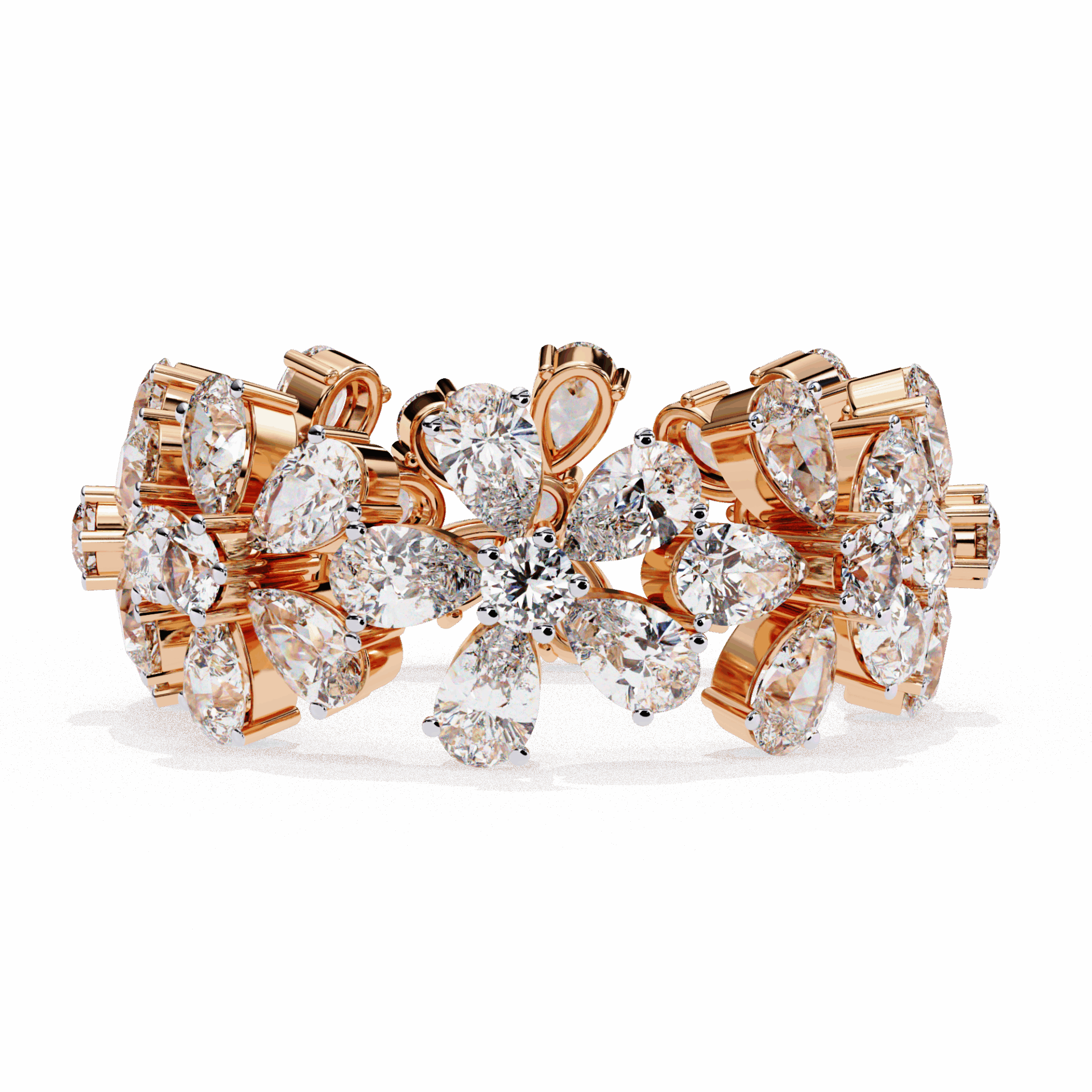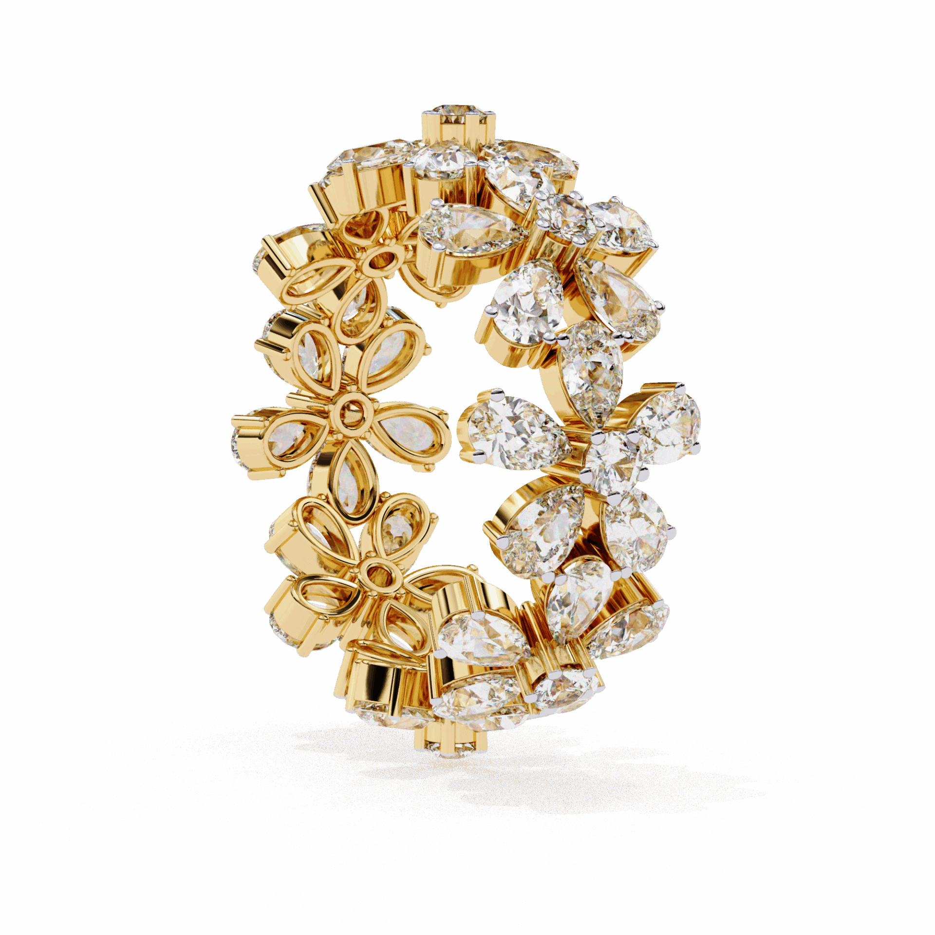 48 lab-grown diamonds – pear and round cuts – totaling 4.17 carats in a statement band with twilight inspiration. The pear shapes add direction and drama, the rounds add continuous fire.
