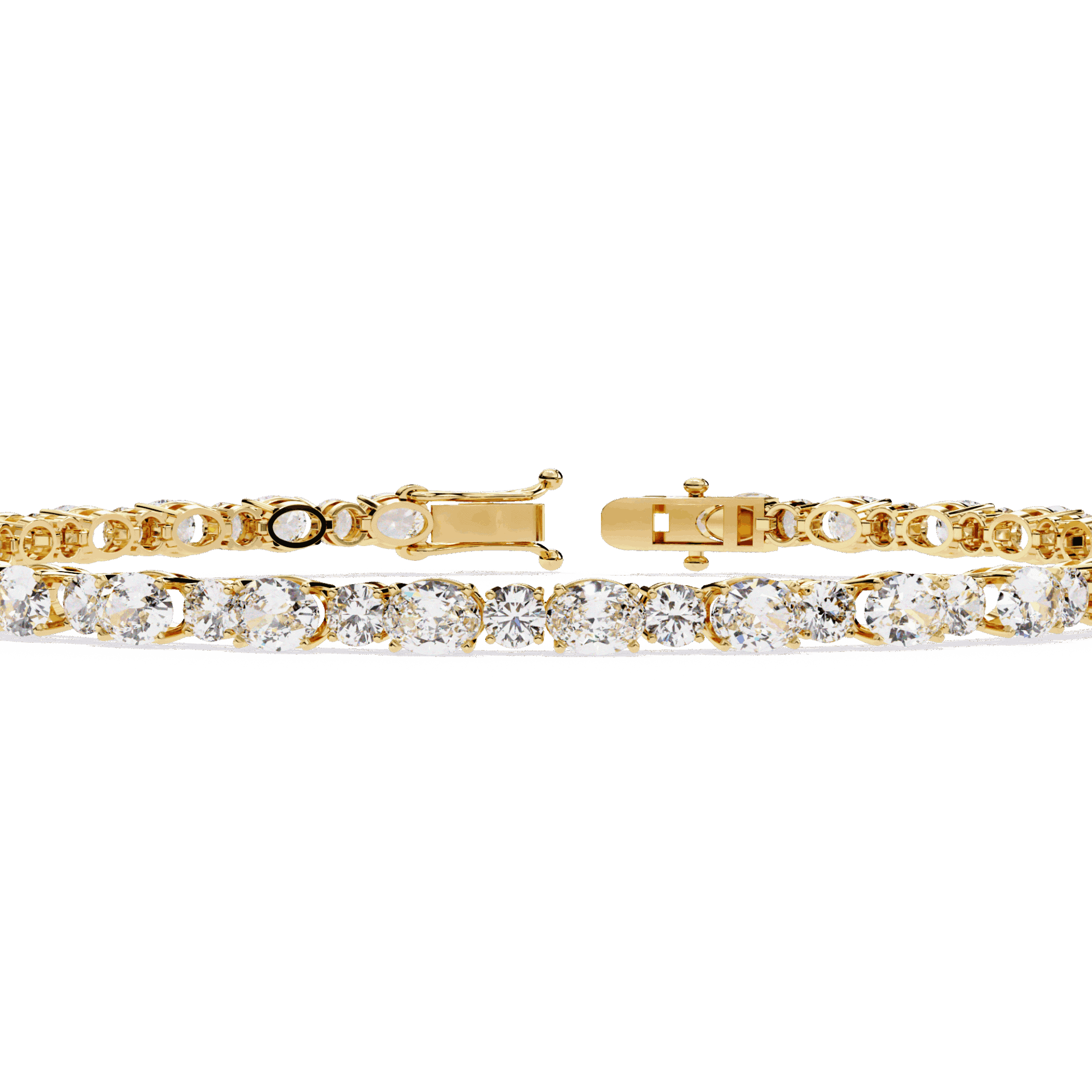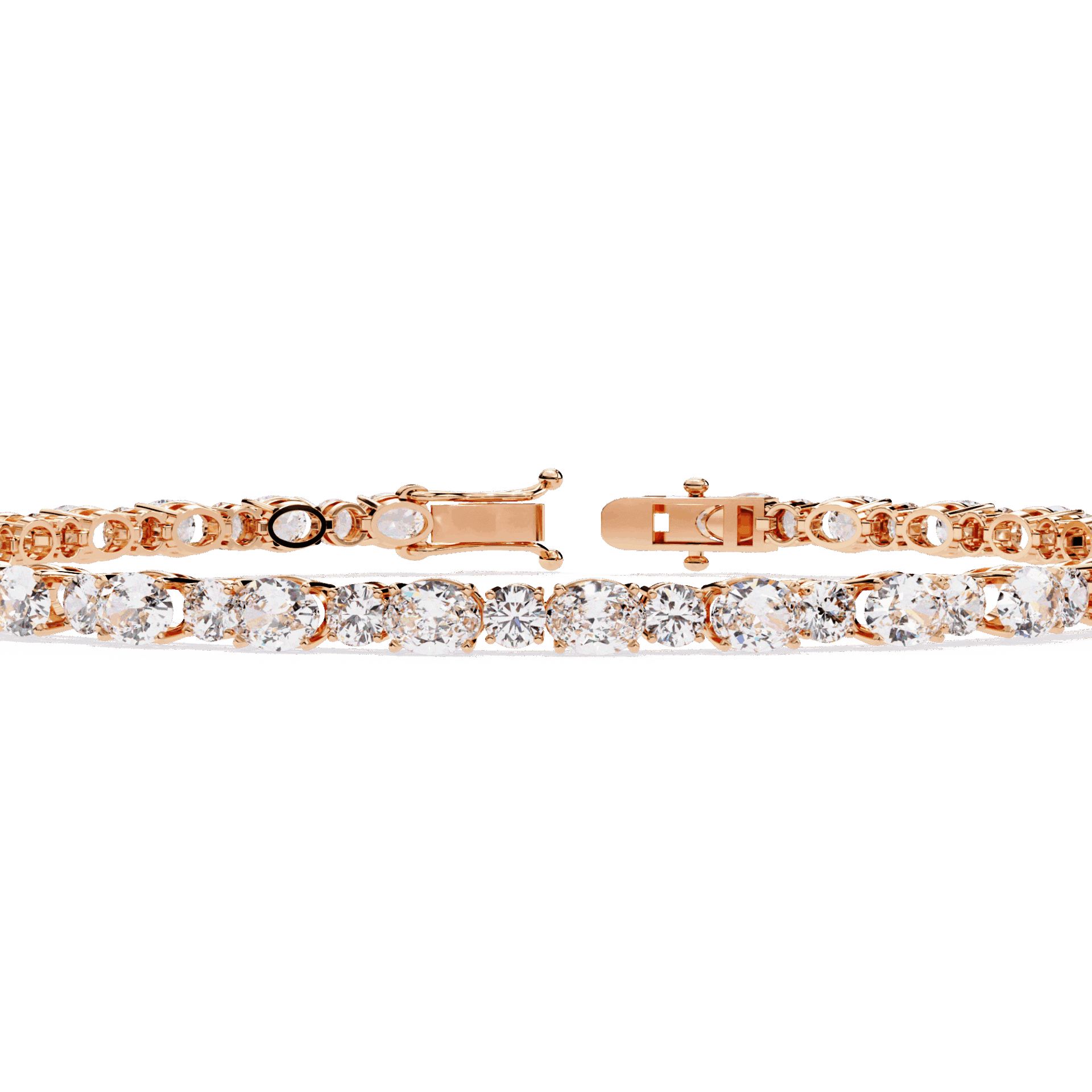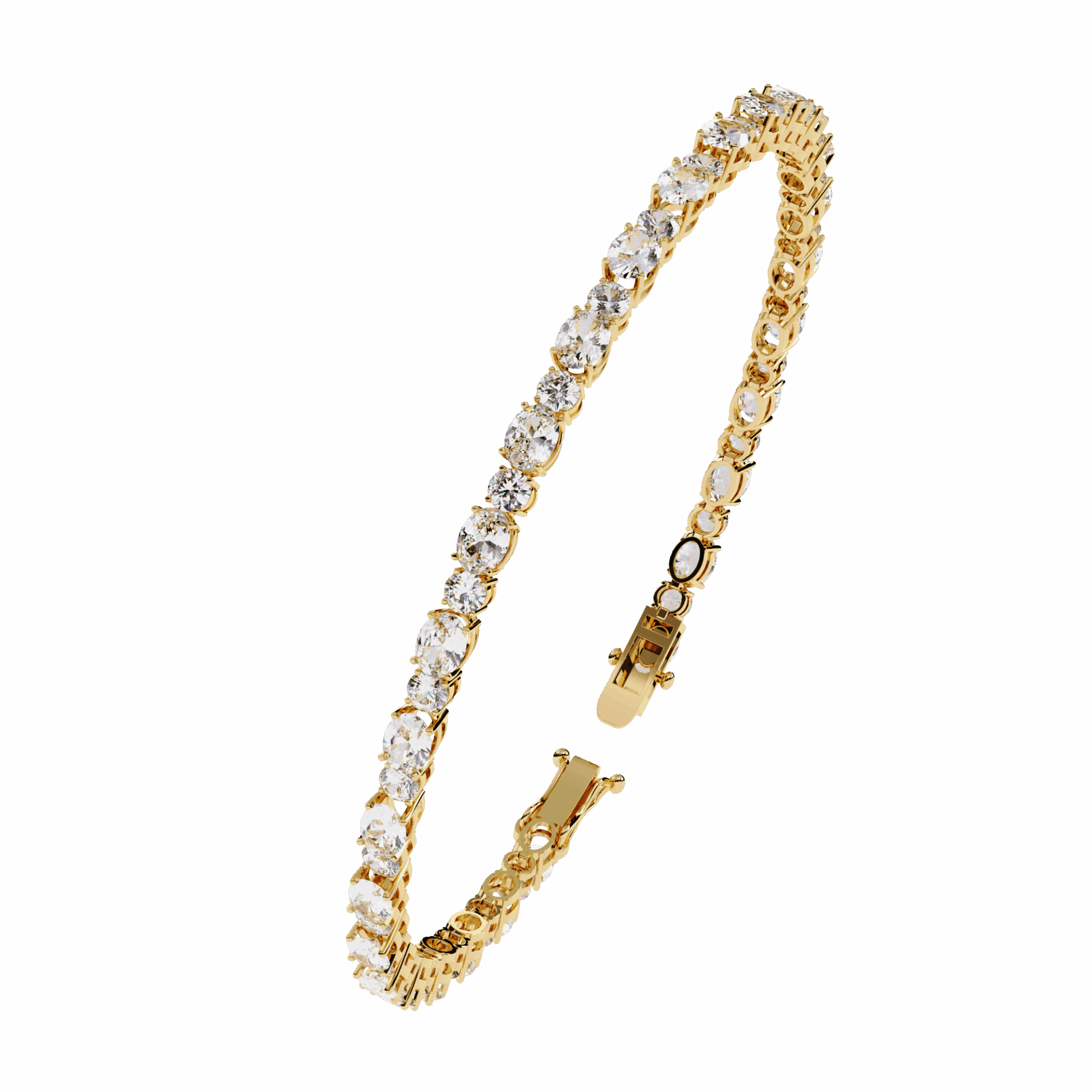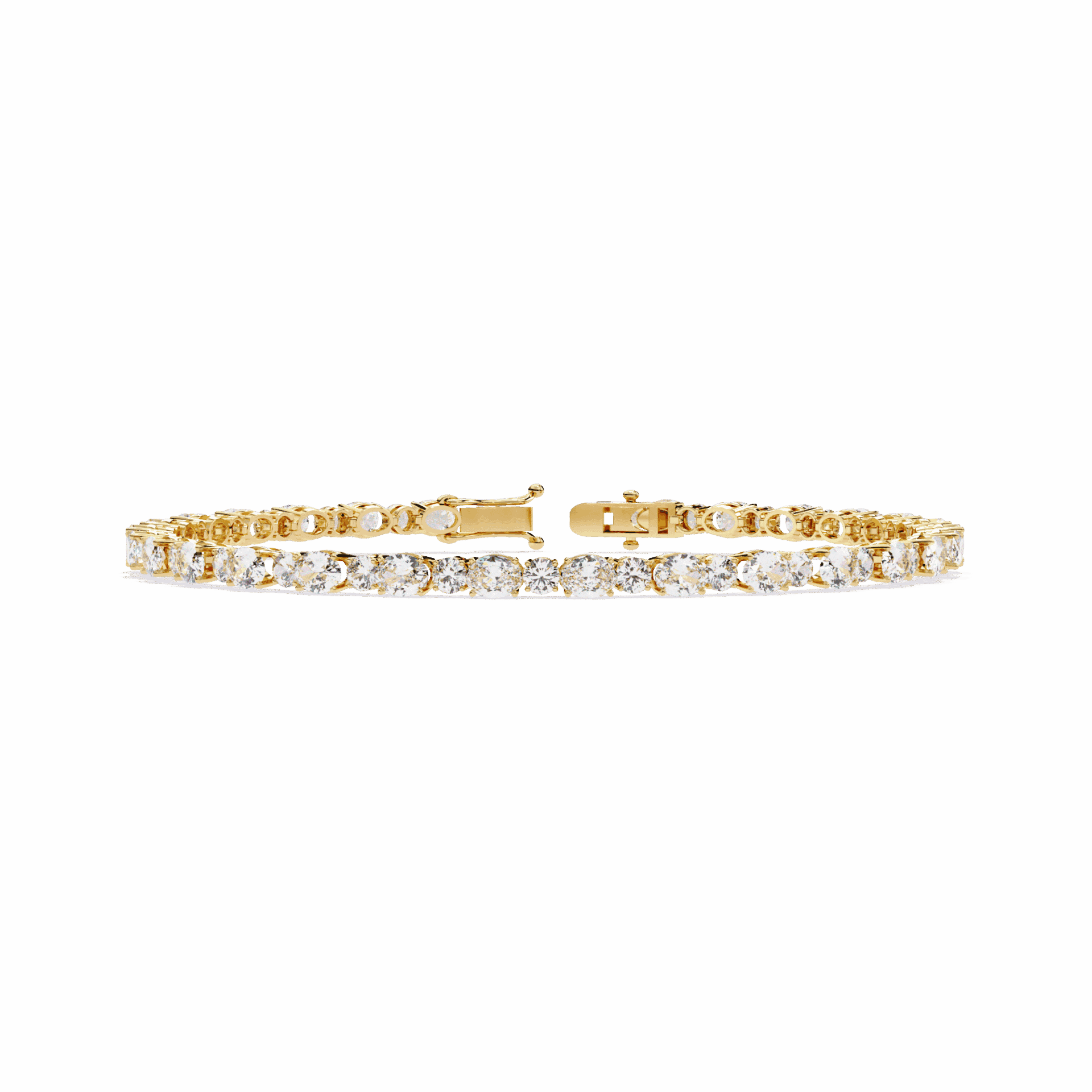 56 lab-grown diamonds - oval cuts and round cuts alternating - creating a tennis bracelet with built-in rhythm. The ovals bring elegance, the rounds bring brilliance. Neither dominates. Both shine.