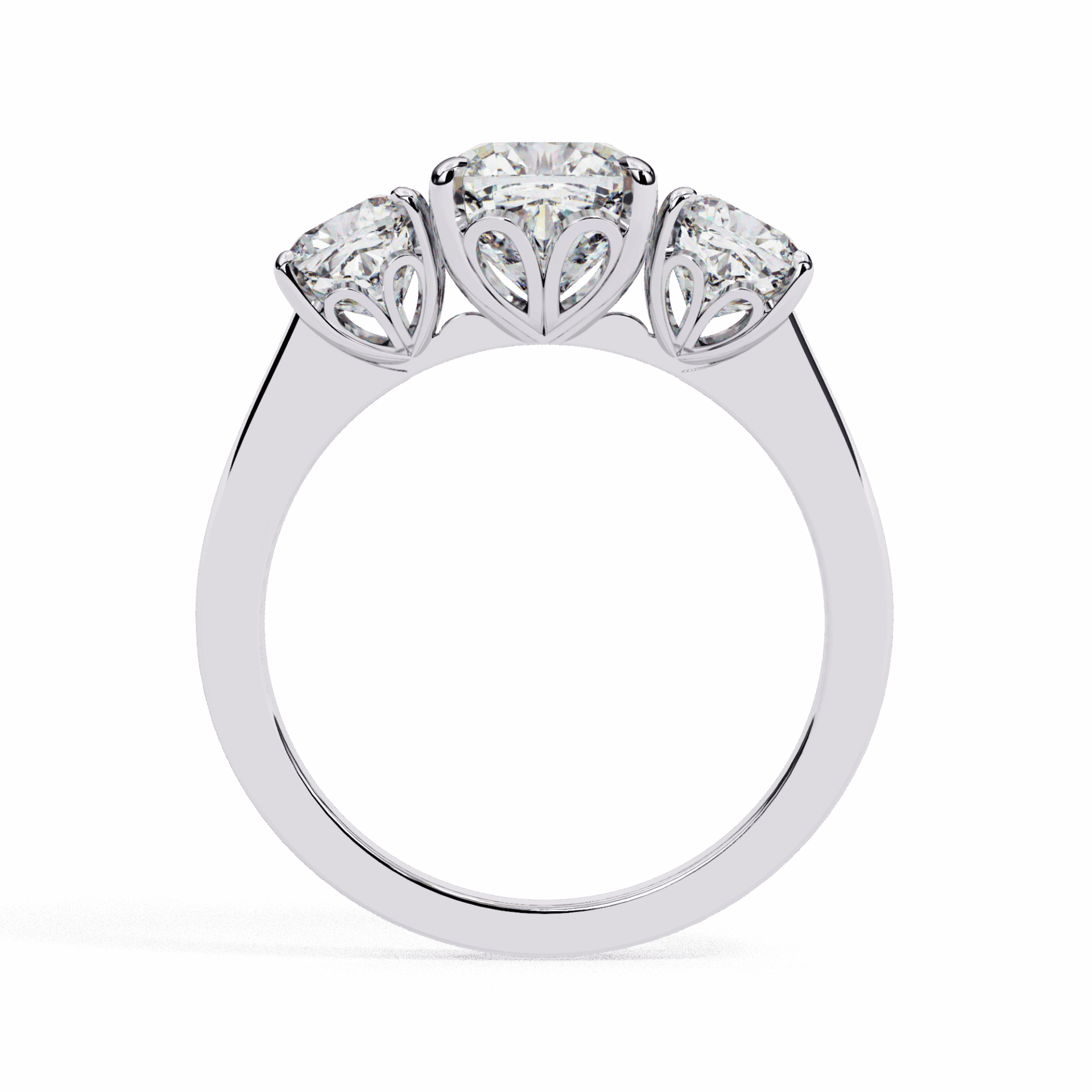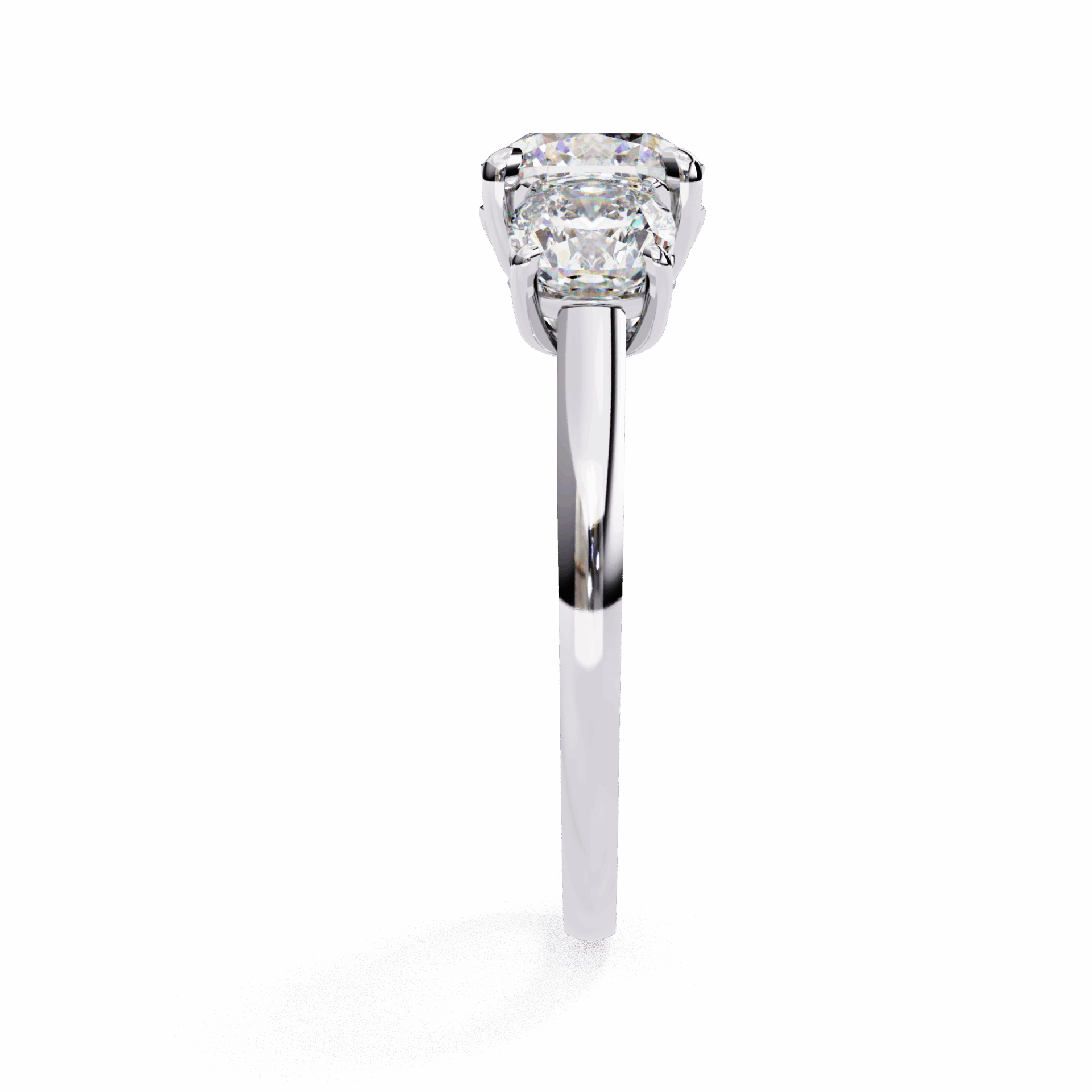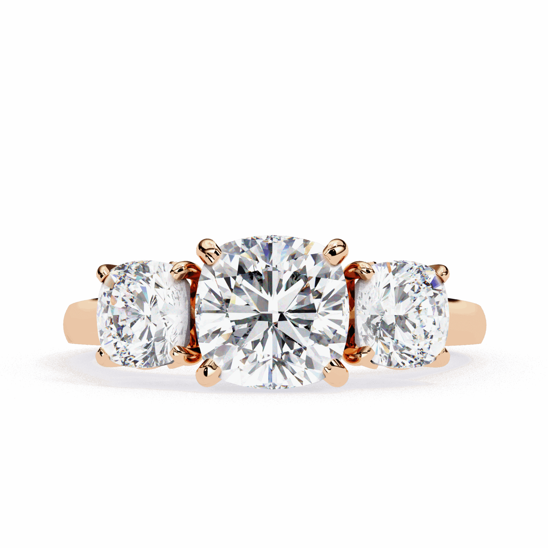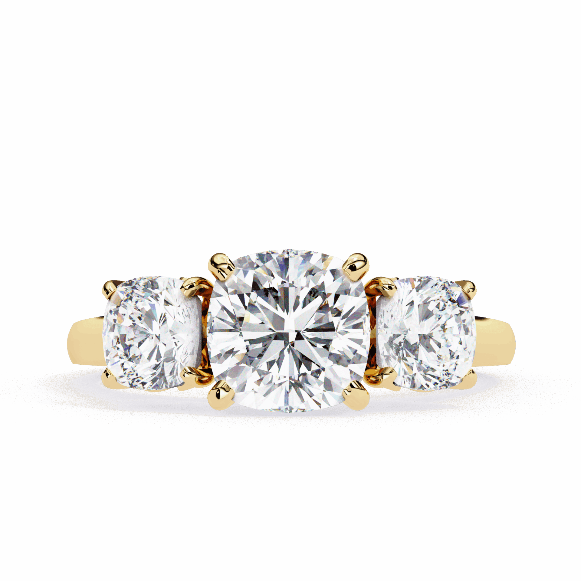 4 carats of cushion romance in the three-stone format. Past, present, and future at statement scale.