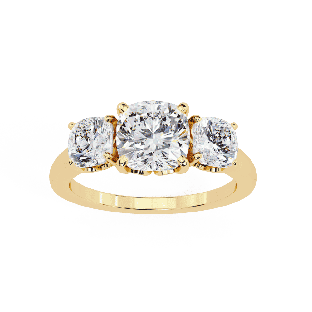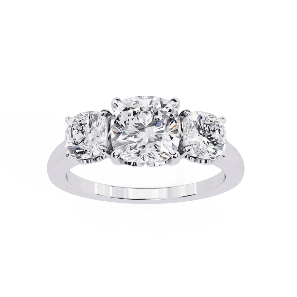 A cushion-cut lab-grown diamond with 3 accent diamonds totaling 3.96 carats in a three-stone setting. Romantic grandeur with symbolic meaning.