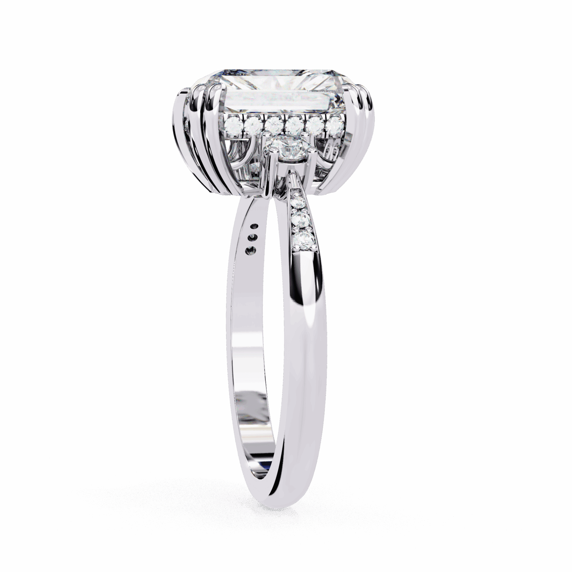 A radiant-cut lab-grown diamond with 29 accent diamonds totaling 3.95 carats in a three-stone setting. Substantial geometric sparkle with symbolic meaning.