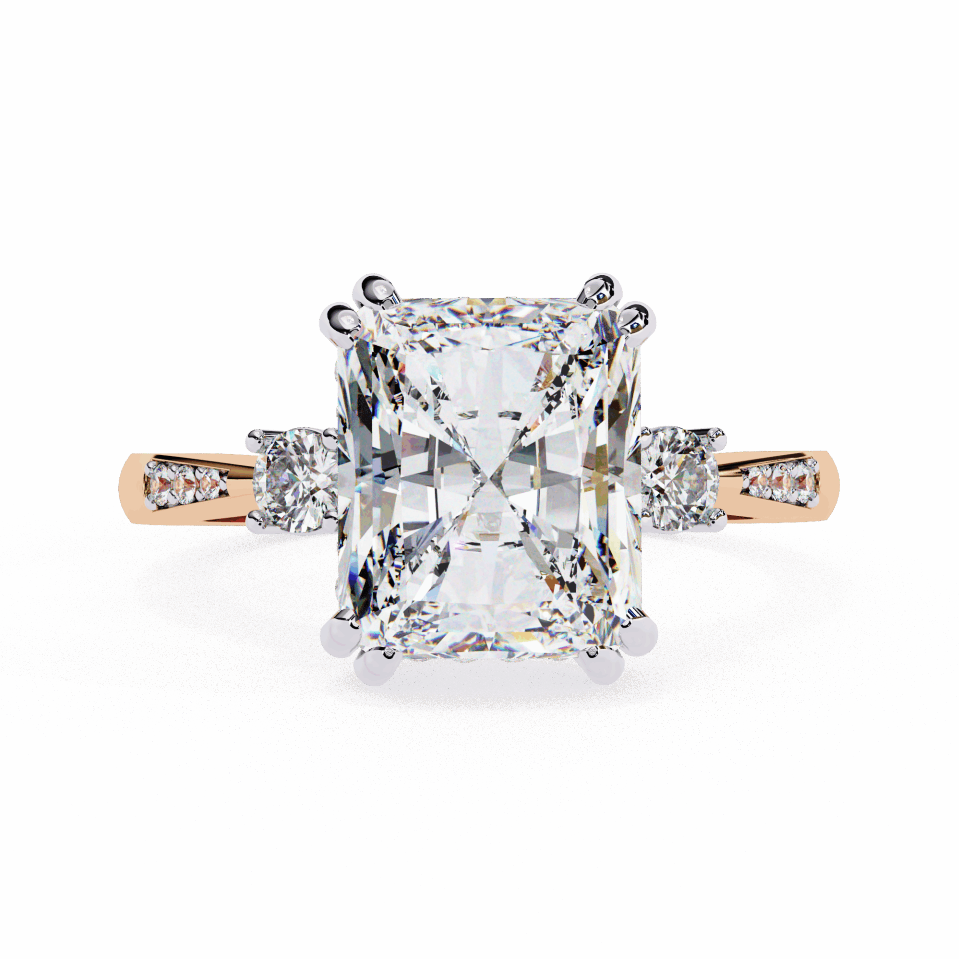 One radiant center with two accent stones. 4 carats of geometric brilliance.