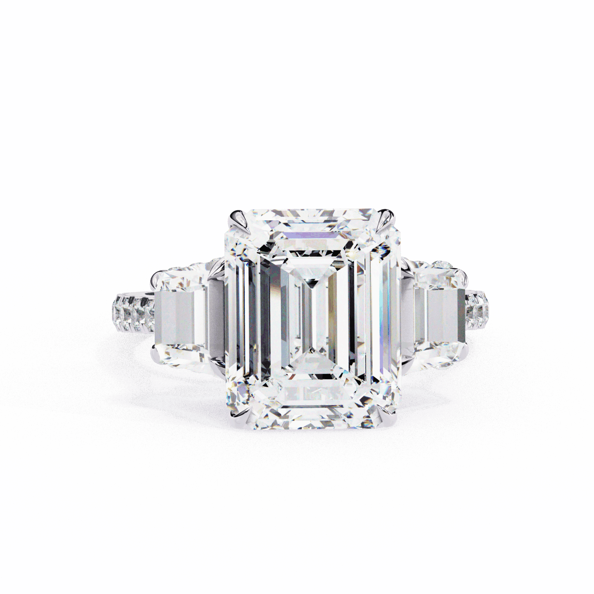 An emerald-cut lab-grown diamond with baguette accent stones, 37 diamonds totaling 5.2 carats. All step cuts for pure architectural elegance.