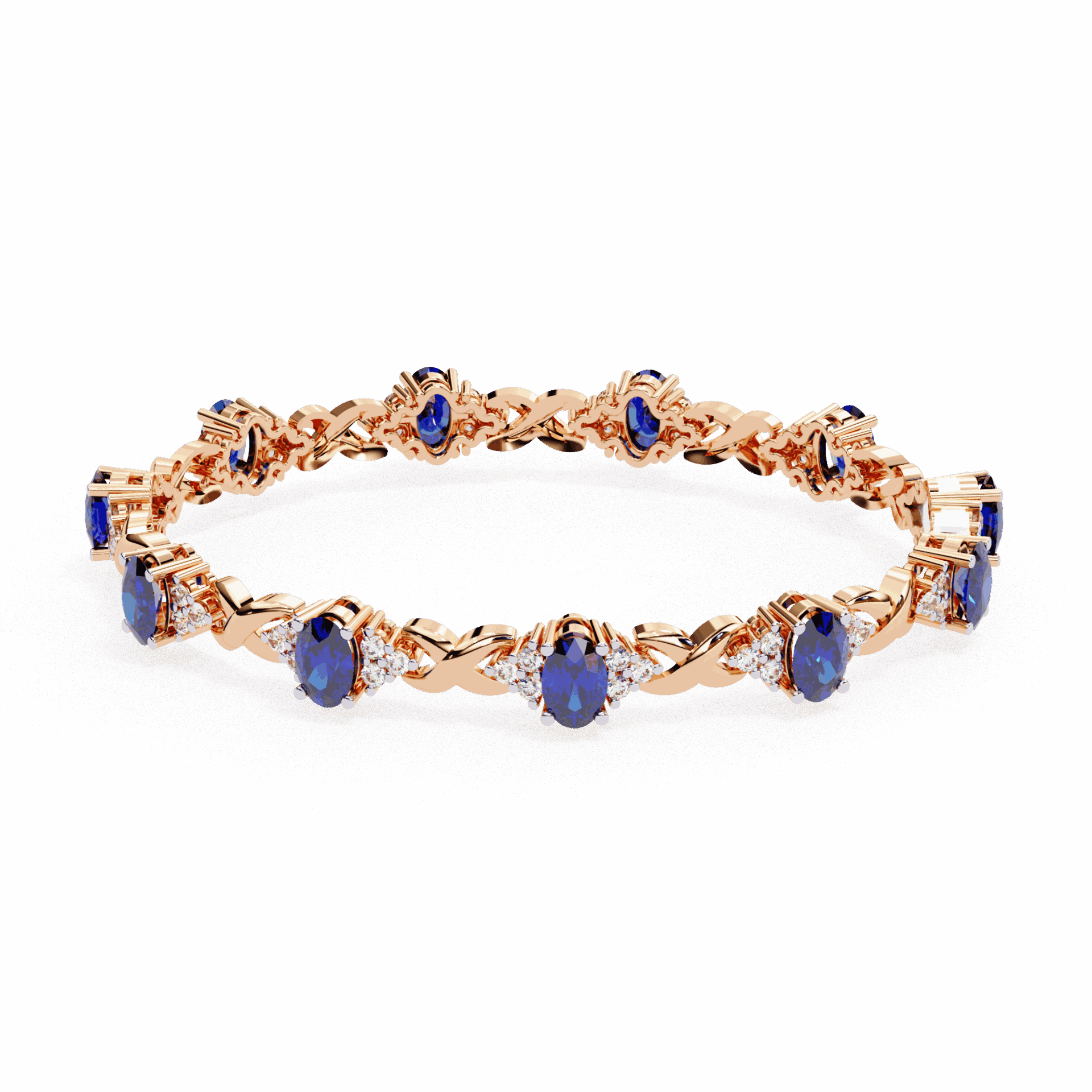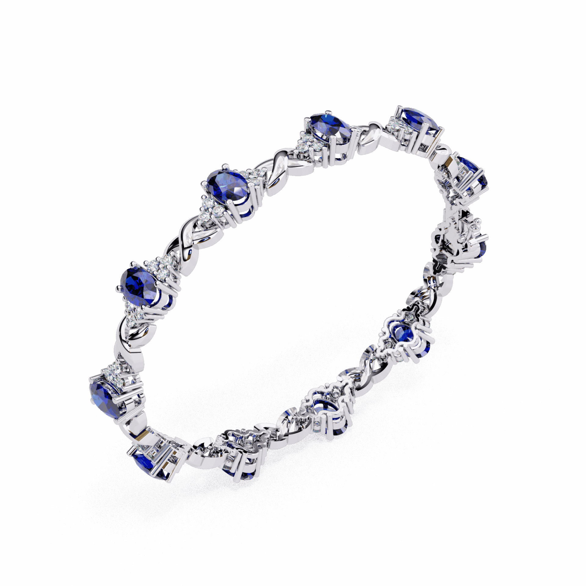 Blue sapphires and round lab-grown diamonds bloom in an alternating floral pattern along the band. 77 stones total - oval sapphires for colour, round diamonds for sparkle. The combination is striking.