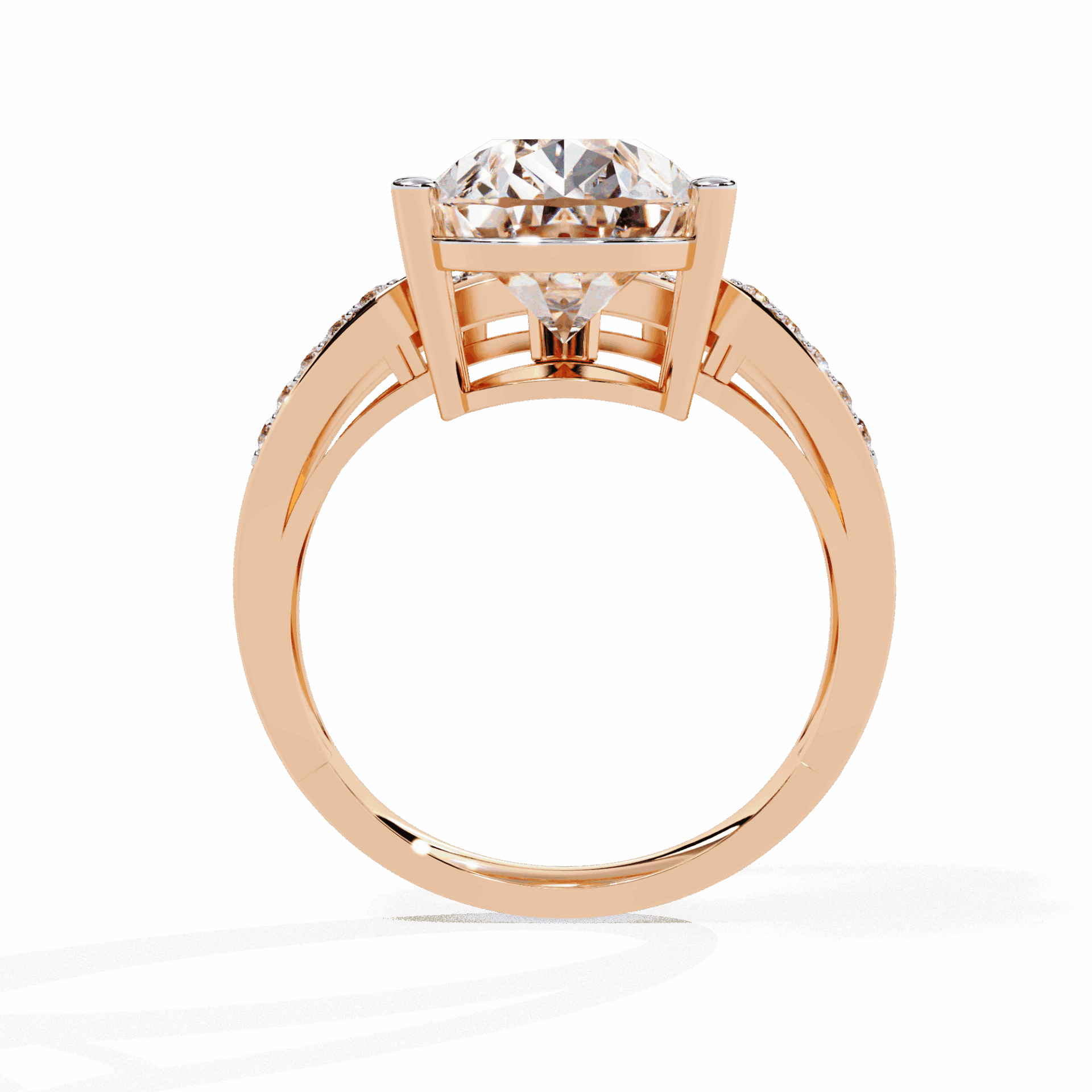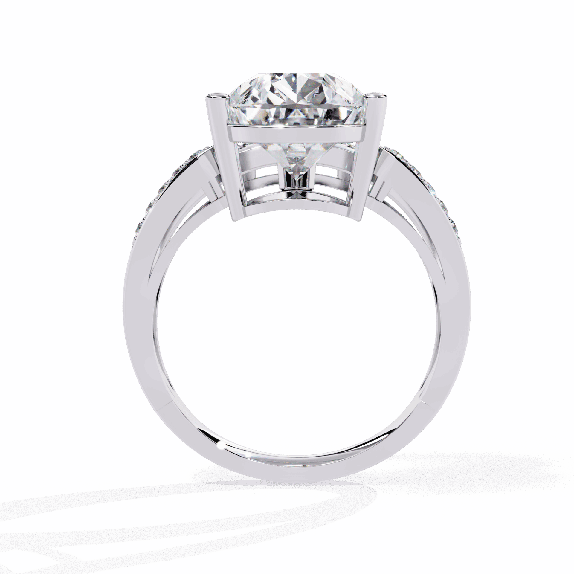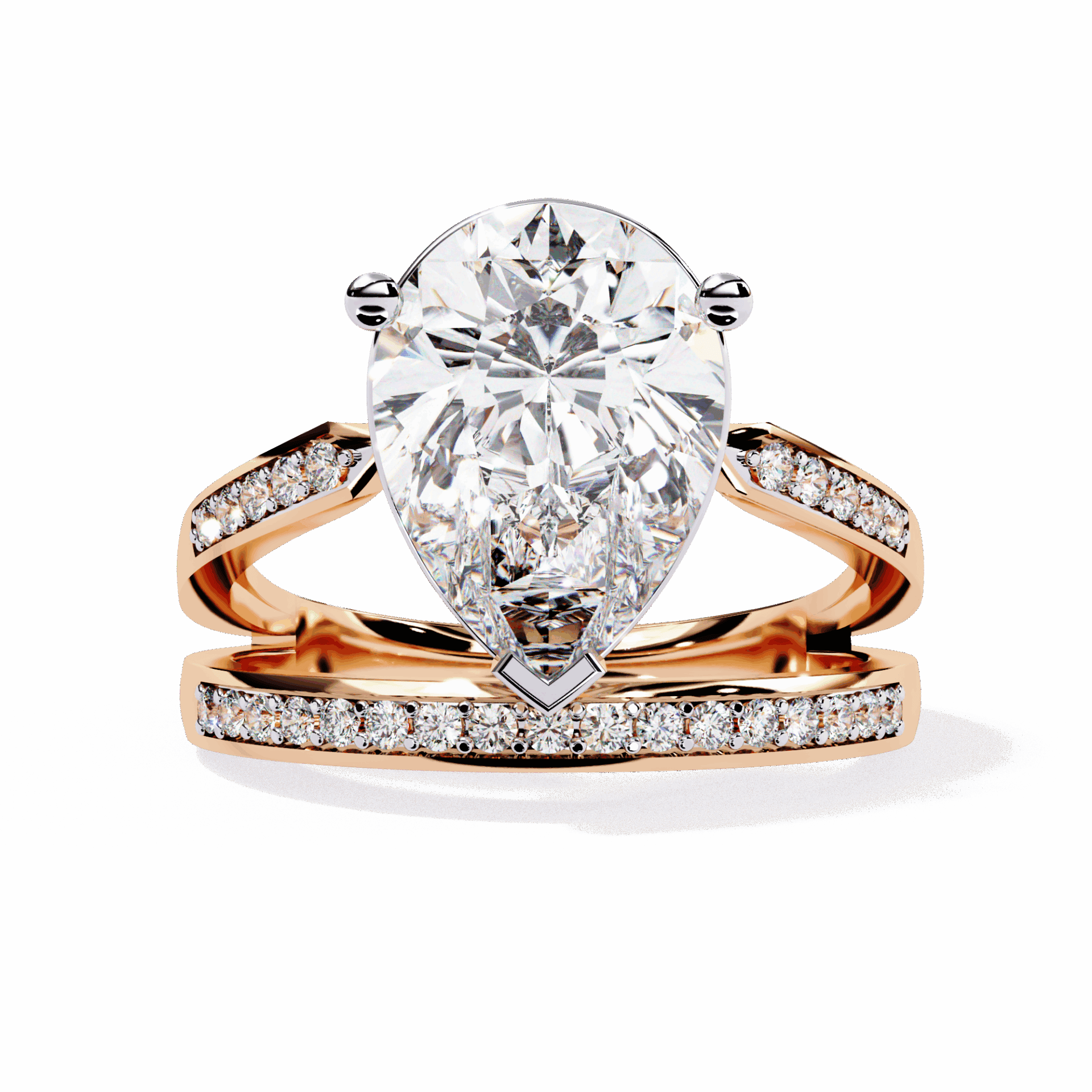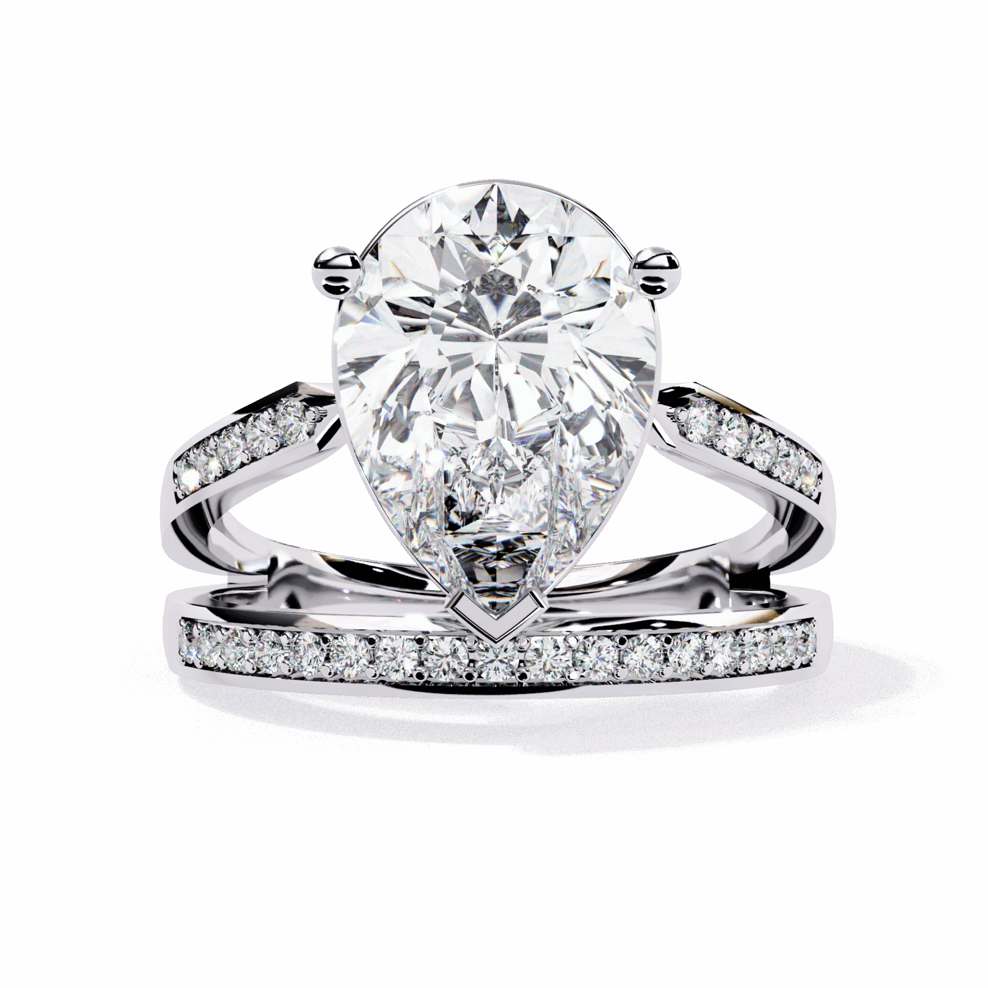 Bezel settings protect the pear’s delicate point while framing its dramatic direction. Nearly 6 carats of secure statement.