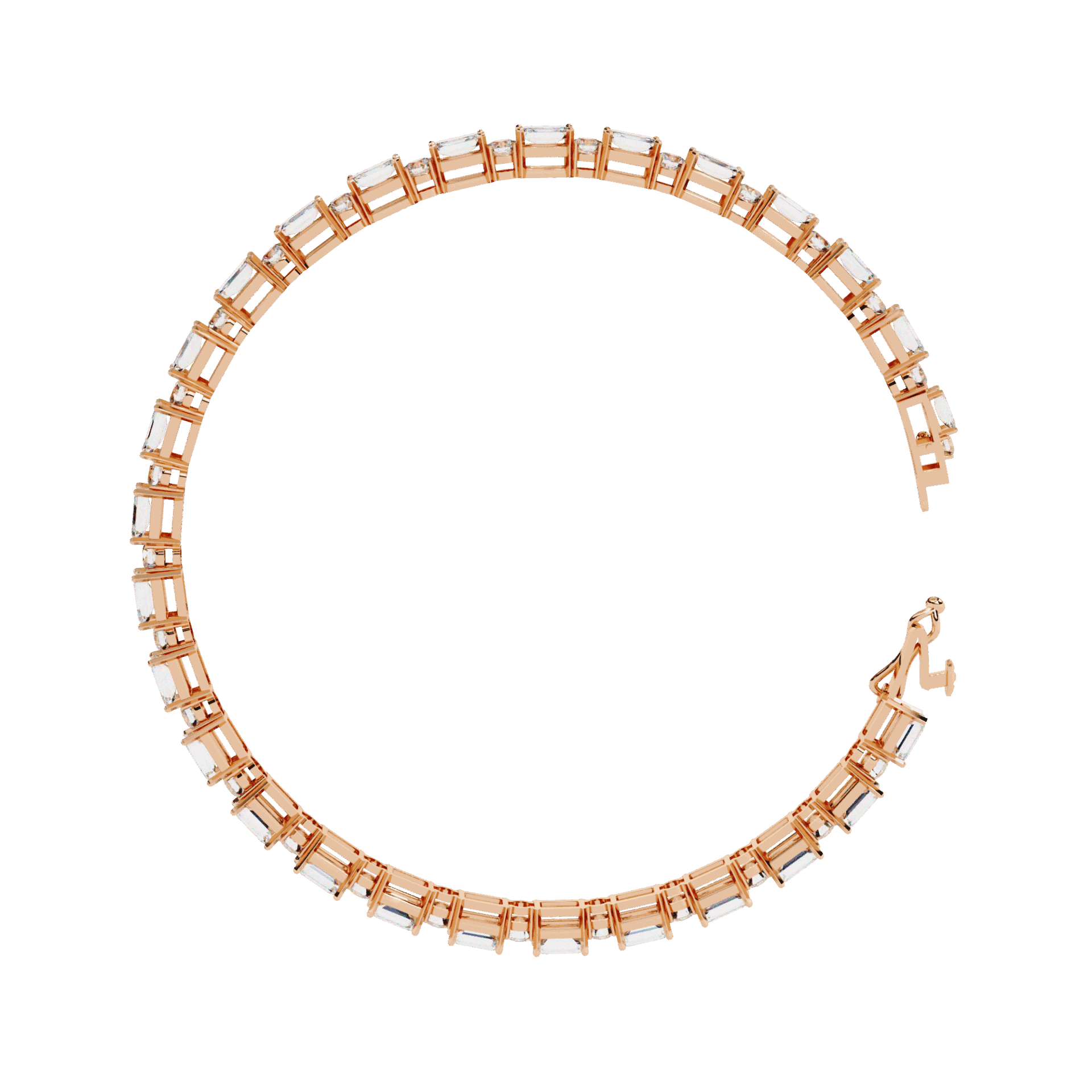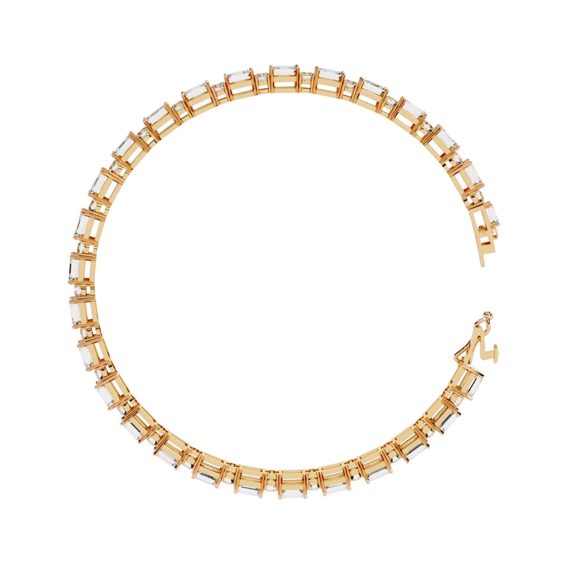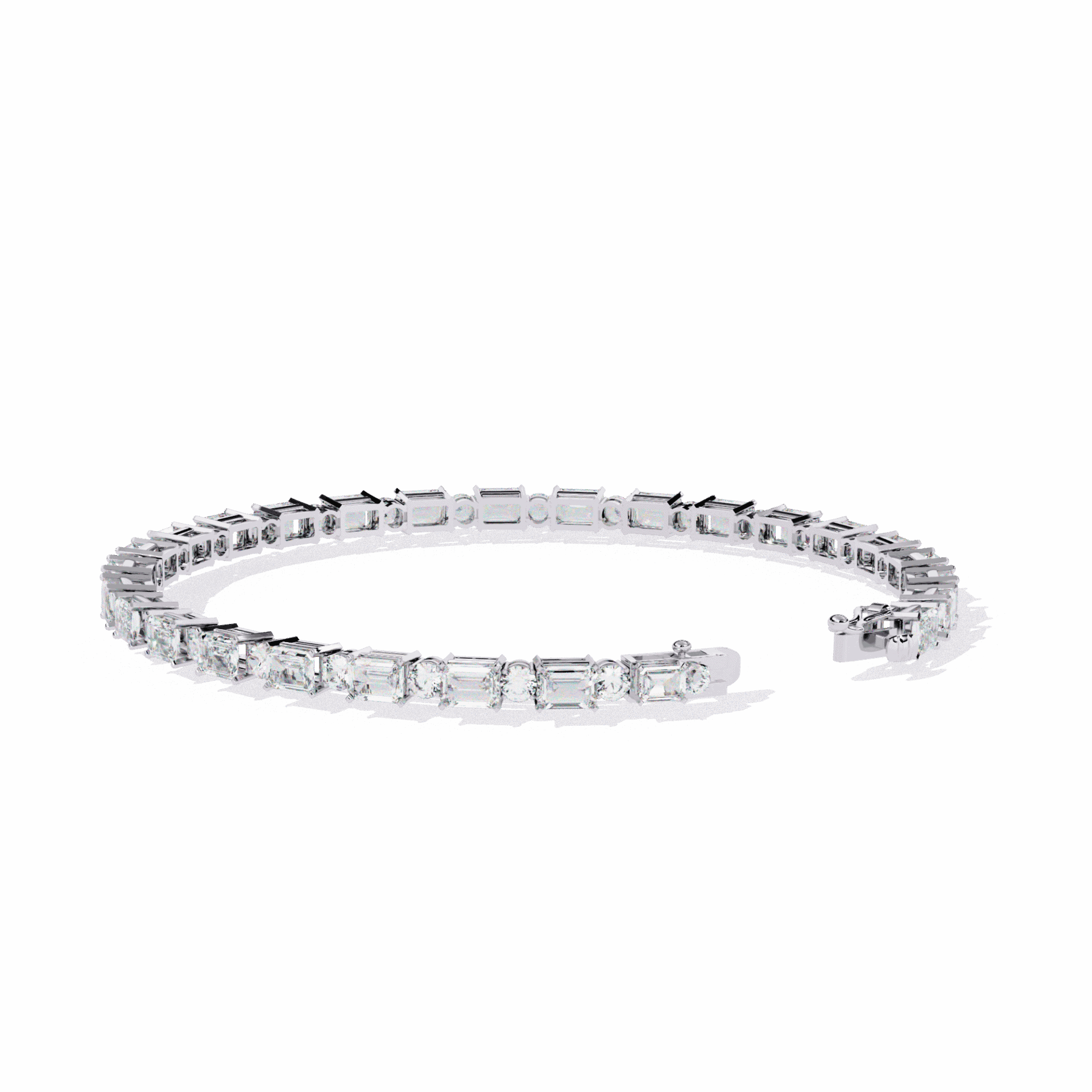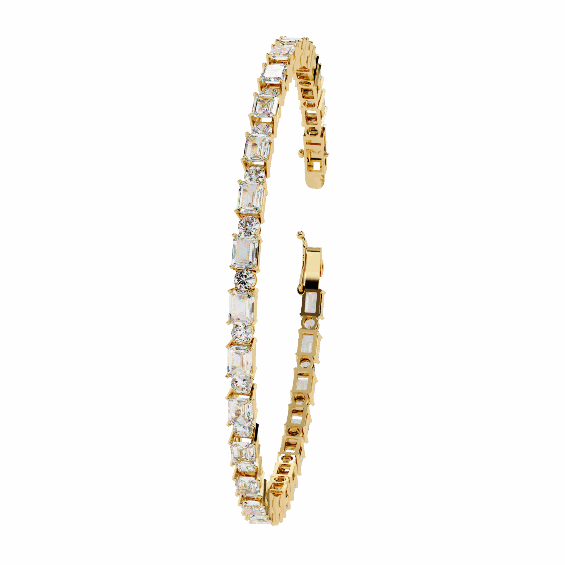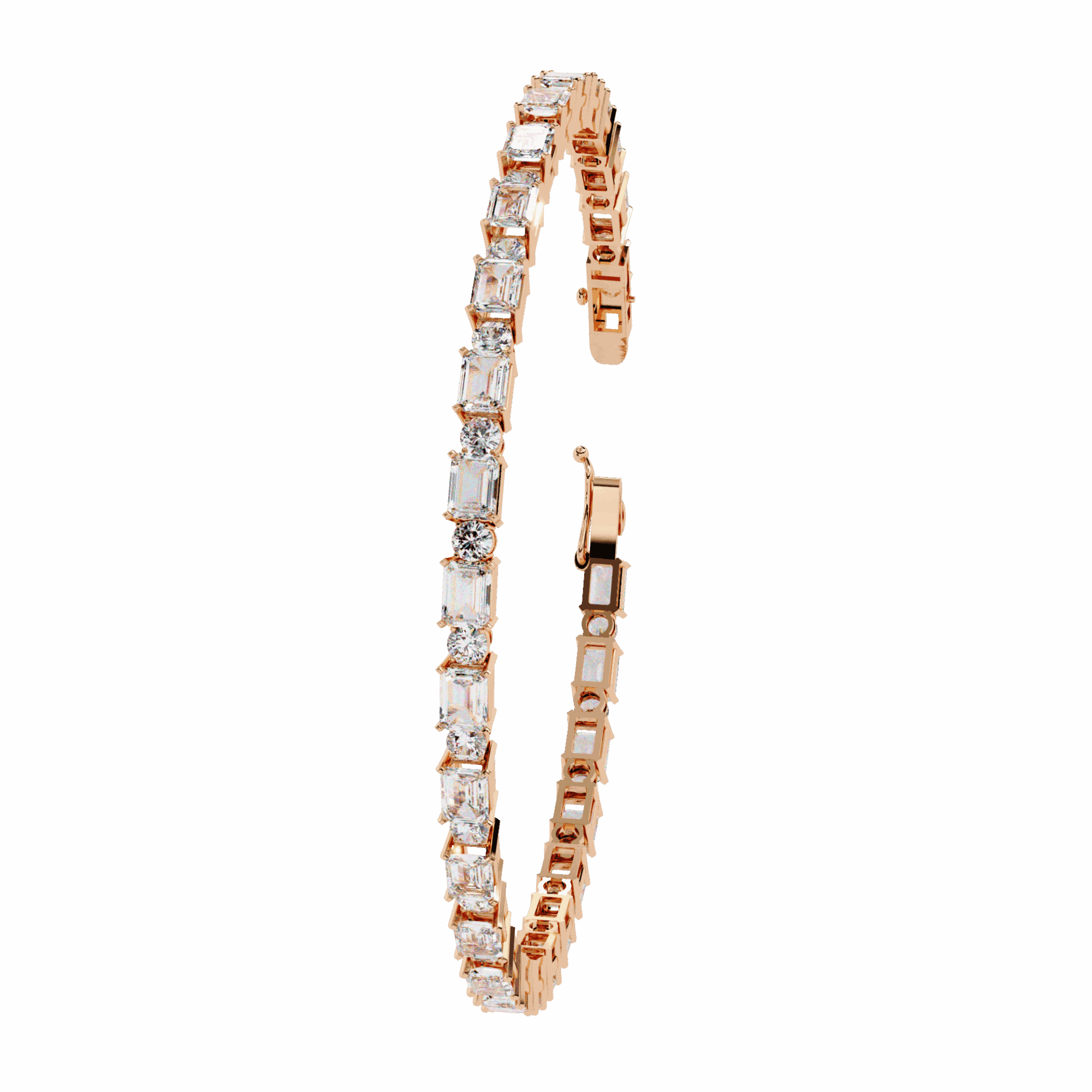 54 lab-grown diamonds – emerald cuts and round cuts alternating – creating a rhythm of different light patterns around the wrist. Emeralds flash. Rounds sparkle. Together, they mesmerize.