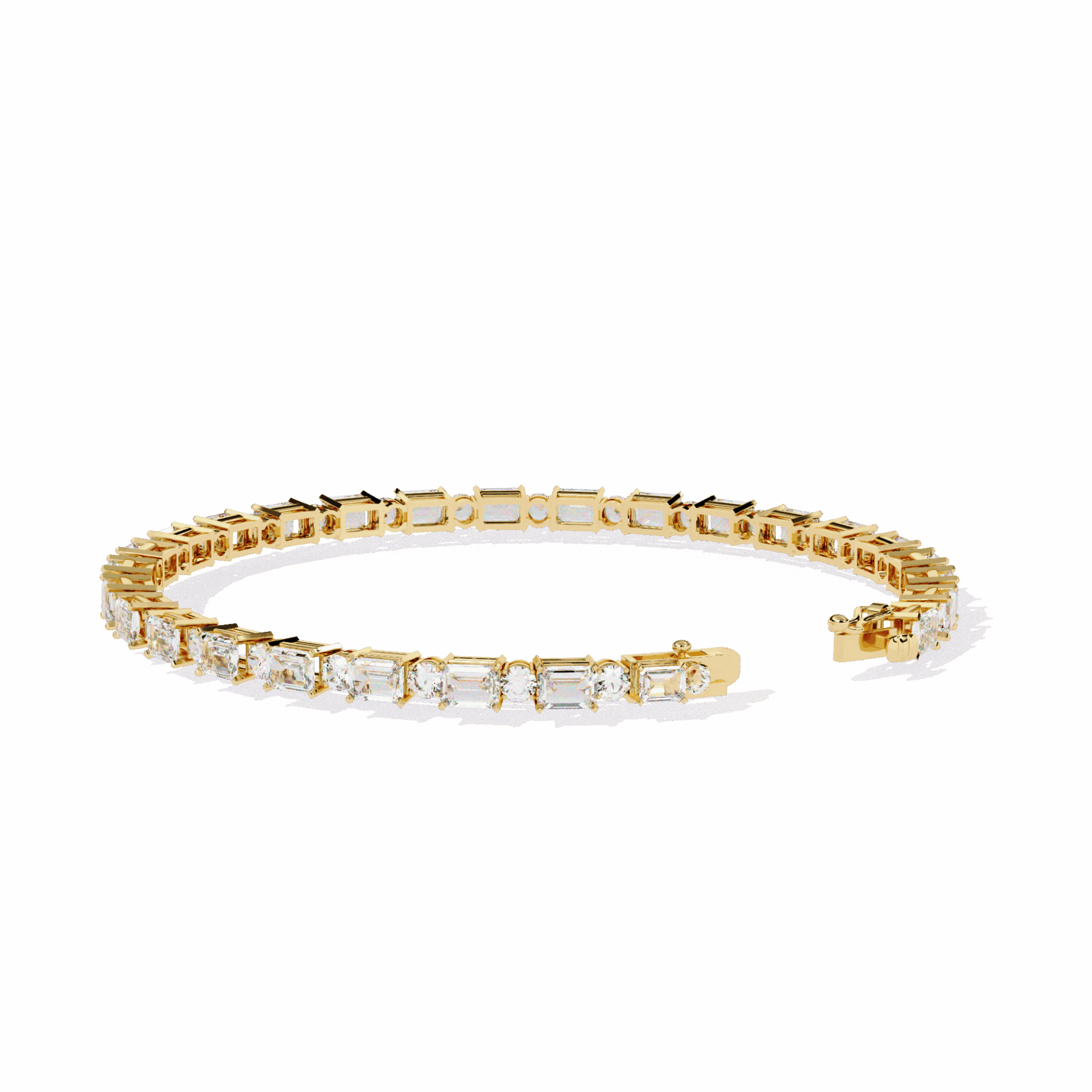 54 lab-grown diamonds - emerald cuts and round cuts alternating - creating a rhythm of different light patterns around the wrist. Emeralds flash. Rounds sparkle. Together, they mesmerize.