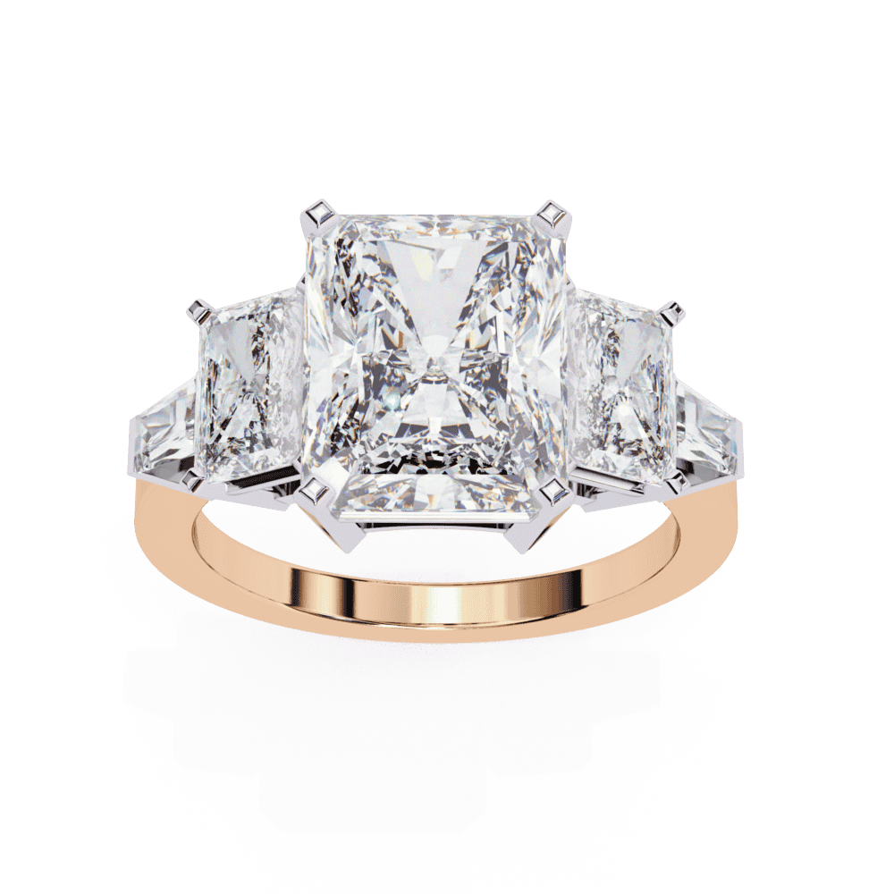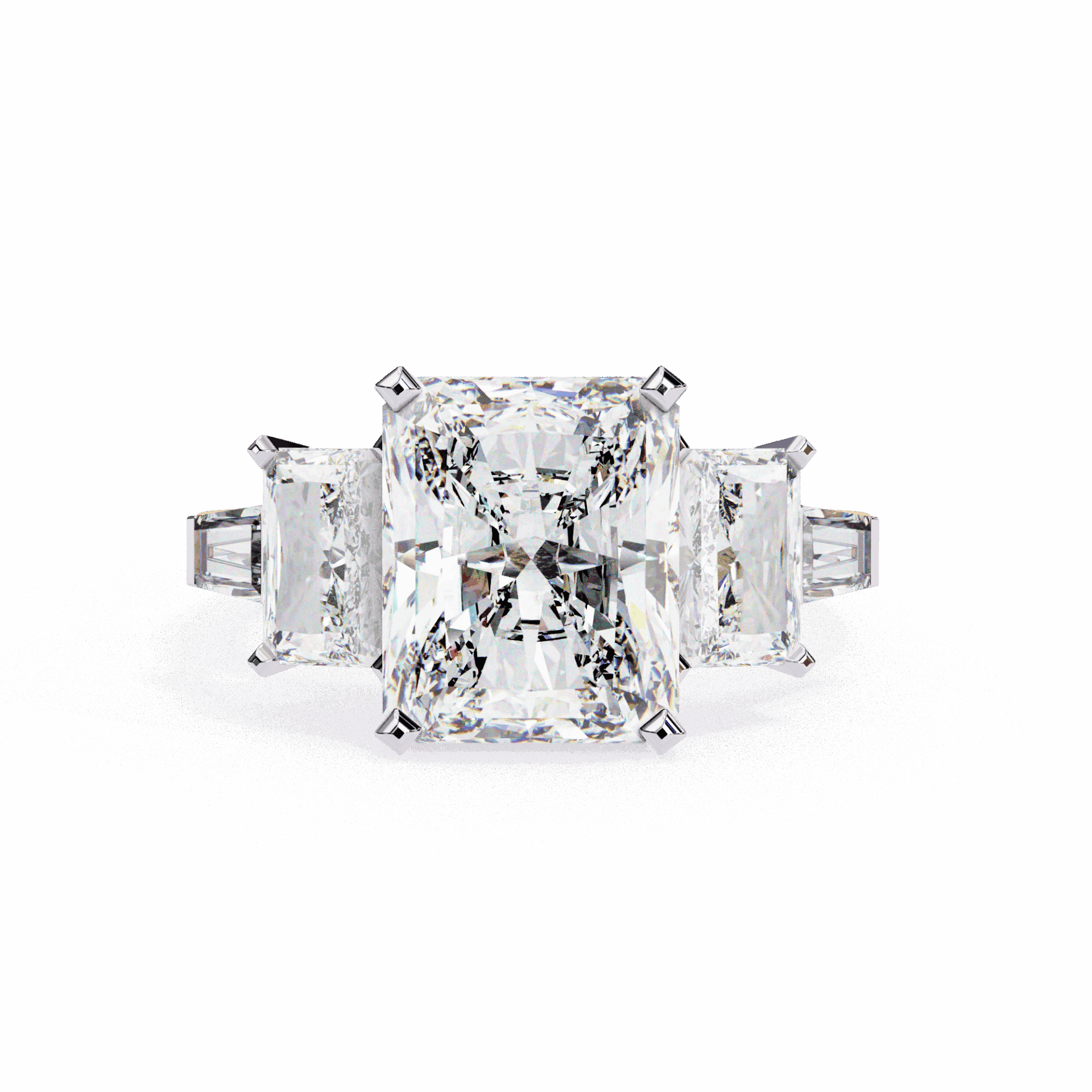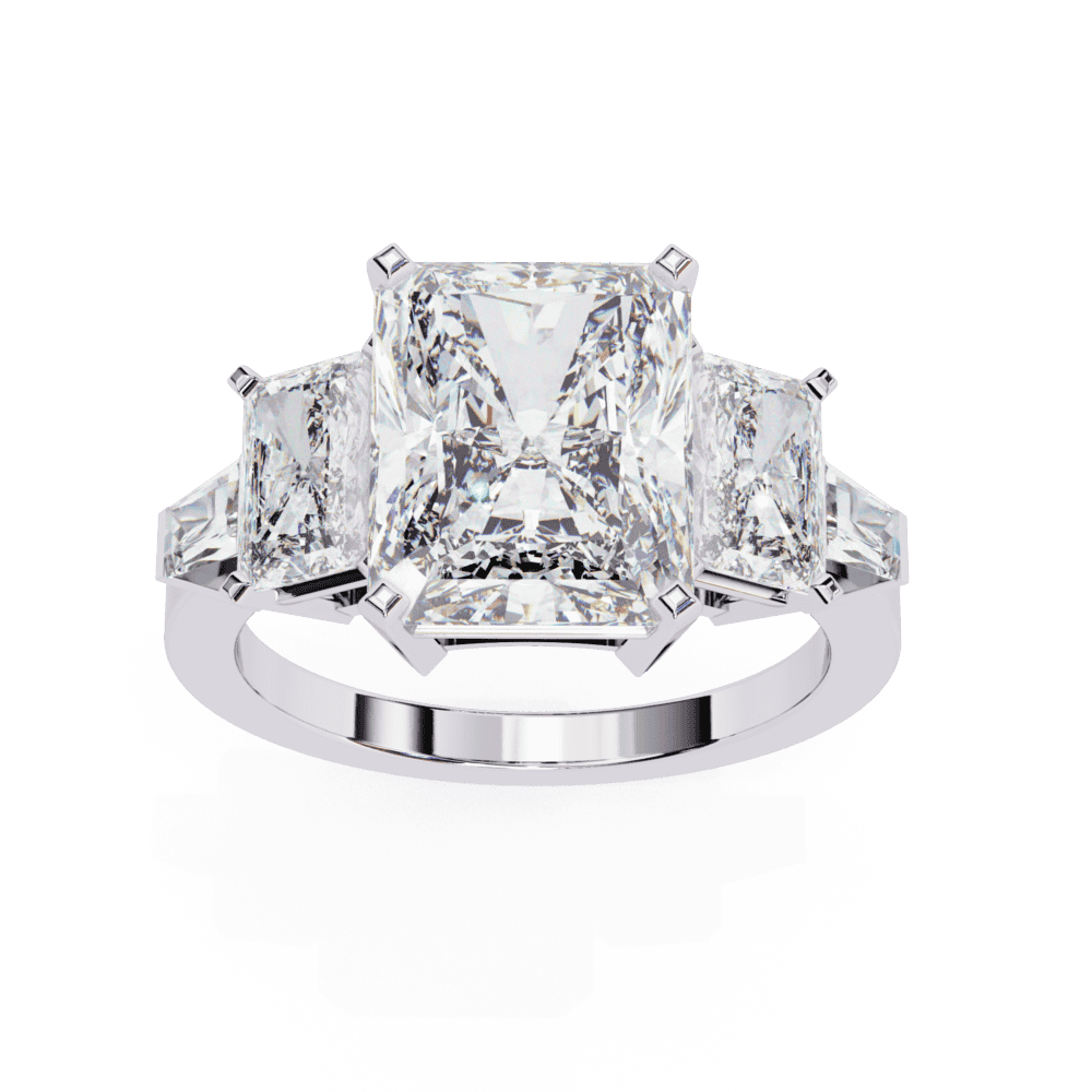 A radiant-cut lab-grown diamond with 5 accent diamonds totaling 6.61 carats in a three-stone setting. Extraordinary scale, extraordinary sparkle.