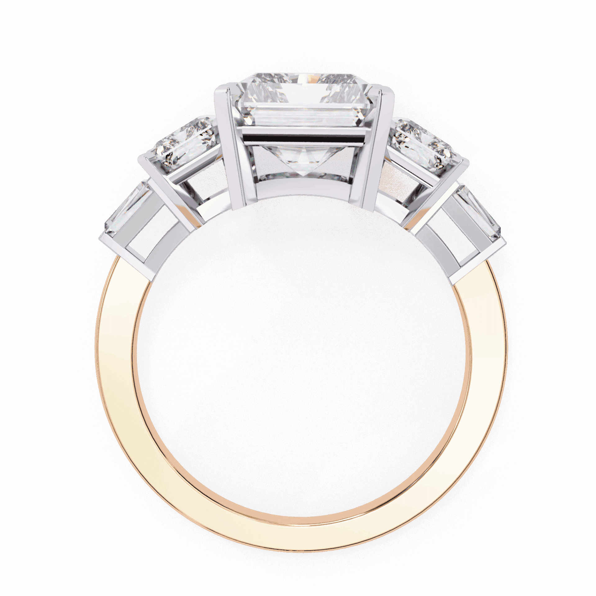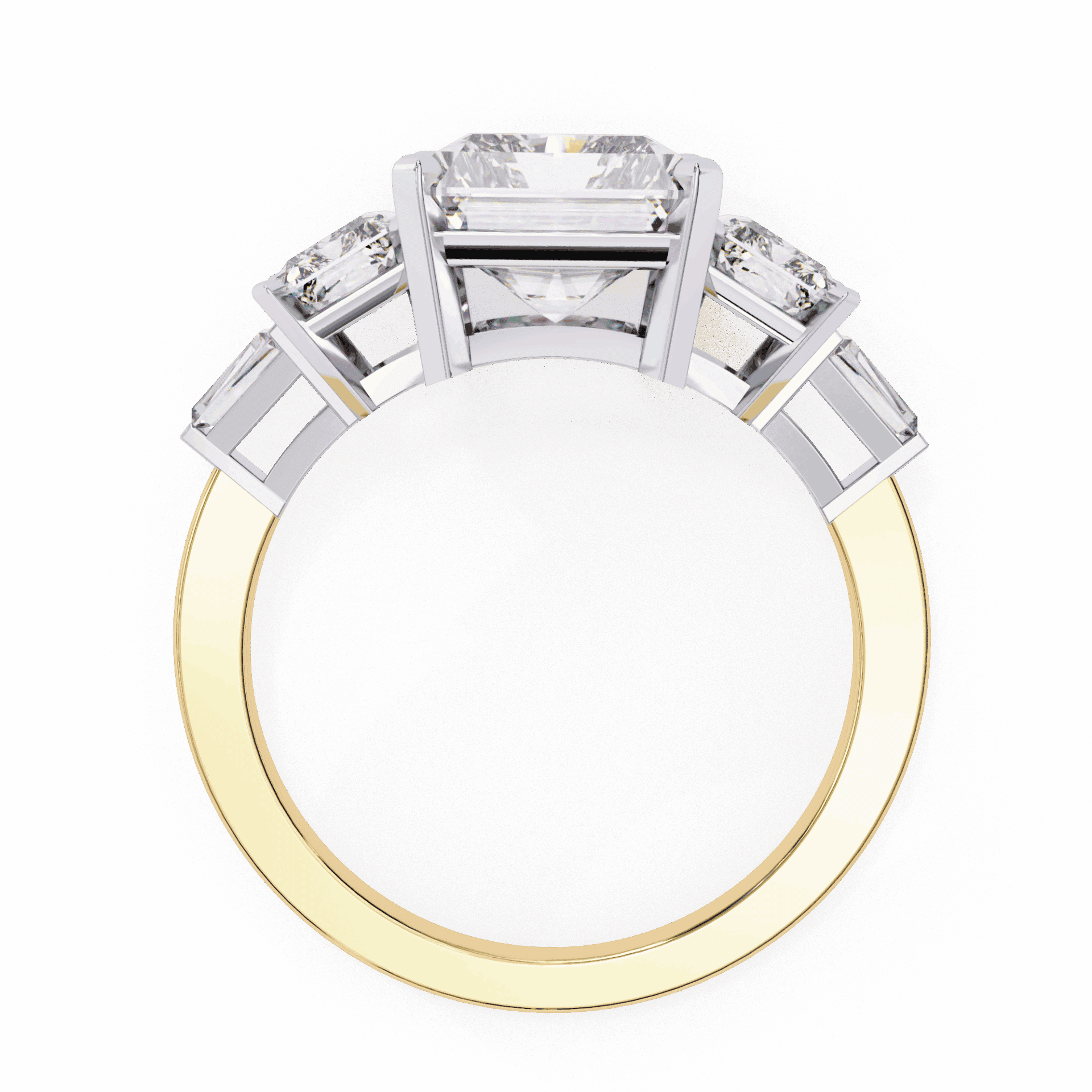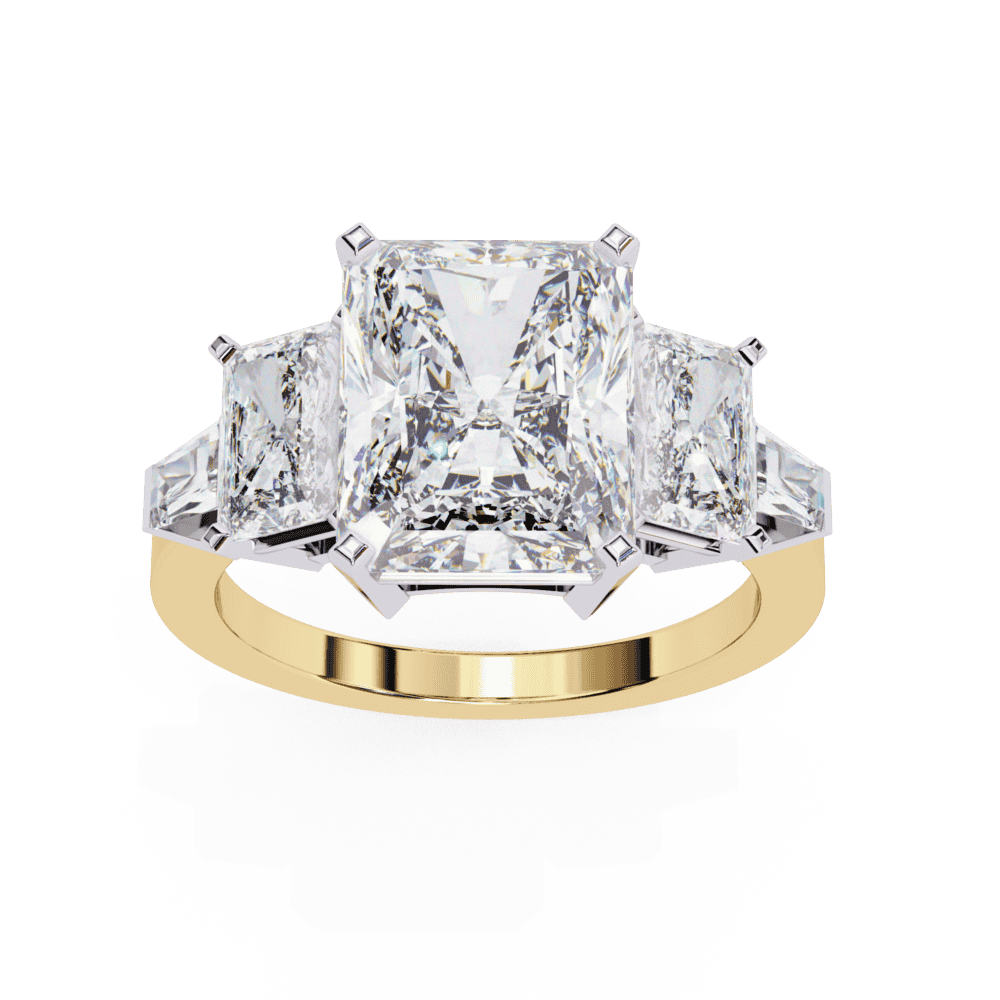 A radiant-cut lab-grown diamond with 5 accent diamonds totaling 6.61 carats in a three-stone setting. Extraordinary scale, extraordinary sparkle.